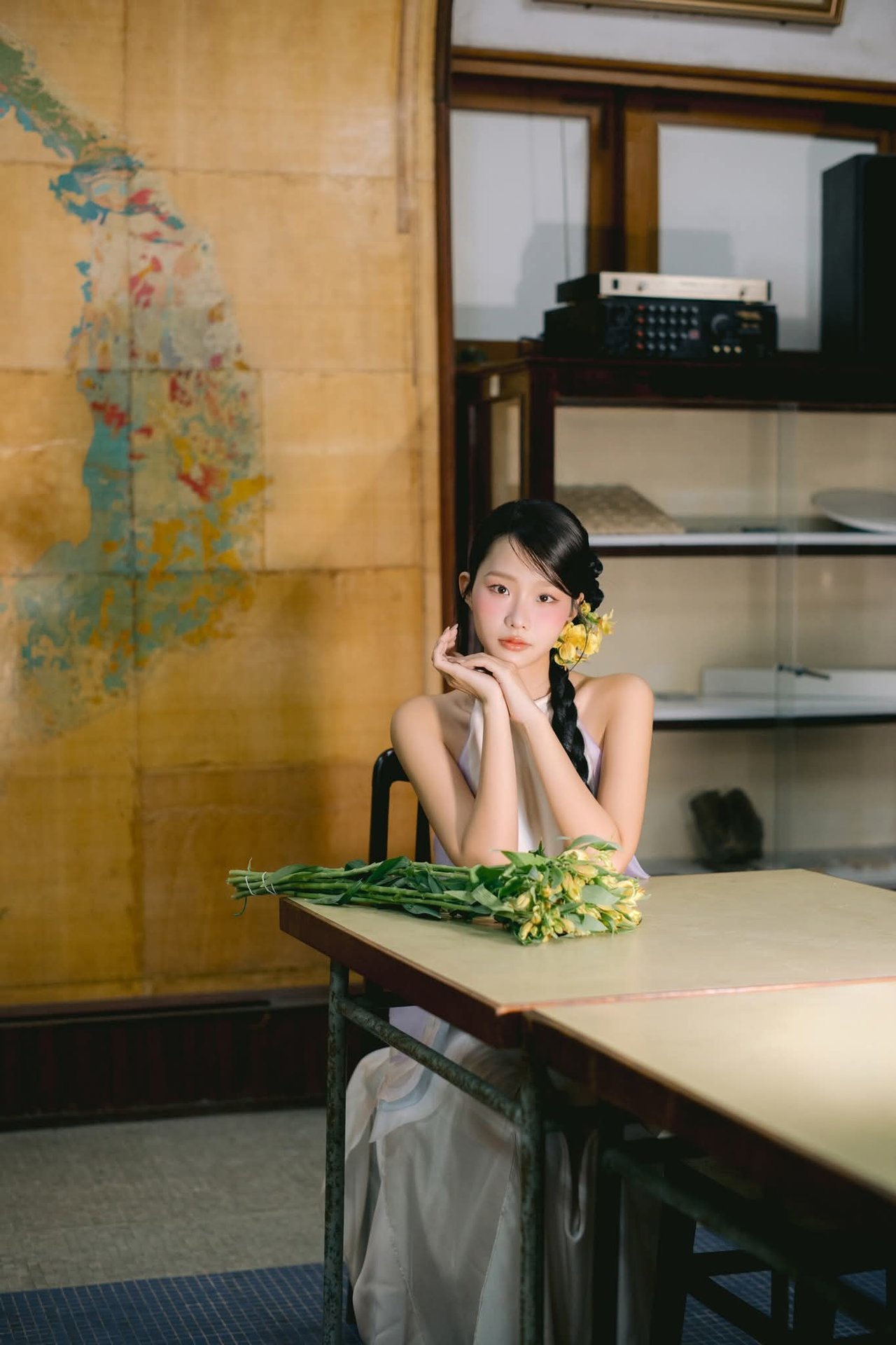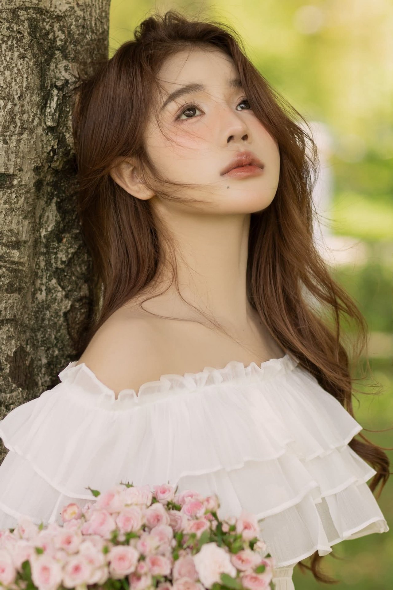 Image 1000019683 captures a gentle moment of a young woman in a pristine white dress. Her elegant beauty is accentuated by the soft off-shoulder design, exuding femininity and grace. Held in her arms is a fresh bouquet of small pink roses, adding a romantic touch to the scene. The lush green backdrop of the grass and verdant trees creates a fresh, peaceful natural setting. This image perfectly blends human charm with the refreshing essence of summer, evoking feelings of lightness, relaxation, and vitality. It serves as a wonderful inspiration for summer fashion style.Traditional Vietnamese Soul: Elegant Lady in Ao Dai with Pink Lotus - 10000199719