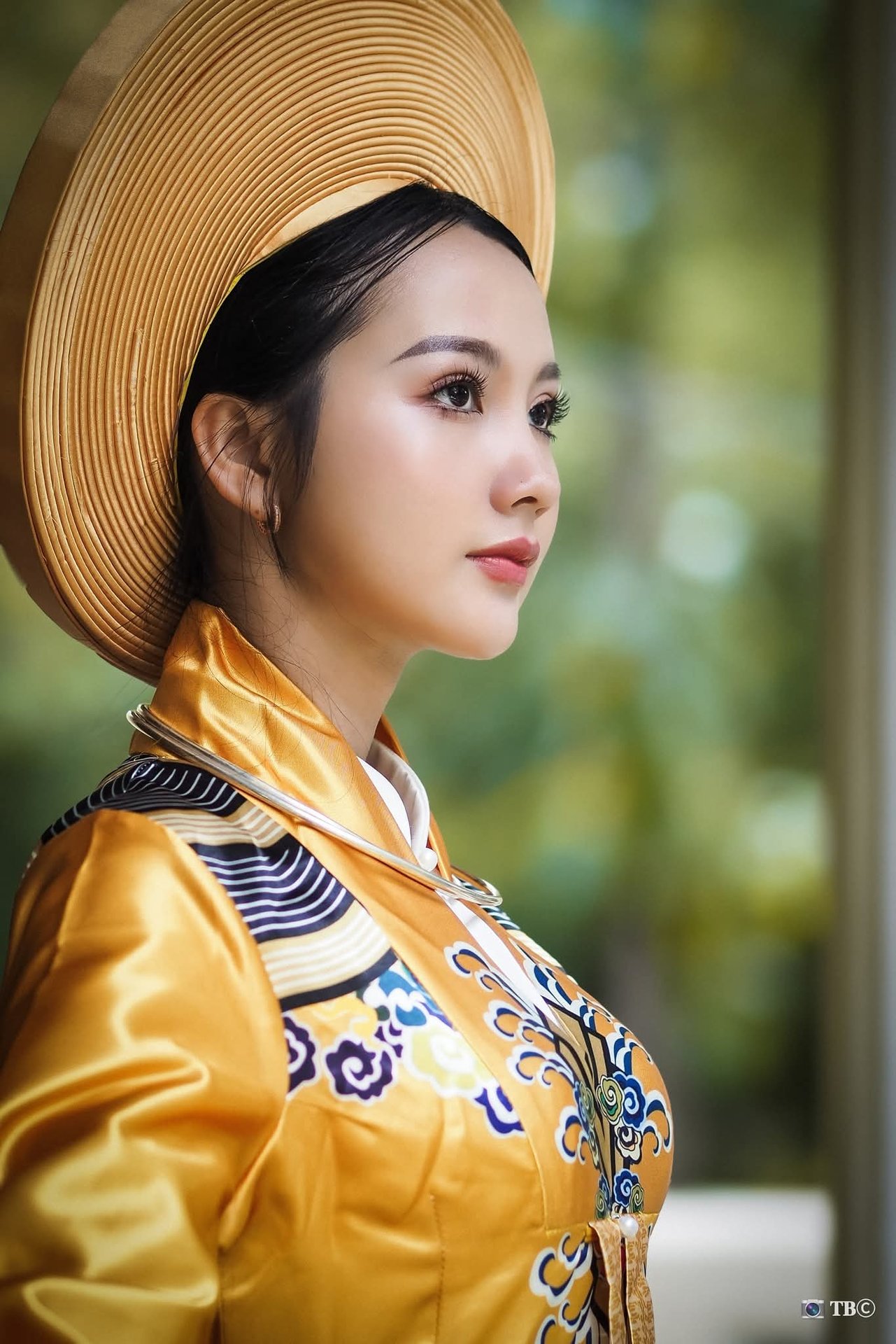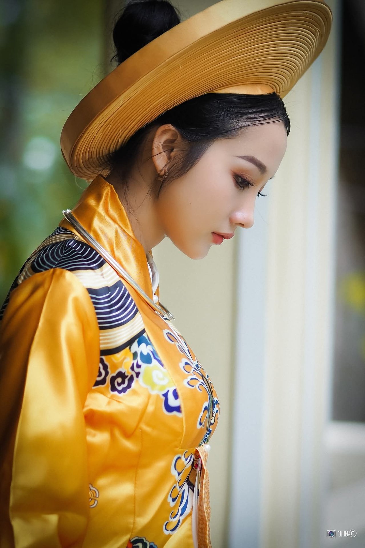 This captivating image beautifully captures the traditional grace of Vietnamese women through the portrayal of an elegant young lady in royal court attire She dons a vibrant golden Ao Nhat Binh adorned with exquisite embroidered patterns exuding the sophistication and nobility of ancient Vietnamese culture The traditional Non Quai Thao hat and the delicate hand fan further enhance her refined classic charm Her gaze is distant and contemplative as if conveying deep sentiments evoking memories of a golden era in history This is more than just a photograph it is a narrative of a rich cultural heritage a source of pride for the distinctive traditional costumes of the Vietnamese people This image will undoubtedly stir feelings of affection and appreciation for traditional values in everyoneStories