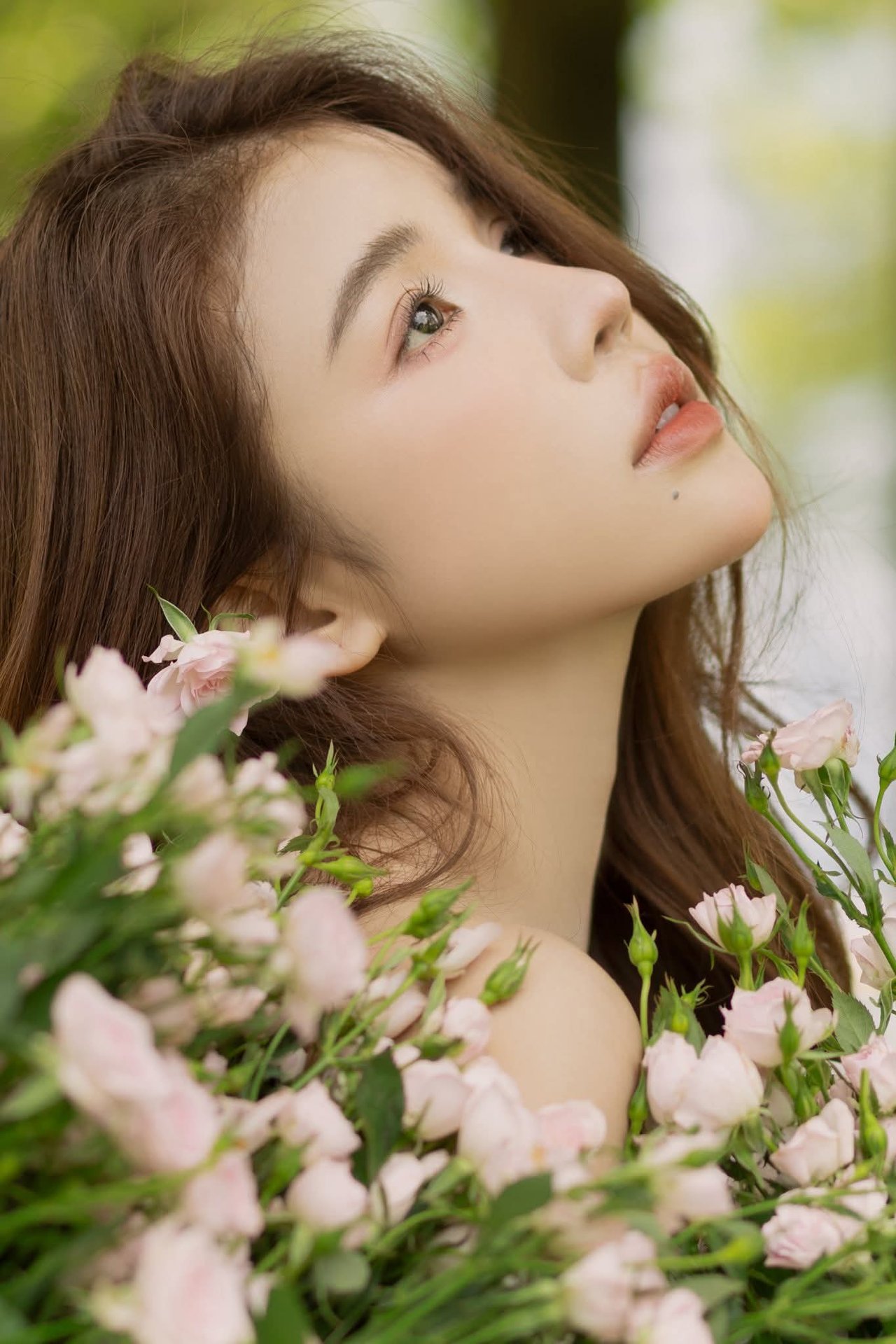 This captivating portrait features a young woman radiating serene beauty and delicate grace. Her long dark hair frames a pristine face, while her expressive eyes gaze directly at the viewer, drawing them into the moment. She is elegantly adorned in a pastel pink off-shoulder dress, its gentle ruffles and corset-style bodice accentuating her feminine silhouette with refined charm. Seated gracefully on a stone ledge, she holds a small pink flower, adding a touch of innocence and romance to the scene. Bathed in soft, natural light, the image highlights her flawless complexion and the ethereal quality of her presence. It evokes a feeling of peace, poetic beauty, and timeless elegance, making this more than just a photograph—it is an artistic portrayal of feminine allure.Gentle Beauty: Girl in Pristine White Dress with Pink Rose Bouquet Amidst Nature, Elegant Summer Style 1000019683