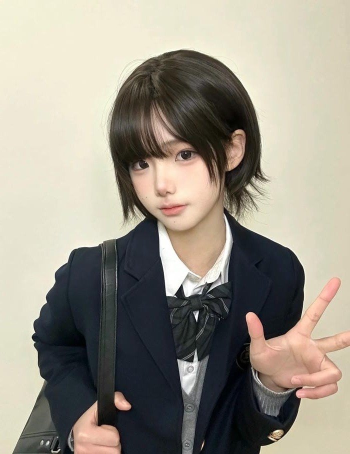 This photo captures the pure beauty and style of a young girl with a trendy Japanese bob hairstyle Her jet-black hair cut short at the chin with soft wispy bangs gently frames her delicate face enhancing harmonious features This bob style not only brings a strong personality but also blends cuteness and elegant charm The girl exudes an impressive modern beauty inspiring those who love minimalist yet striking styles This is perfect proof that the Japanese bob hairstyle can be flexibly transformed suitable for many different styles helping women confidently show off their beauty