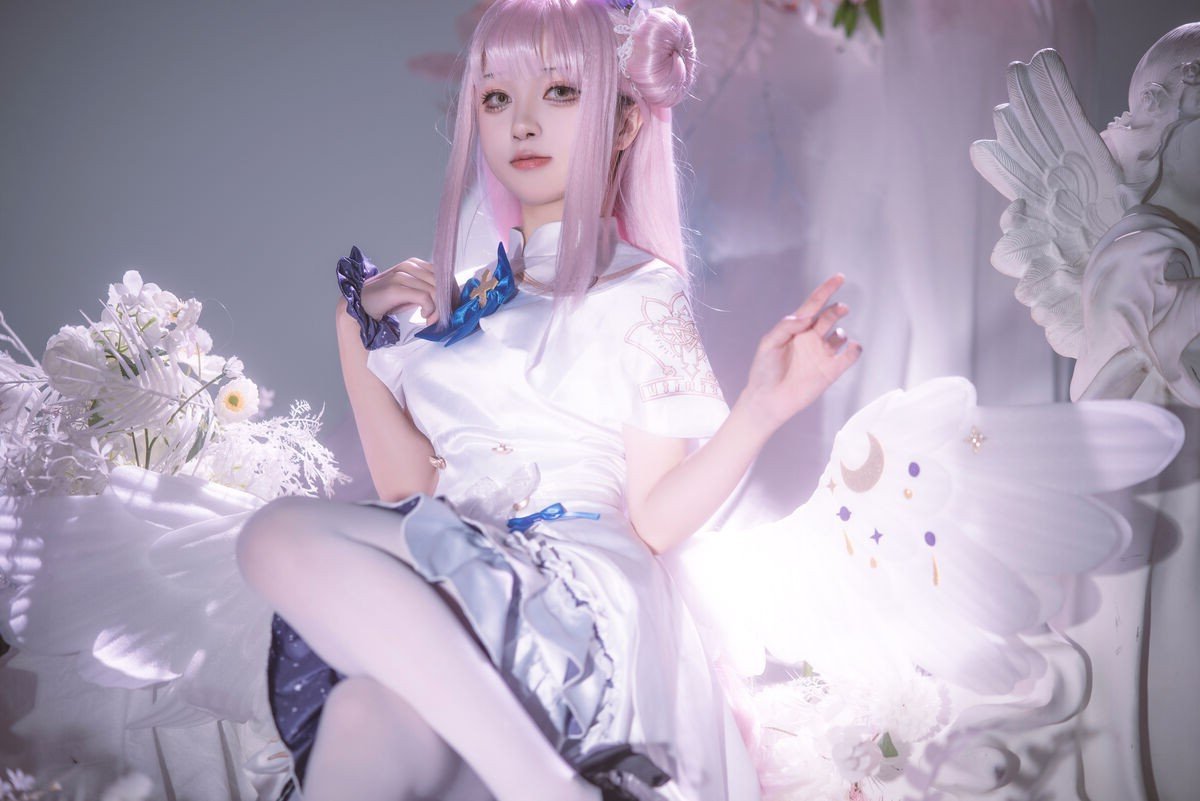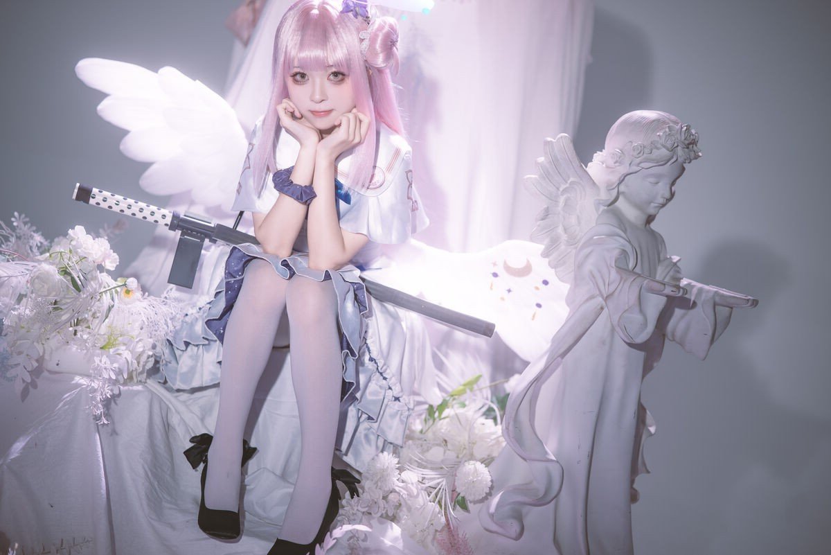 In this captivating image Coser@矢量鱼 masterfully embodies Mika Misono from the popular game Blue Archive. With her flowing pastel pink hair styled into elegant twin buns and a delicate halo she vividly brings to life the character’s ethereal and gentle beauty. The pristine white costume adorned with subtle blue accents creates a harmonious and enchanting overall look. Her clear eyes and soft smile further highlight Mika's angelic aura. This cosplay not only showcases meticulous attention to detail in the outfit and makeup but also successfully conveys the character's spirit offering a mesmerizing and emotional visual experience for viewers. It truly stands as a high-caliber cosplay artistry piece reflecting the model's passion and talent.