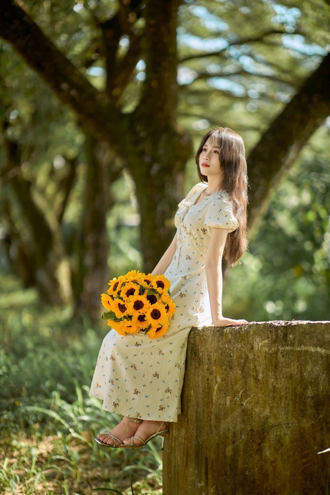 This stunning photograph captures a charming woman radiating grace and a bright smile illuminating the fresh natural landscape. Dressed in a delicate floral dress she elegantly holds a vibrant bouquet of yellow sunflowers symbols of optimism and joy. Gentle sunlight filters through the leaves creating a poetic backdrop that enhances the person's natural beauty. The image of this beautiful woman blending seamlessly with nature evokes a sense of peace and radiates positive energy showcasing the harmonious connection between humans and their surroundings. It is a truly captivating and lively moment.Vietnamese Ao Dai Beauty: Graceful Girl with Flowers.