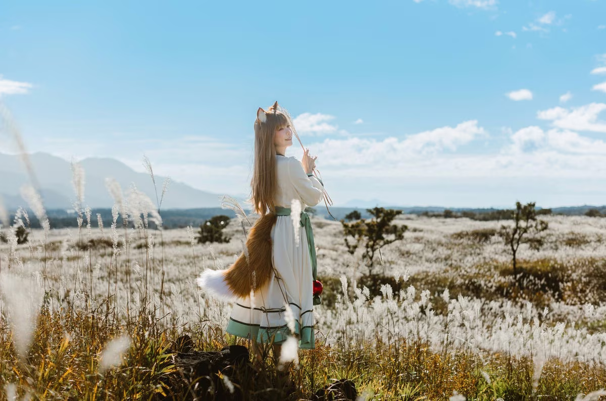 In this captivating image Coser Ely_eee ElyEE tử brings to life an enchanting embodiment of the 'Wolf and Breeze' theme. She is gracefully posed amidst a field of golden pampas grass where a gentle breeze softly whispers creating a serene and picturesque backdrop. Her pristine white gown with subtle green accents beautifully complements her elegant appearance while the distinct animal ears evoke the beloved character Holo from Spice and Wolf. Soft sunlight bathes the scene highlighting every intricate detail of the cosplay and the expansive natural landscape. This photograph is a perfect blend of artistic cosplay and raw natural beauty conveying a sense of tranquility and ethereal charm.