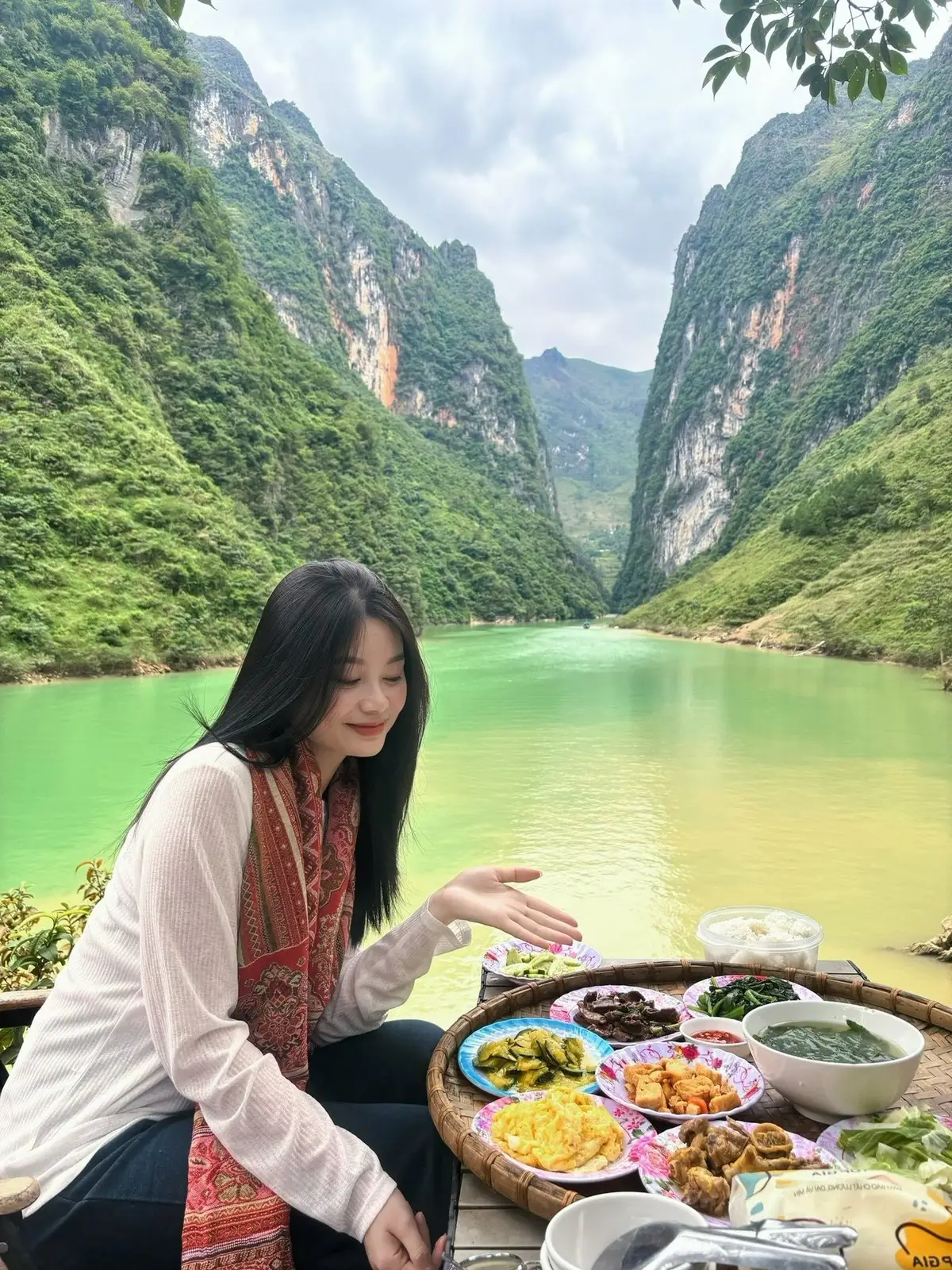 This stunning photograph captures a traveler standing firmly on a cliff edge, marveling at the majestic panorama of Tu San Gorge. The Nho Que River appears like a beautiful emerald silk ribbon, gently winding through the deep mountain pass, creating a magnificent natural landscape characteristic of Ha Giang. Standing amidst the vast expanse of the stone plateau, visitors can feel the tranquility and wild beauty of the towering rocky scenery. This is an unforgettable travel experience, combining outdoor activities with unique landscape exploration, inviting everyone to admire and immerse themselves in the grand nature of Vietnam's northernmost region.#NhoQueRiver #TuSanGorge #HaGiangTravel #VietnamLandscape #ExploreVietnam