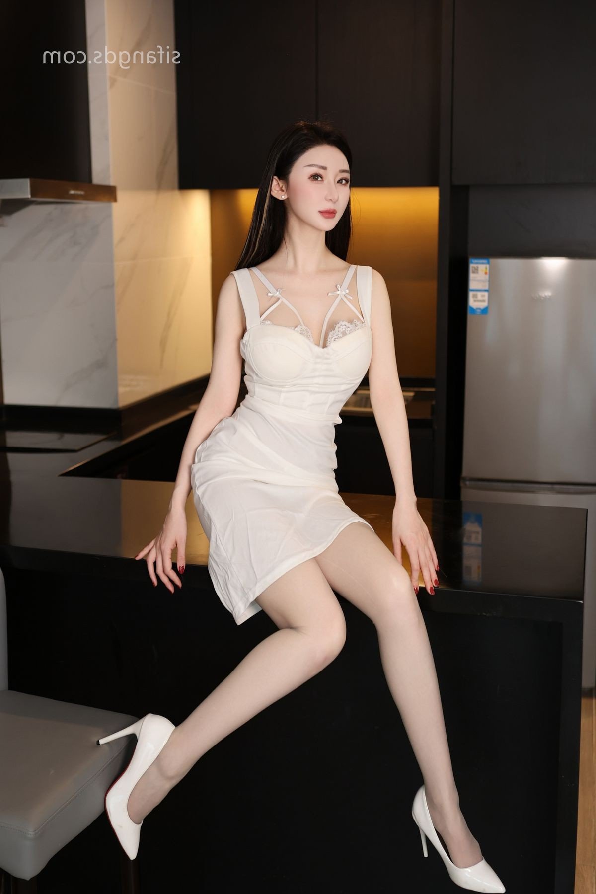 This captivating image showcases Tian Xi Bai a talented and alluring model in a stylized office environment Dressed in a form-fitting white bodysuit that accentuates her figure paired with elegant white high heels she strikes a bold and confident pose beneath a desk Tian Xi Bai's exquisite beauty shines through her captivating gaze and professional demeanor exuding a unique blend of charm and power This photoshoot is more than just a visual display it is an exploration of modern femininity and allure within a professional setting embodying a creative Office Lady concept This exclusive collection promises an intriguing and unforgettable visual experience