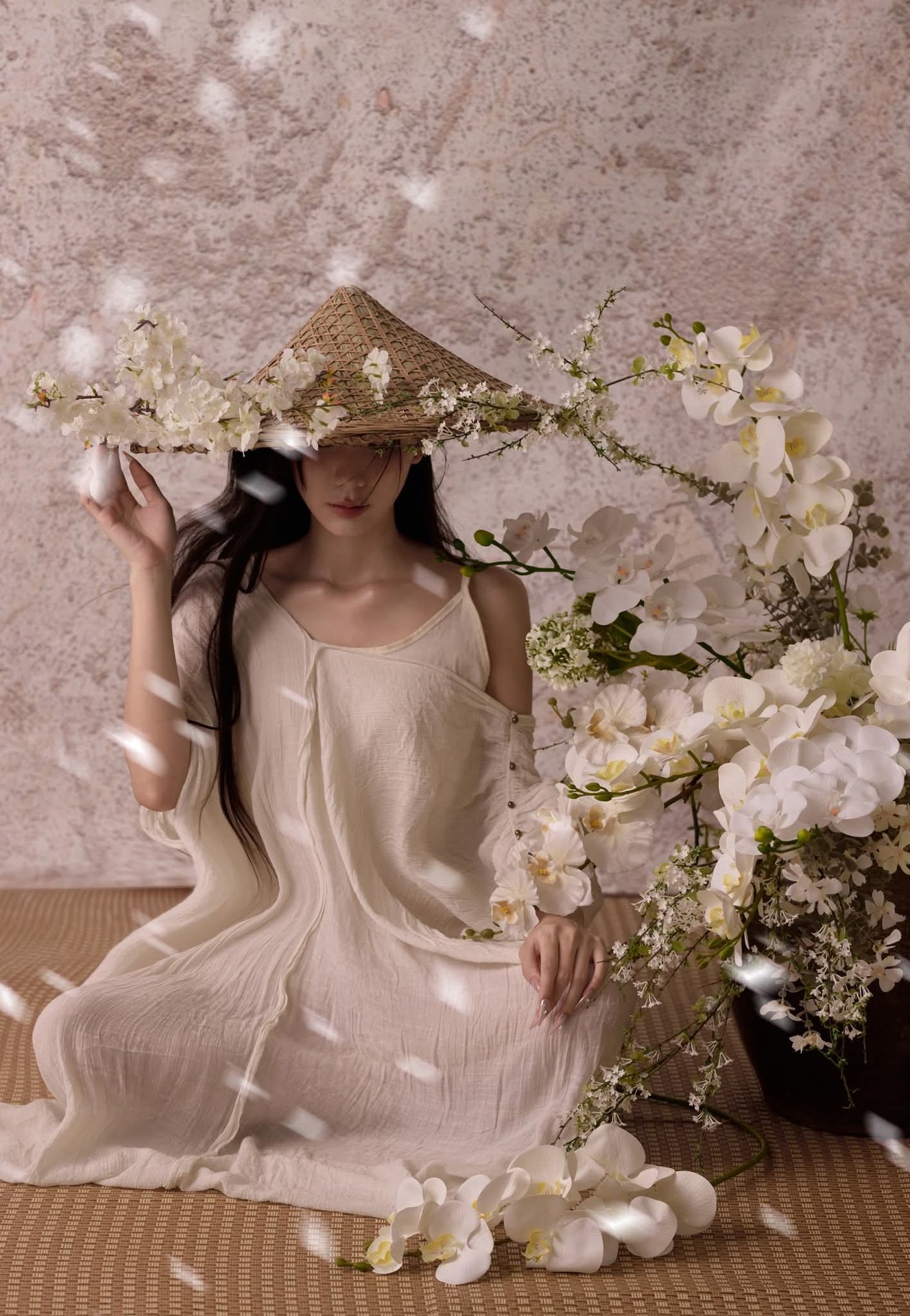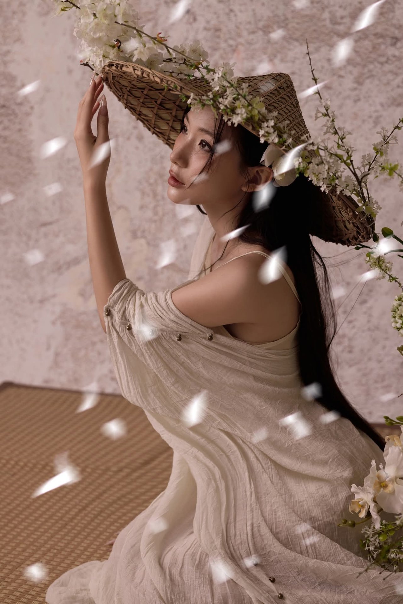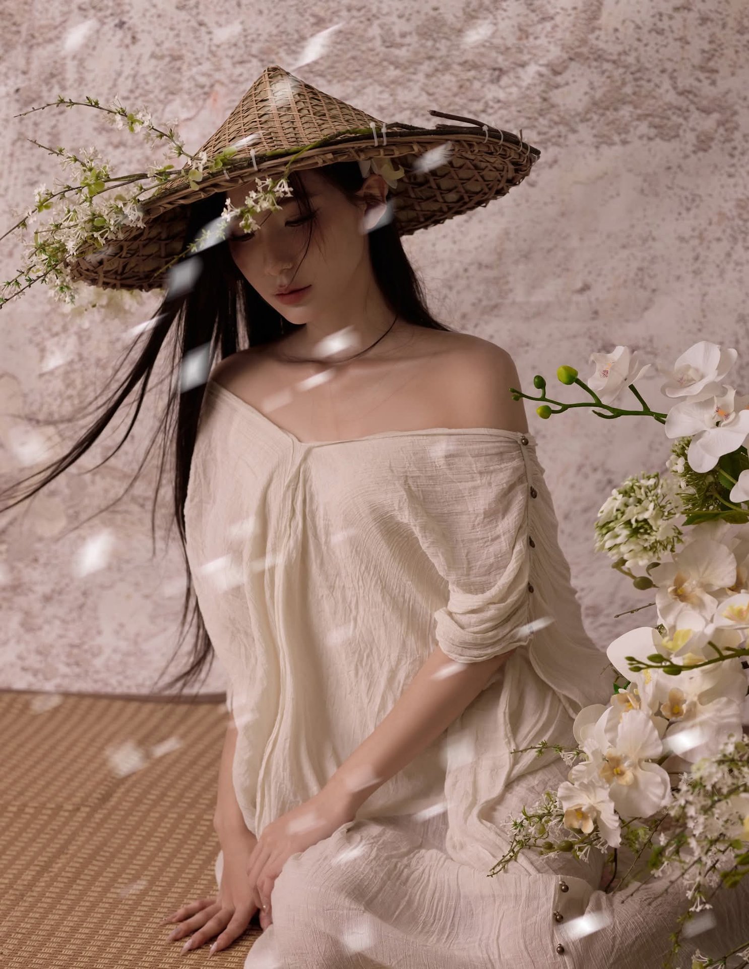 Discover the serene and ethereal beauty of an Asian woman gracefully posed amidst a tranquil setting. Her long, dark hair cascades softly, framing a contemplative and delicate expression. She wears a pristine white off-the-shoulder dress, highlighting her elegant posture and a touch of modern femininity. A rustic straw hat, beautifully adorned with fresh white blossoms, adds an organic charm and unique fashion statement. Subtle white petals floating around enhance the pure and dreamy atmosphere. This artistic portrait transcends a mere image, embodying a blend of traditional aesthetics and contemporary style. It evokes profound feelings of peace, grace, and timeless elegance, offering a captivating visual experience.Ethereal Girl in Bathtub with White Flower: Serene Beauty & Relaxing Moment 1000018799.jpg