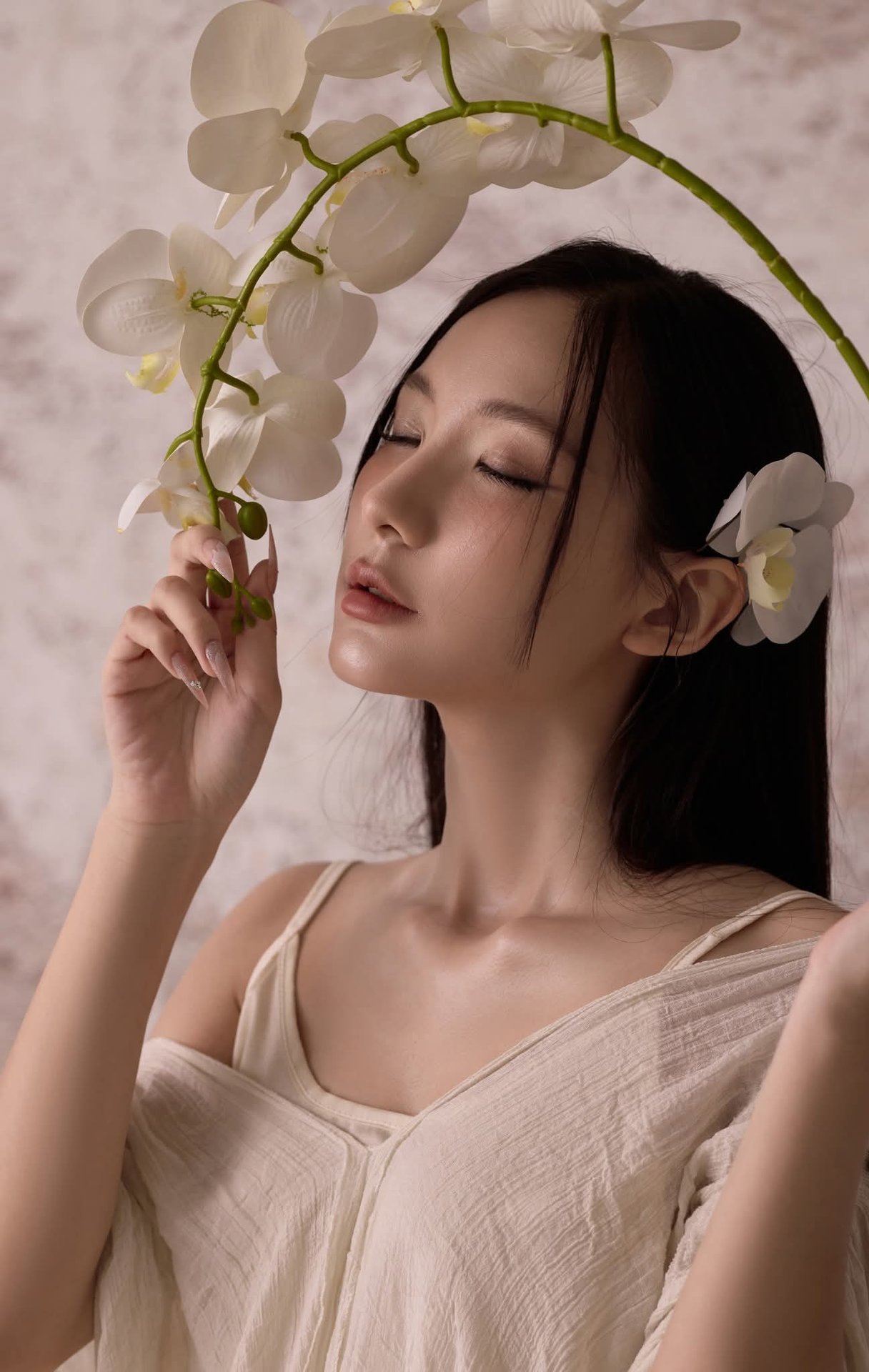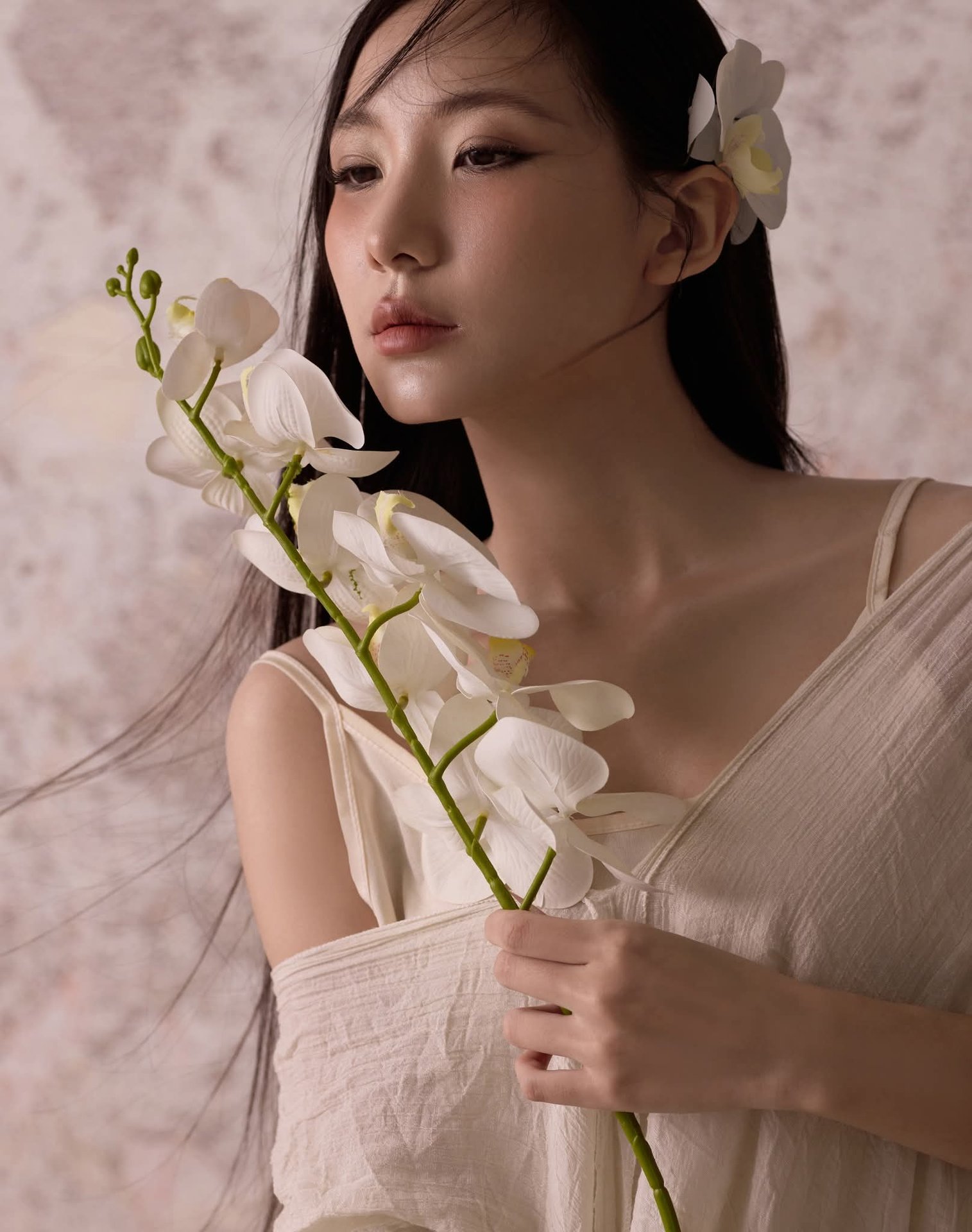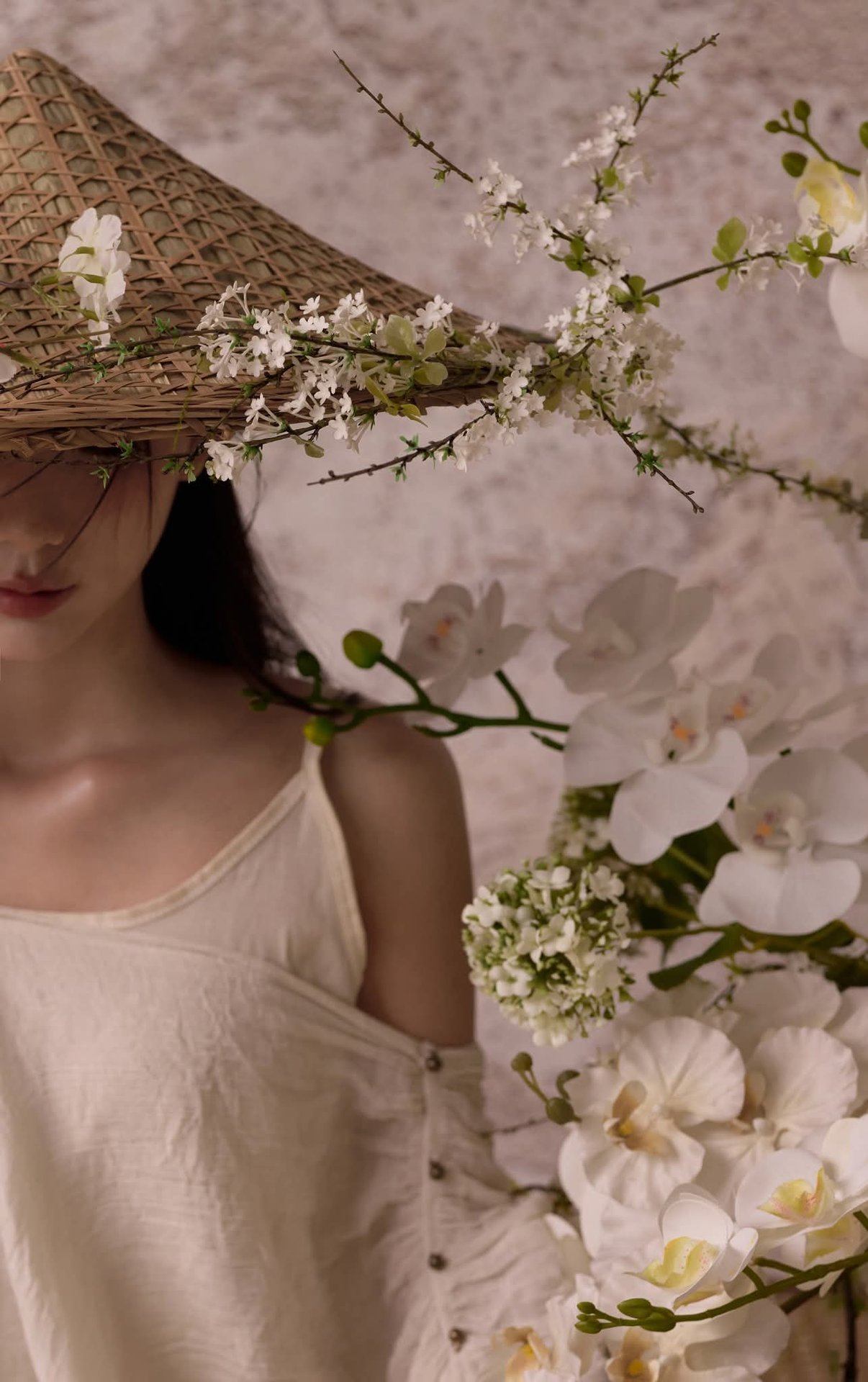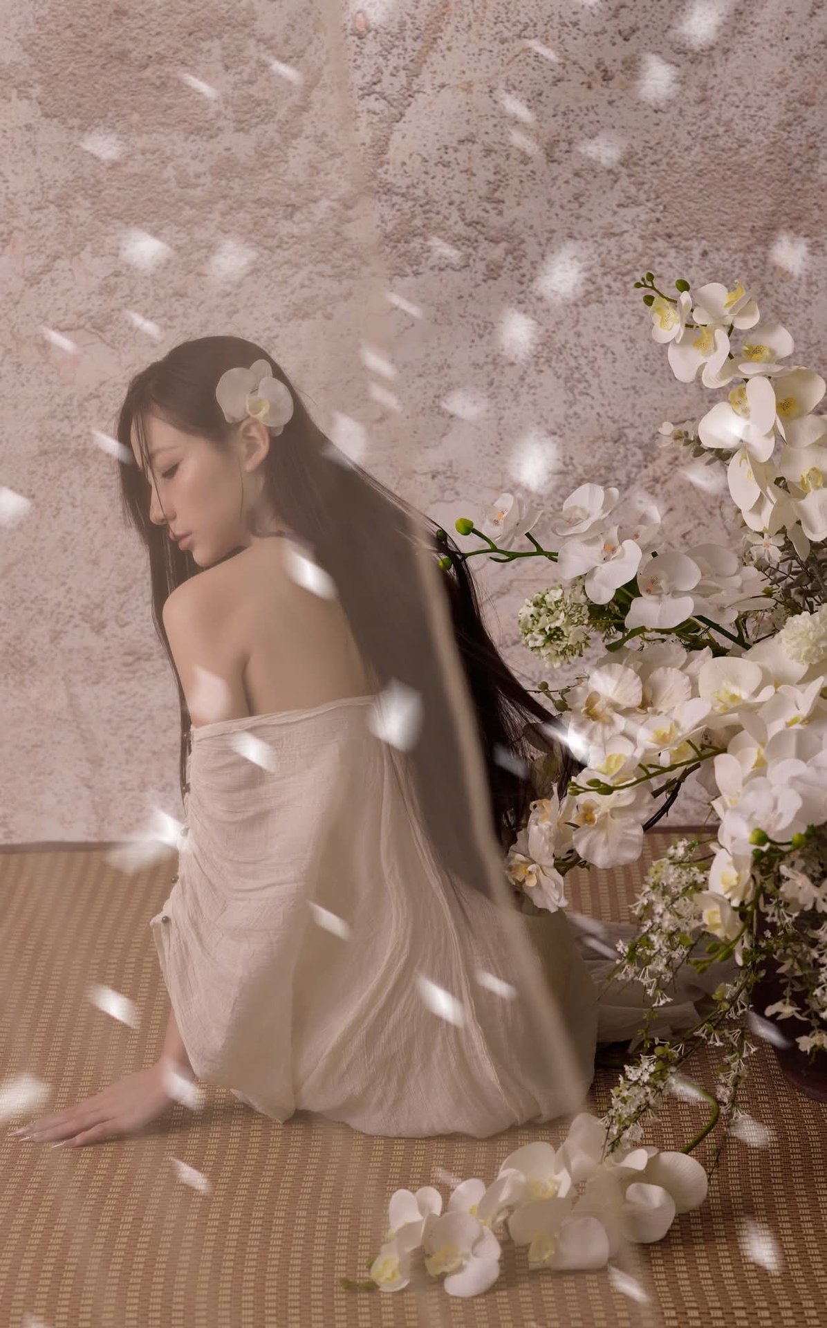 Discover the serene and ethereal beauty of an Asian woman gracefully posed amidst a tranquil setting. Her long, dark hair cascades softly, framing a contemplative and delicate expression. She wears a pristine white off-the-shoulder dress, highlighting her elegant posture and a touch of modern femininity. A rustic straw hat, beautifully adorned with fresh white blossoms, adds an organic charm and unique fashion statement. Subtle white petals floating around enhance the pure and dreamy atmosphere. This artistic portrait transcends a mere image, embodying a blend of traditional aesthetics and contemporary style. It evokes profound feelings of peace, grace, and timeless elegance, offering a captivating visual experience.Ethereal Girl in Bathtub with White Flower: Serene Beauty & Relaxing Moment 1000018799.jpg