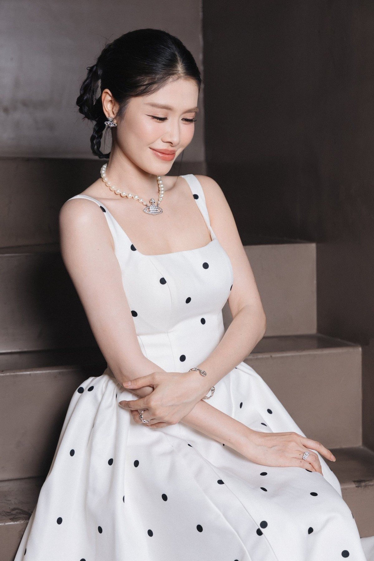 Thuy Anh Radiantly Showcases Mother-of-3 Beauty in Elegant Polka Dot Dress.