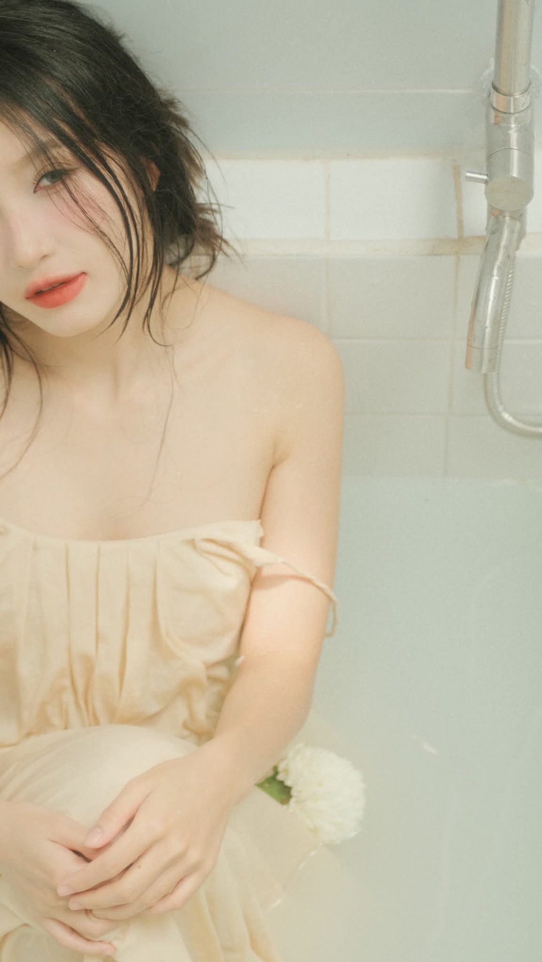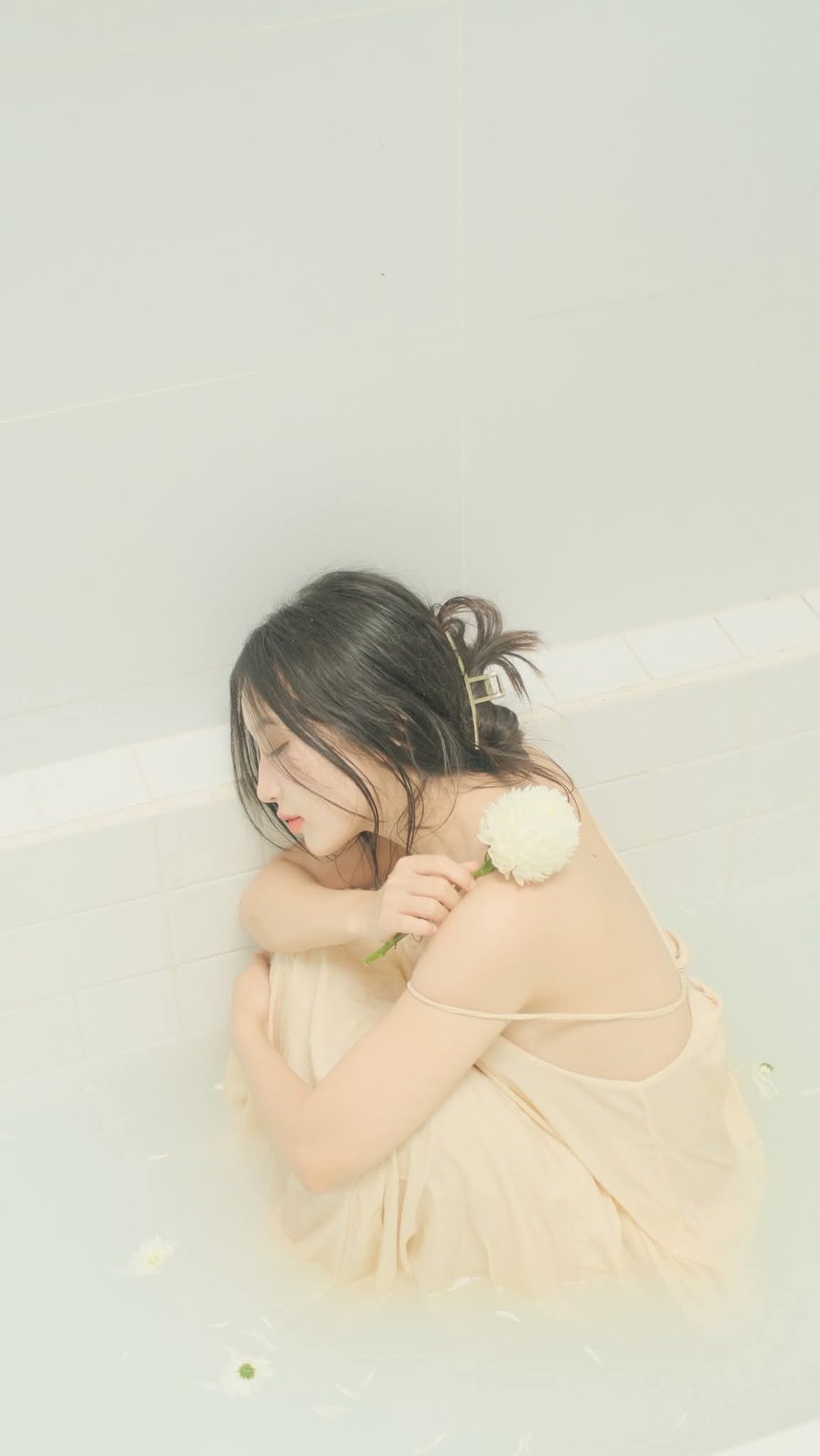 This captivating image portrays a young woman immersed in a bathtub, exuding a serene and dreamy beauty. Her hair is loosely tied, and she wears a delicate flowing pastel dress, enhancing her ethereal charm. Gently holding a pristine white flower, she embodies purity and grace. Soft lighting bathes the scene, creating an atmosphere of ultimate relaxation where time seems to stand still. More than just a photograph, it's an artistic expression conveying profound emotions of inner peace and refined femininity. The image evokes a sense of lightness, elegance, and subtle mystery, inviting viewers to appreciate the harmony between human and nature in a tranquil moment.