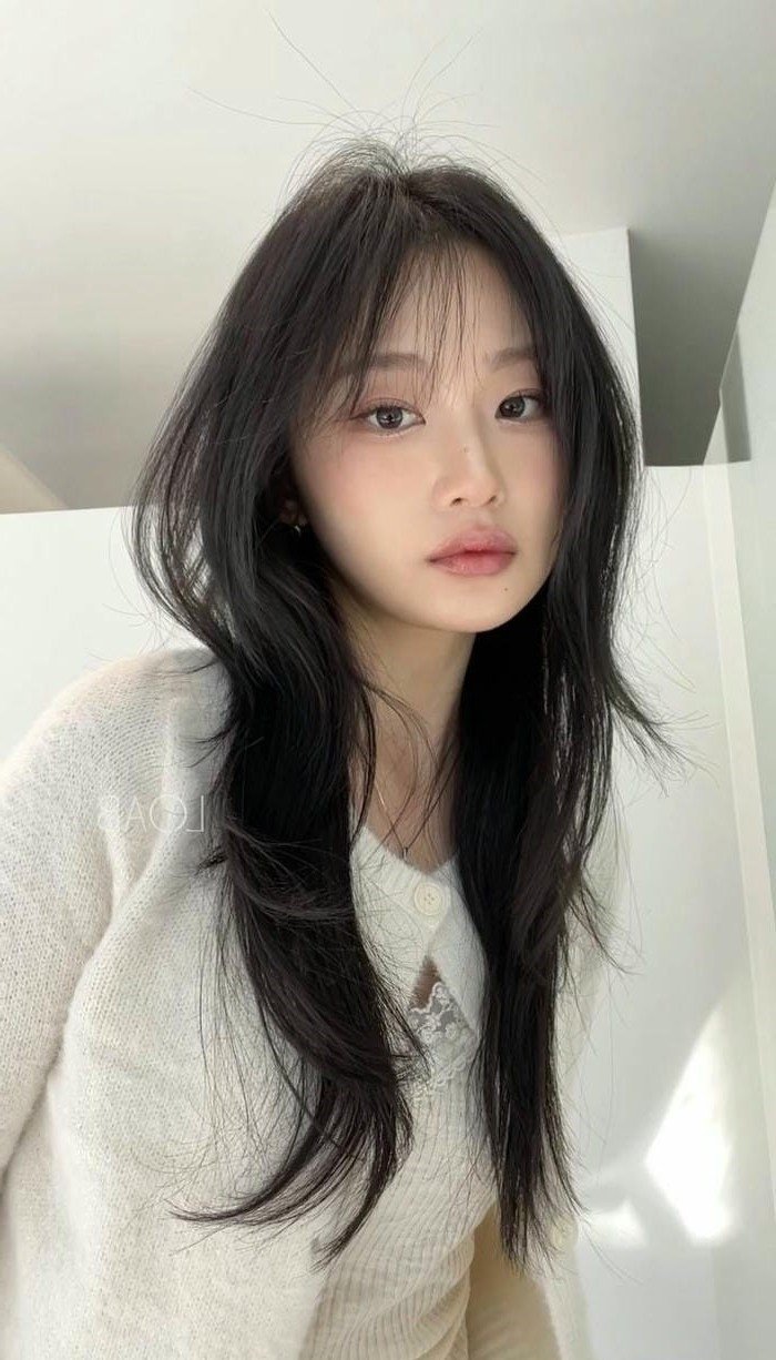 This image captures the gentle beauty of a young woman featuring the distinctive French bangs hairstyle. Her dark hair is styled softly with delicate wisps gracefully framing her refined face cleverly concealing any imperfections while highlighting her natural harmonious features. The French bangs give the girl an elegant and incredibly captivating appearance. This is a perfect choice for anyone seeking a fresh radiant look while maintaining natural femininity. Whether for an active or gentle style this hairstyle easily transforms to enhance each individual's unique beauty. A beautiful hairstyle helps the girl feel more confident and shine.