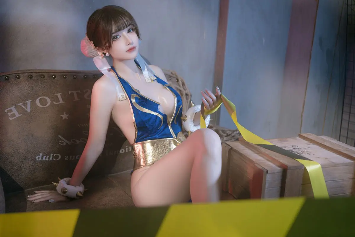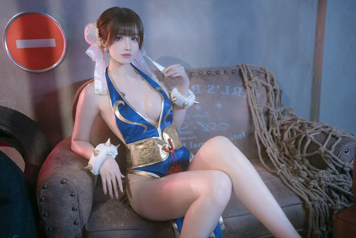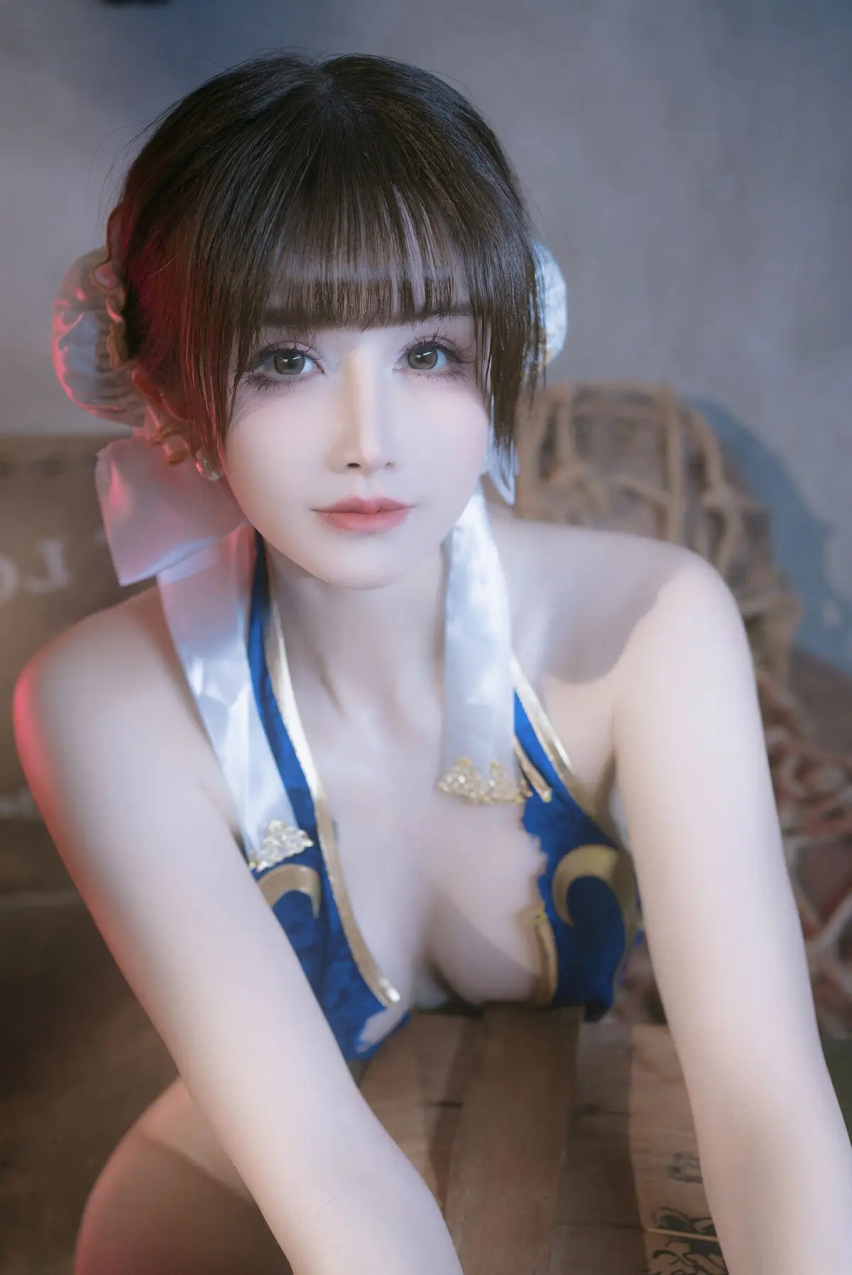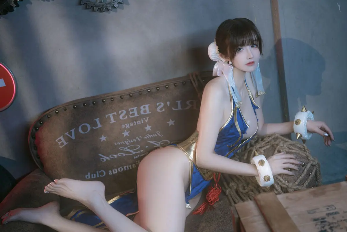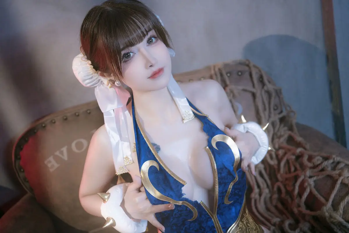 This captivating image features Coser Lu Ba Sui embodying Chun-Li, the iconic fighter from Street Fighter. Dressed in her signature blue qipao, meticulously detailed, she exudes a powerful yet undeniably alluring presence. Her confident recline and captivating gaze hint at a mysterious and inviting allure. The portrayal not only perfectly recreates Chun-Li's legendary look but also evokes the essence of a special 'combat training' session, where strength and elegance merge seamlessly. Viewers will be drawn in by Lu Ba Sui's professional demeanor and meticulous dedication, discovering a fresh and enticing dimension of this classic gaming character.#Coser #LuBaSui #ChunLiCosplay #StreetFighter #MartialArtsBeauty #GamingCosplay