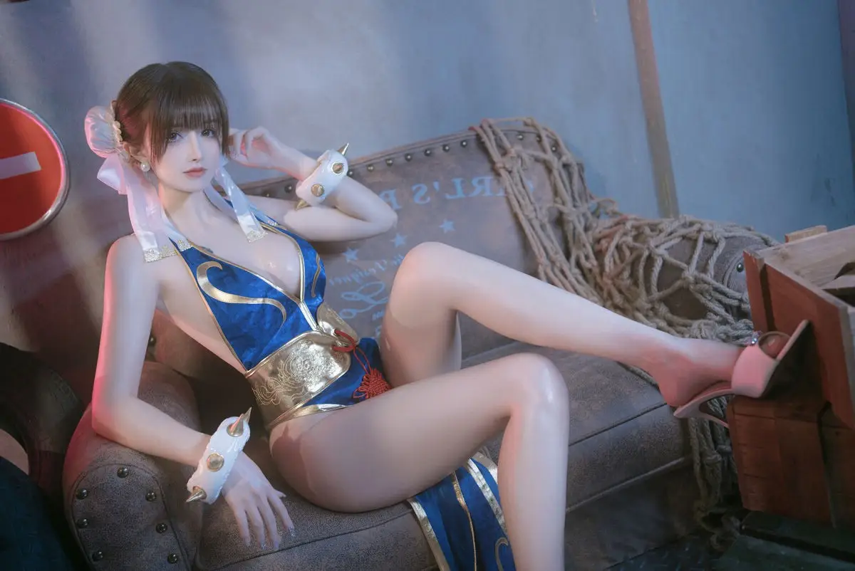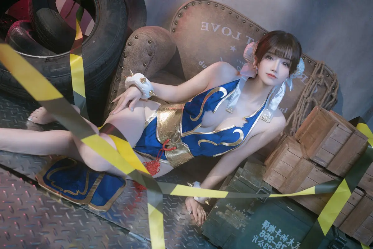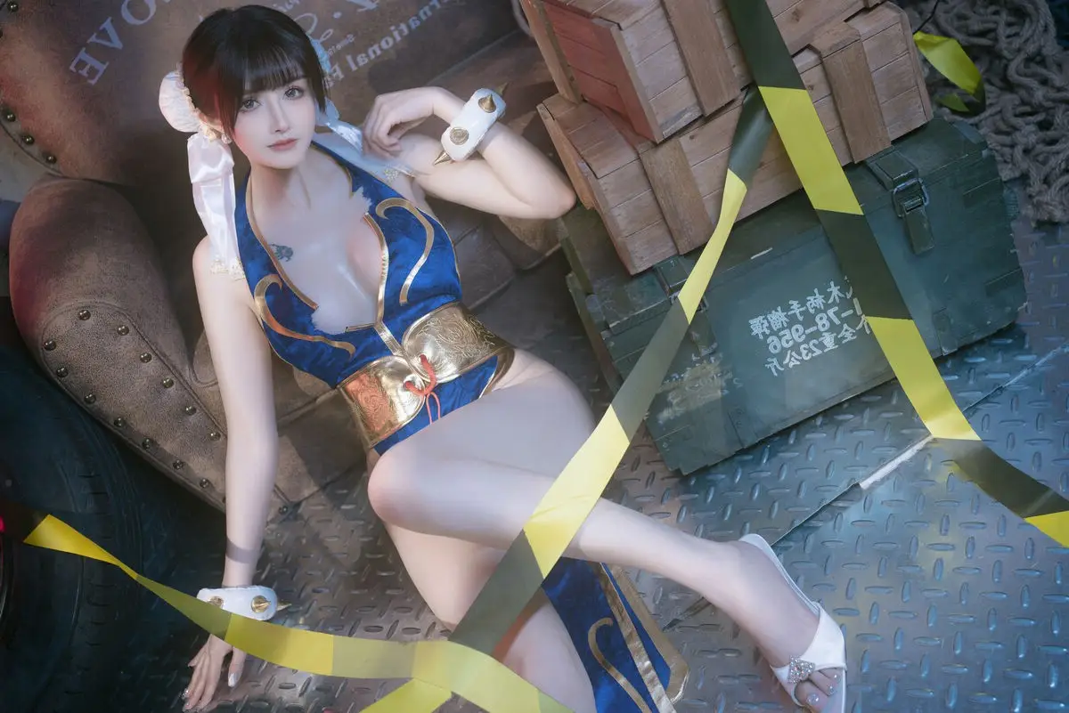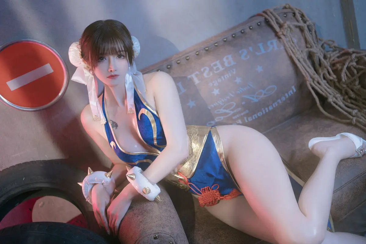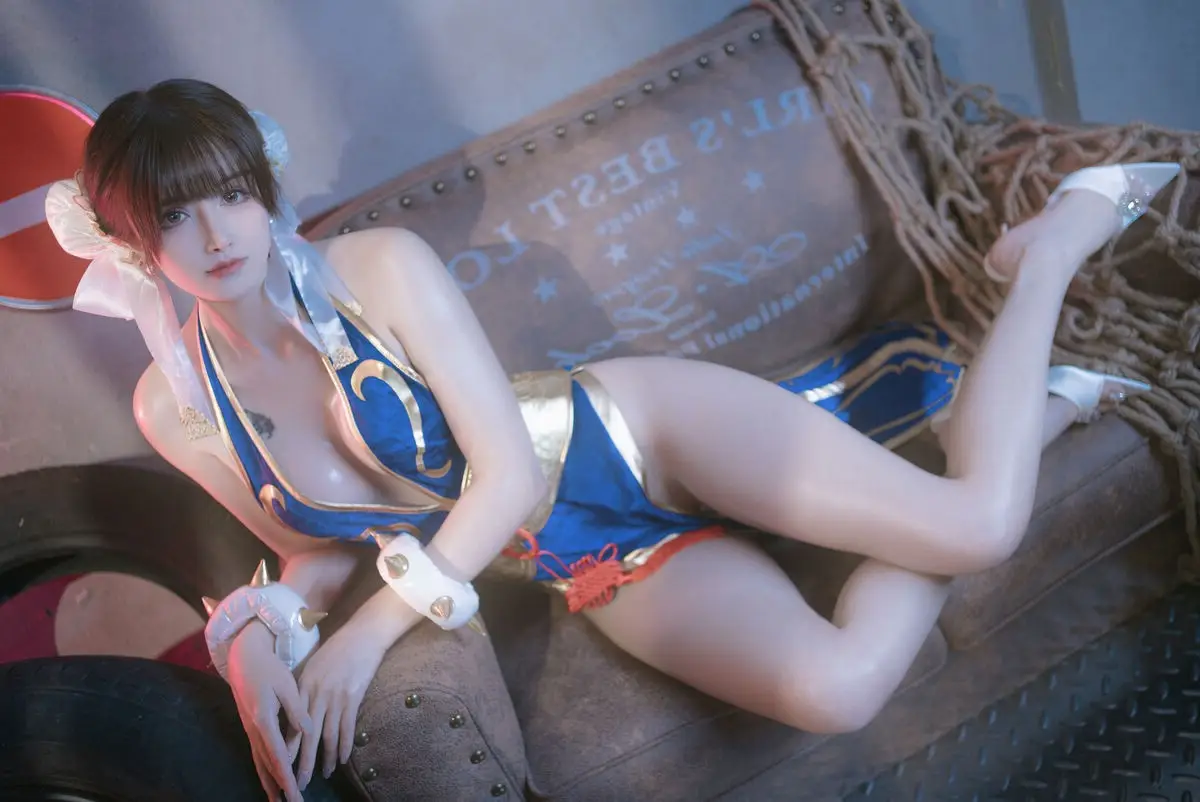 This captivating image features Coser Lu Ba Sui embodying Chun-Li, the iconic fighter from Street Fighter. Dressed in her signature blue qipao, meticulously detailed, she exudes a powerful yet undeniably alluring presence. Her confident recline and captivating gaze hint at a mysterious and inviting allure. The portrayal not only perfectly recreates Chun-Li's legendary look but also evokes the essence of a special 'combat training' session, where strength and elegance merge seamlessly. Viewers will be drawn in by Lu Ba Sui's professional demeanor and meticulous dedication, discovering a fresh and enticing dimension of this classic gaming character.#Coser #LuBaSui #ChunLiCosplay #StreetFighter #MartialArtsBeauty #GamingCosplay