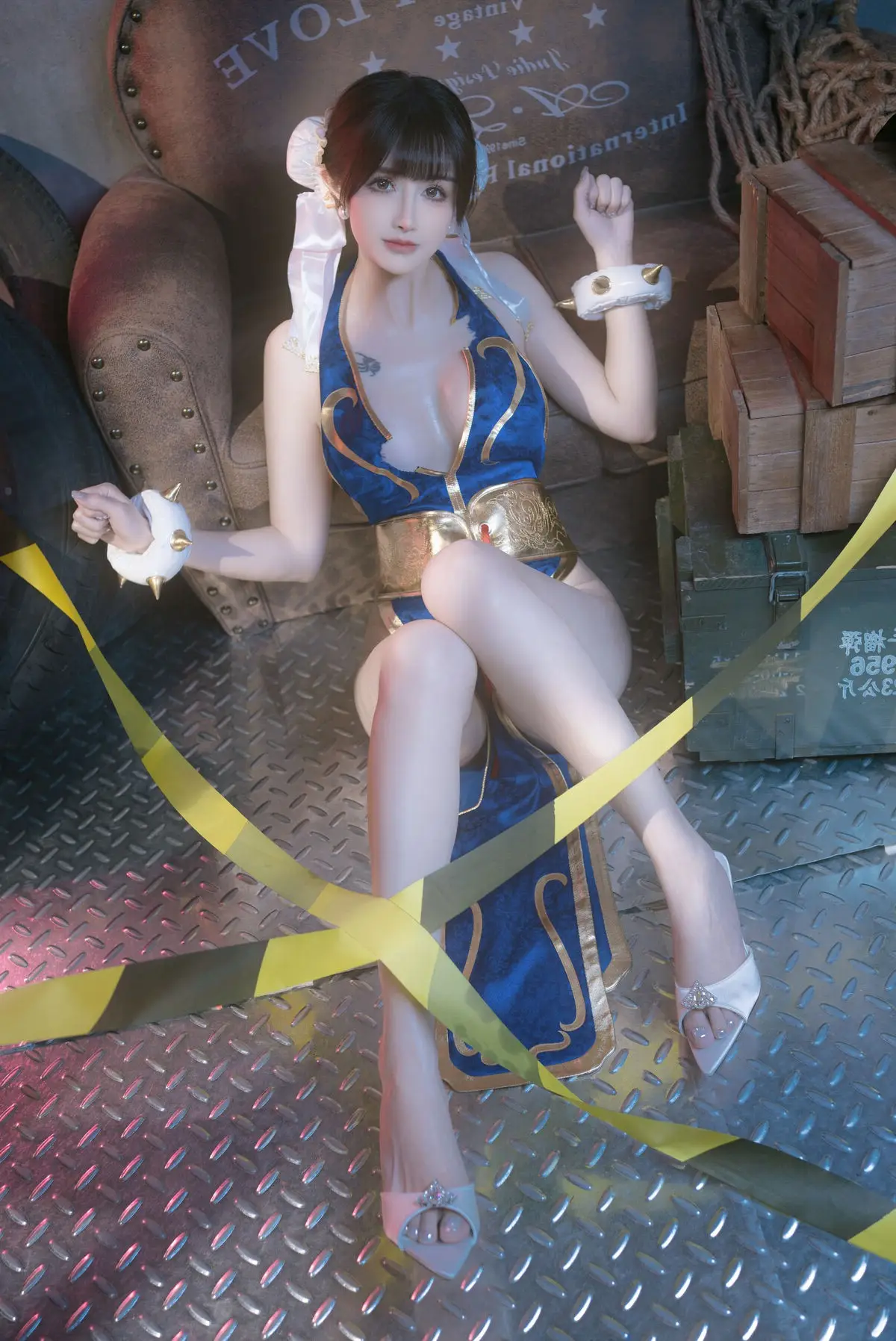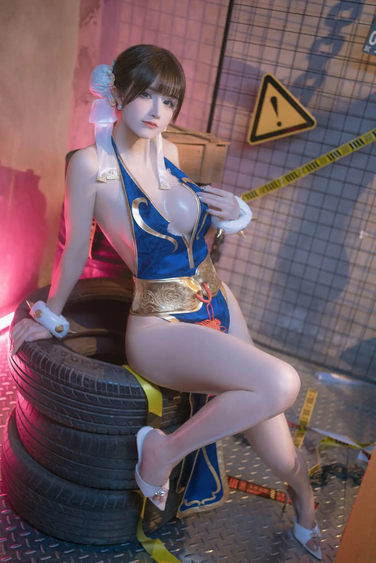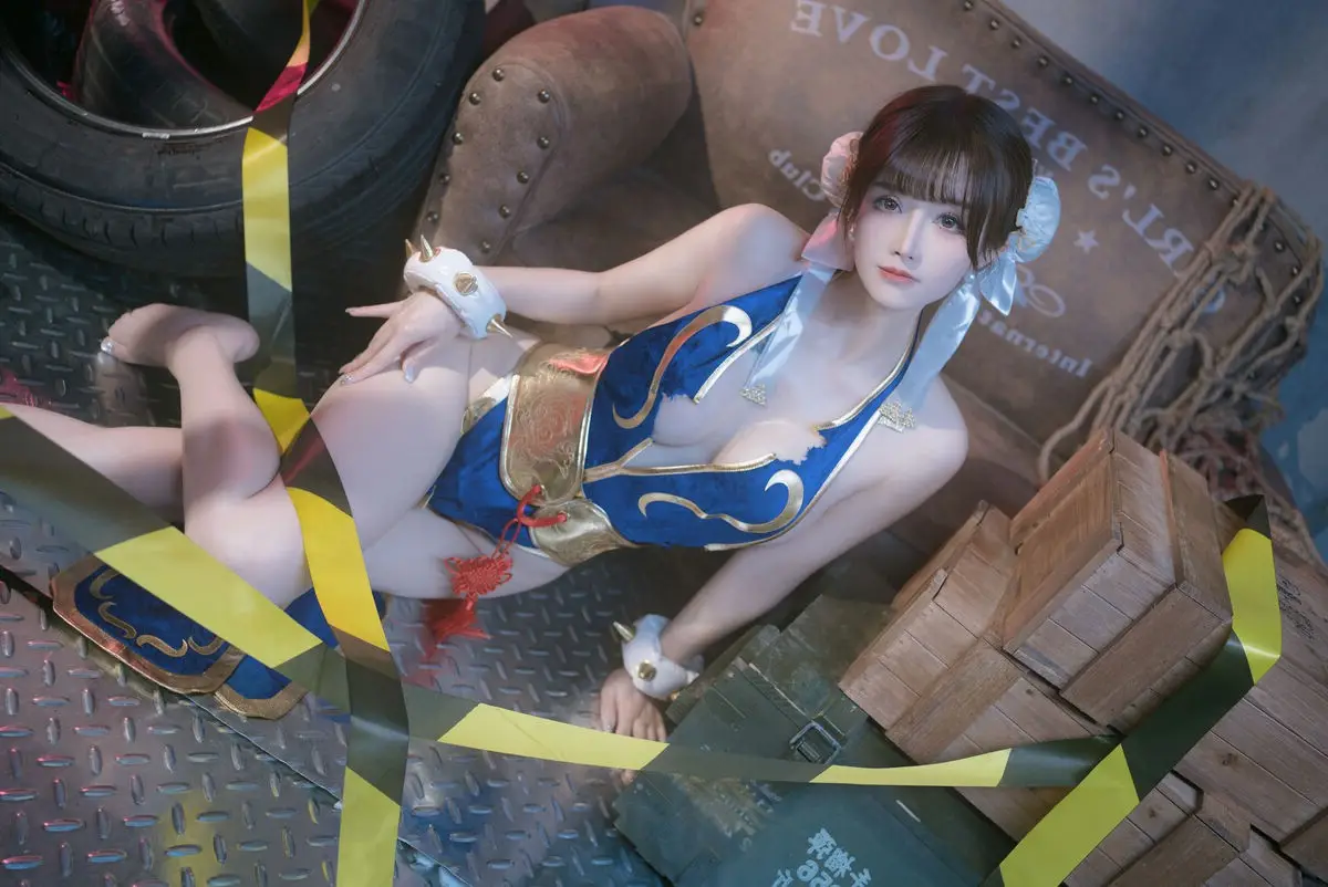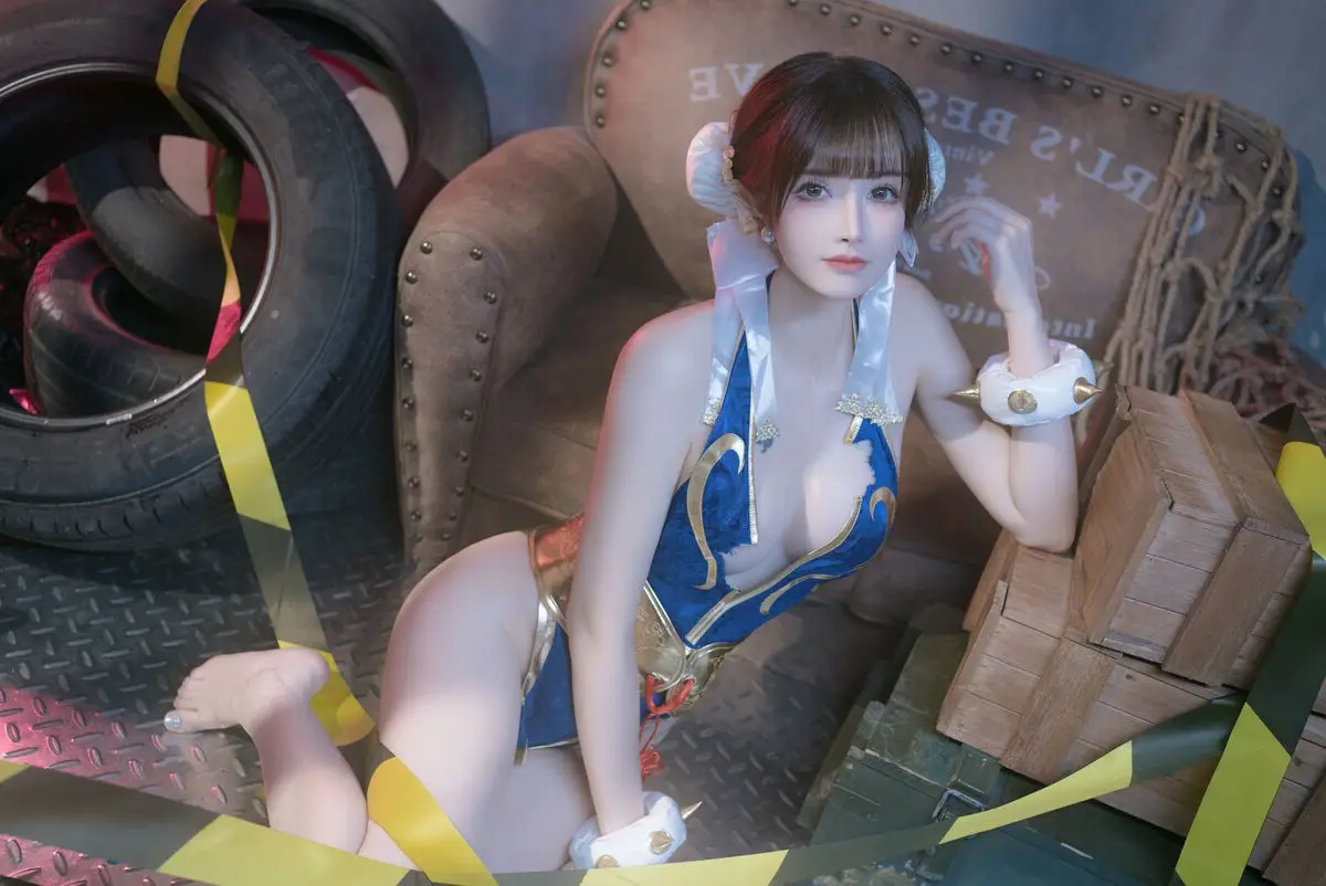 This captivating image features Coser Lu Ba Sui embodying Chun-Li, the iconic fighter from Street Fighter. Dressed in her signature blue qipao, meticulously detailed, she exudes a powerful yet undeniably alluring presence. Her confident recline and captivating gaze hint at a mysterious and inviting allure. The portrayal not only perfectly recreates Chun-Li's legendary look but also evokes the essence of a special 'combat training' session, where strength and elegance merge seamlessly. Viewers will be drawn in by Lu Ba Sui's professional demeanor and meticulous dedication, discovering a fresh and enticing dimension of this classic gaming character.#Coser #LuBaSui #ChunLiCosplay #StreetFighter #MartialArtsBeauty #GamingCosplay