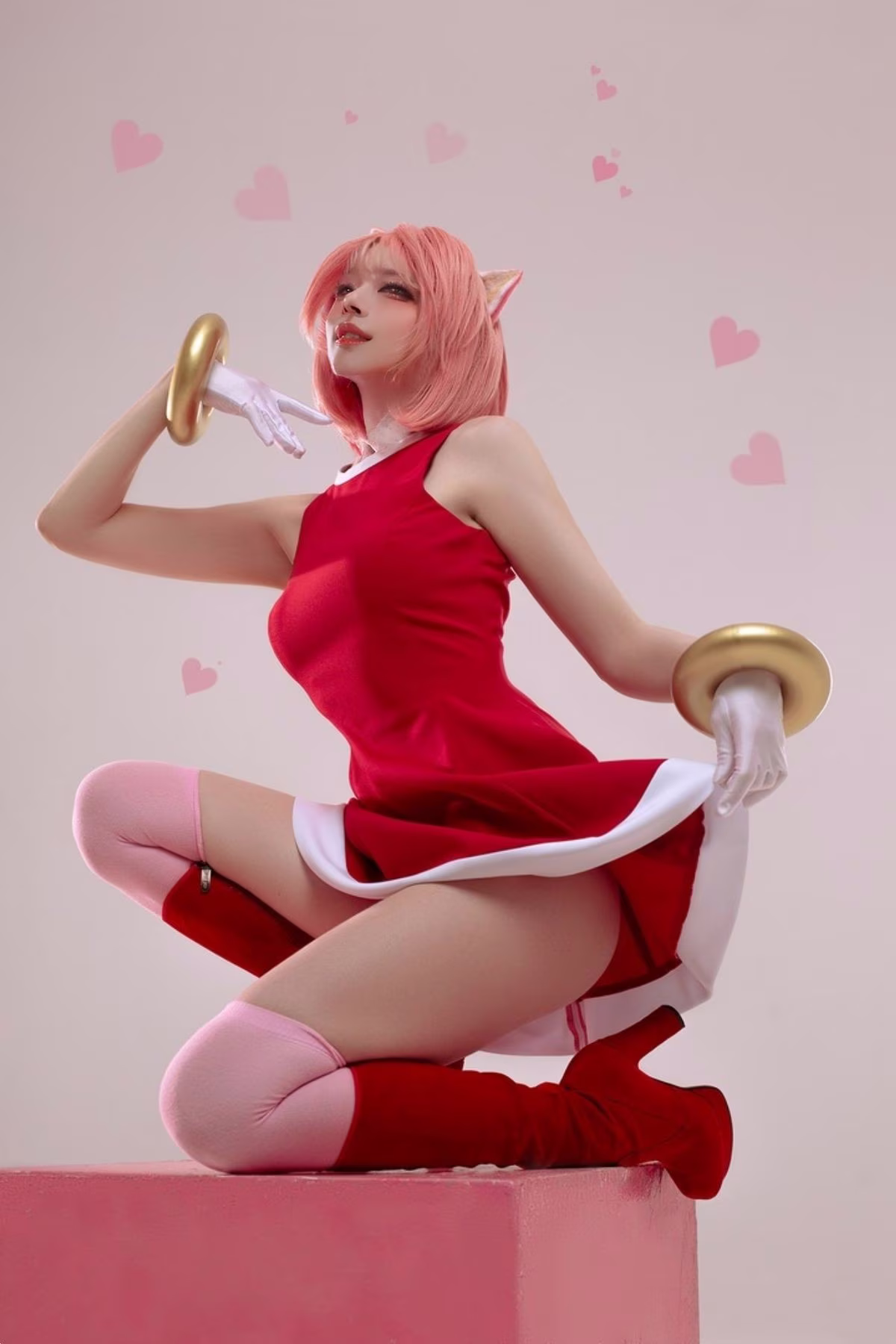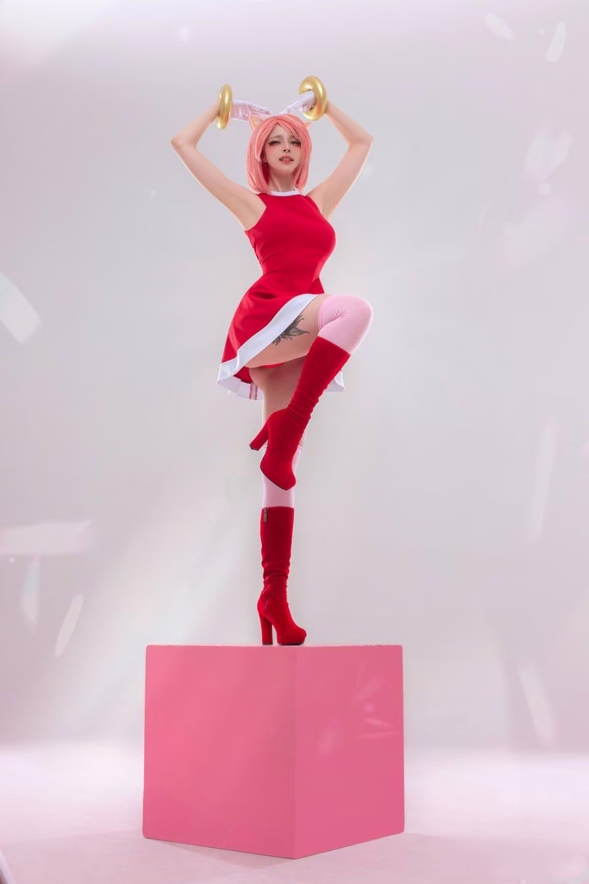 Immerse yourself in the vibrant world of gaming with Coser 暴走鲤鱼王's outstanding and energetic portrayal of Amy Rose. Featured in the 12月合集 Part05 collection she brings the iconic Sonic the Hedgehog character to life with a stunning red dress stylish high boots and signature golden accessories. Every detail is meticulously crafted from the sweet pink hair to the cheerful expression perfectly embodying Amy's charming yet determined spirit. With a dynamic and captivating pose Coser 暴走鲤鱼王 not only recreates but also infuses a lively essence into Amy Rose inviting viewers to marvel at this unique and engaging photo set and explore more from the collection.