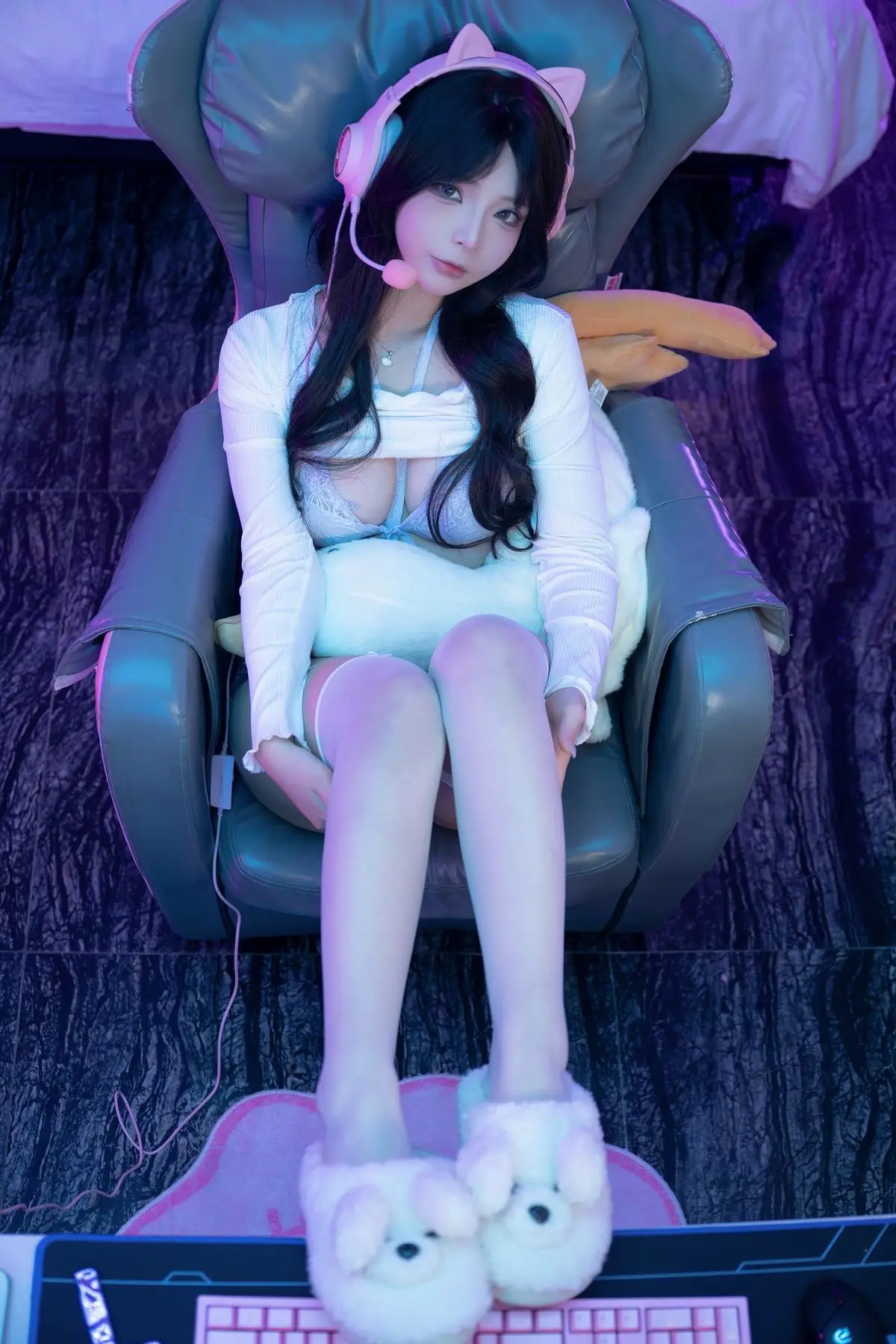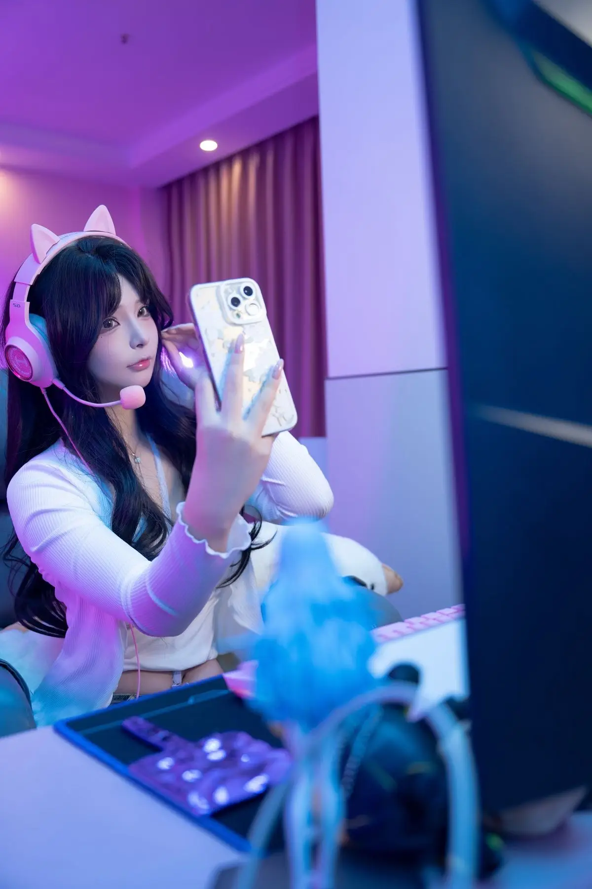 Immerse yourself in an unexpected moment with Coser Yuuhui from her "accidental" livestream Part1. This image captures the sweet and captivating beauty of the gaming streamer, featuring her long flowing hair and adorable pink cat-ear headphones. She appears in a casual yet undeniably alluring outfit, comfortably seated before a vibrant gaming keyboard. The mystic purple ambient lighting enhances her private space, creating an atmosphere that is both intimate and enchanting. This offers an authentic and emotional glimpse into Yuuhui, a talented coser and charismatic streamer, bringing fans moments of relaxation and surprise.#Coser #Yuuhui #LivestreamAccident #GamingStreamer #CosplayGirl #GamerGirl