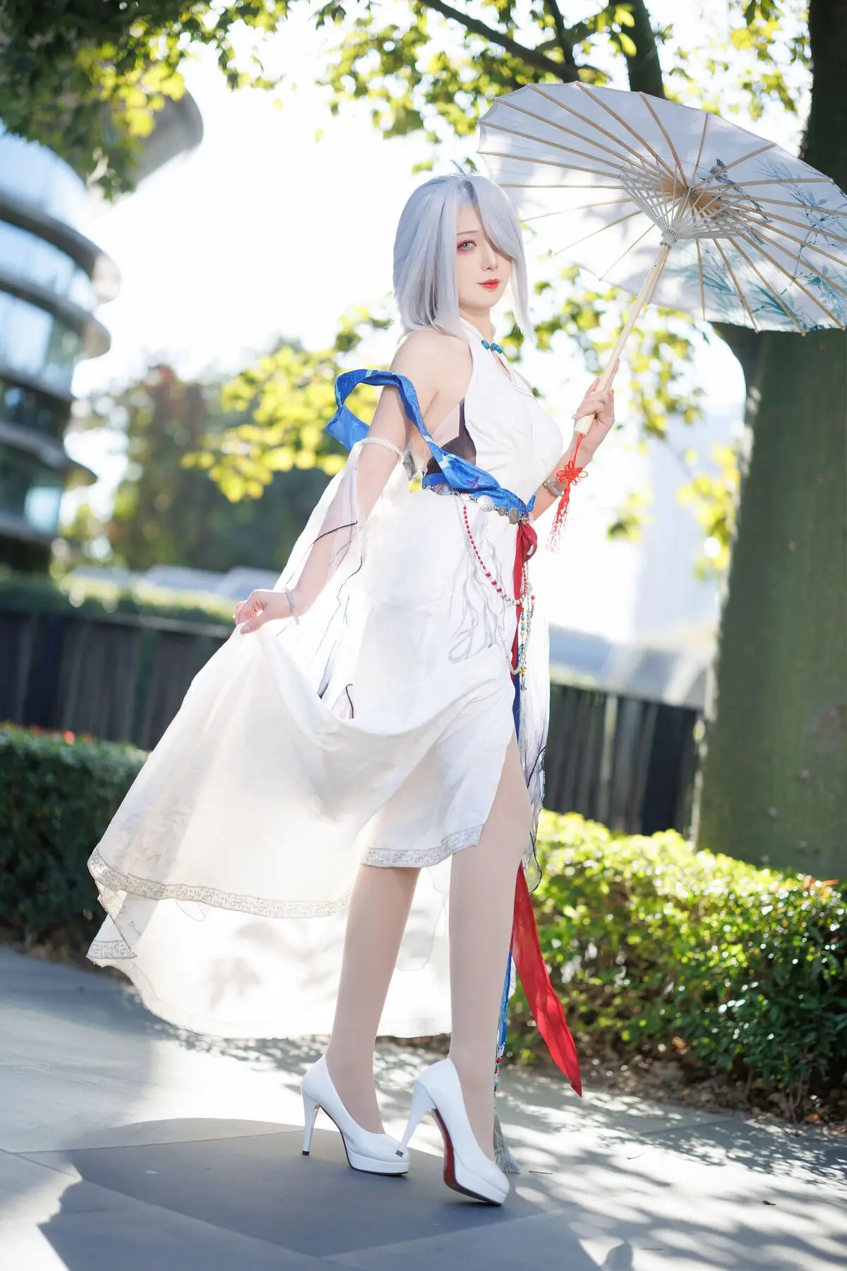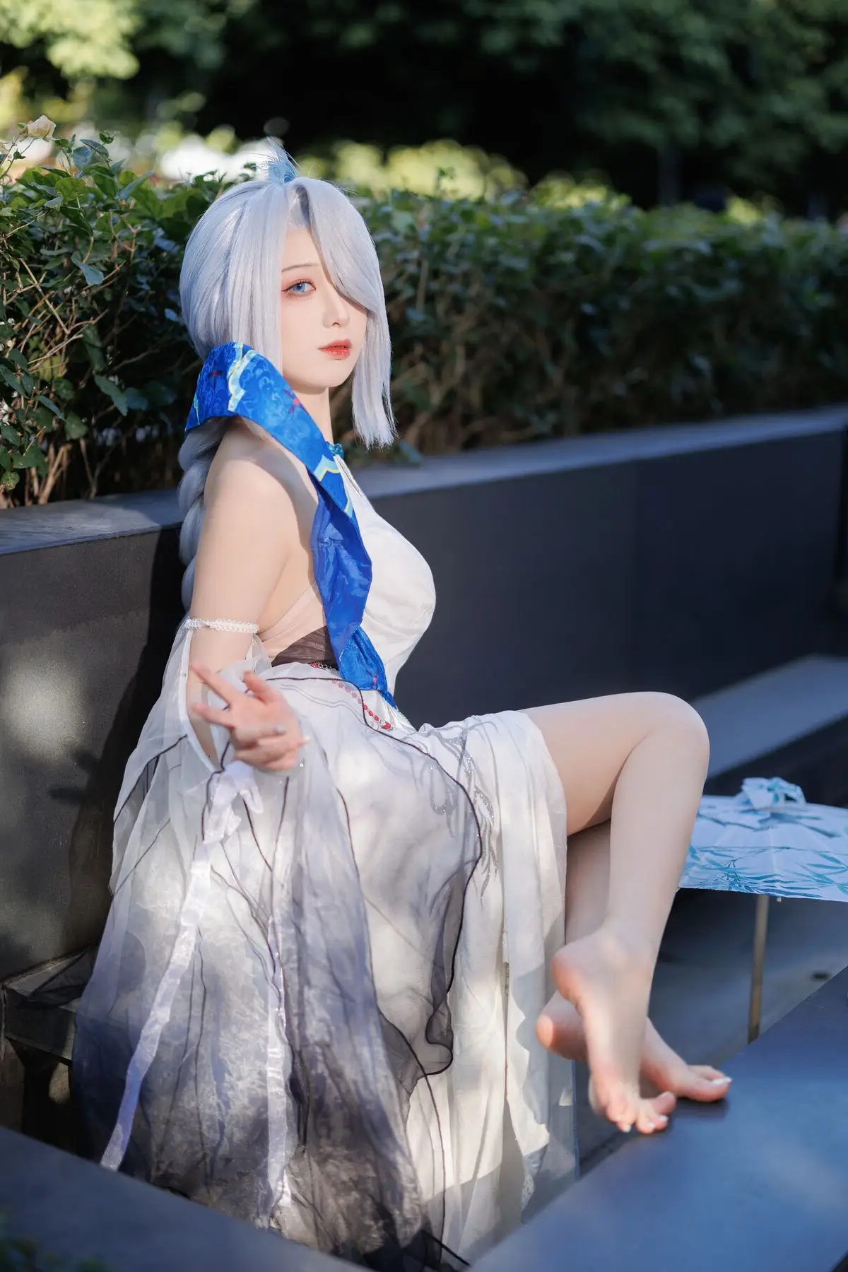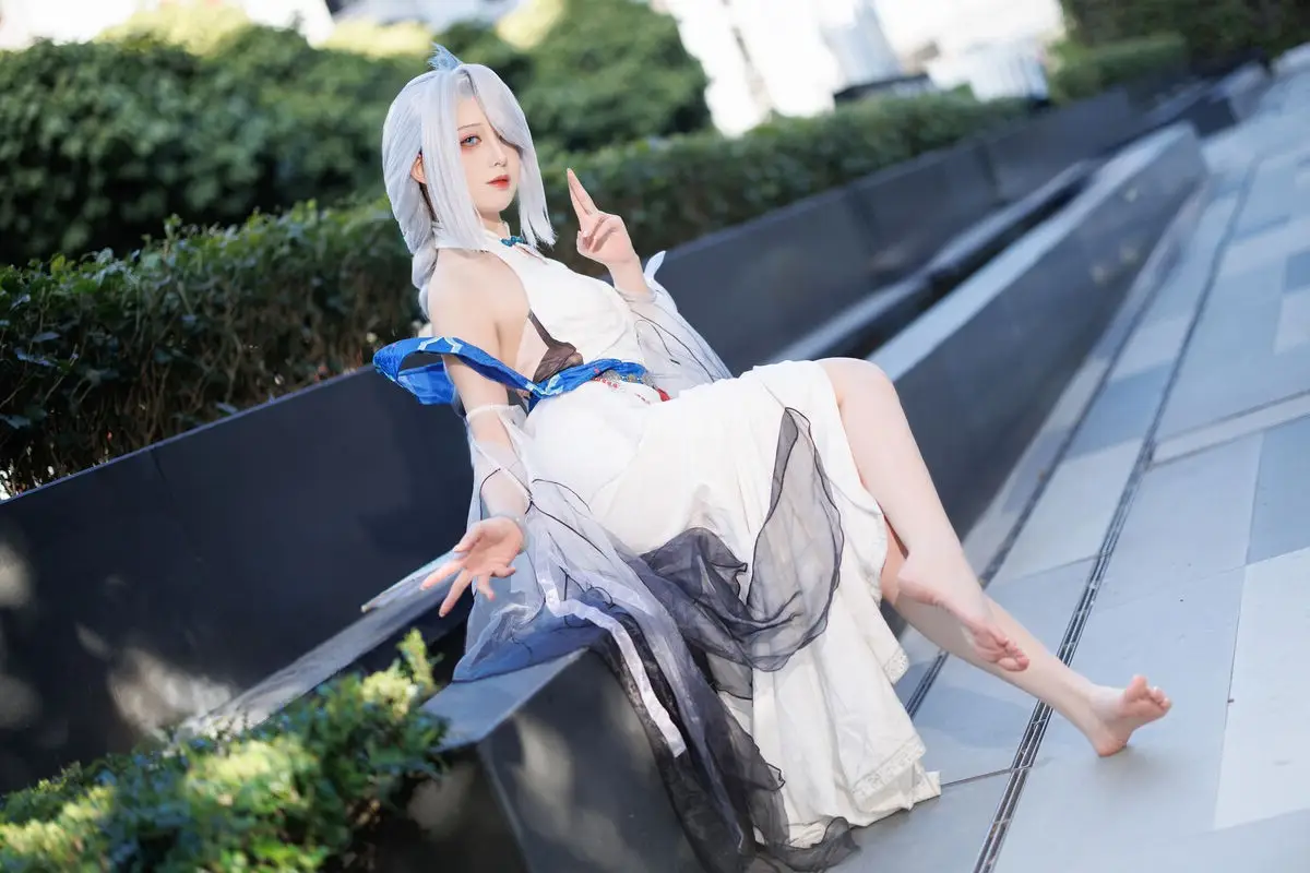 Coser Feng Jiang Jiang V delivers a breathtaking portrayal of Shenhe from Genshin Impact. In this stunning outdoor photoshoot, the model exudes the ethereal beauty and distinctive aura of the character. The intricate white and blue costume is meticulously recreated, complemented by flowing silver hair and a traditional parasol, forming a harmonious and captivating ensemble. Her elegant pose on the steps, coupled with a profound gaze, truly brings Shenhe to life as if stepping directly from the game world. The image not only highlights the meticulous effort invested in the costume but also successfully captures Shenhe's cool yet alluring demeanor. This is truly a remarkable piece of cosplay artistry.#ShenheCosplay #GenshinImpact #FengJiangJiangV #CosplayPhotography #AnimeCosplay