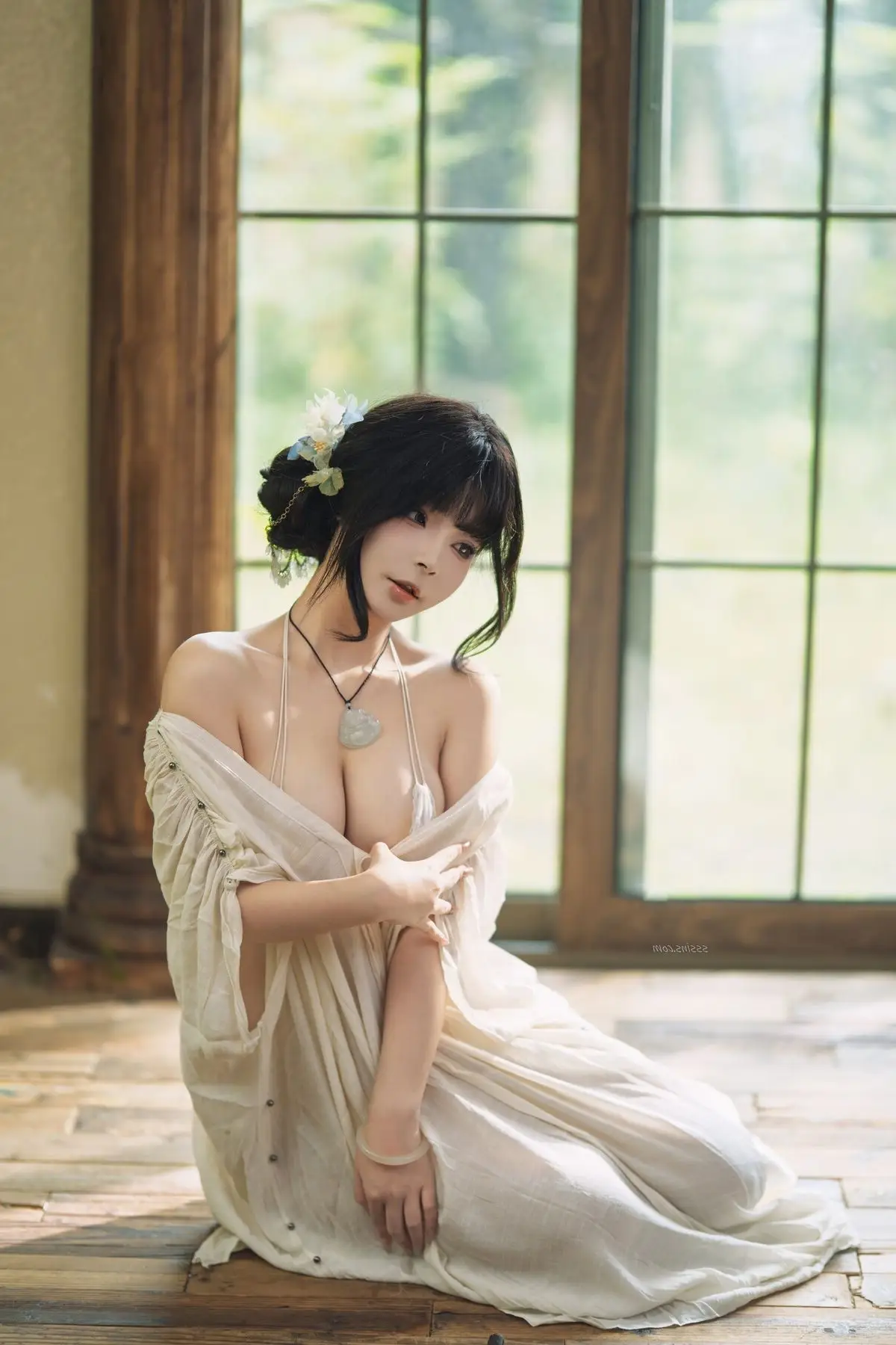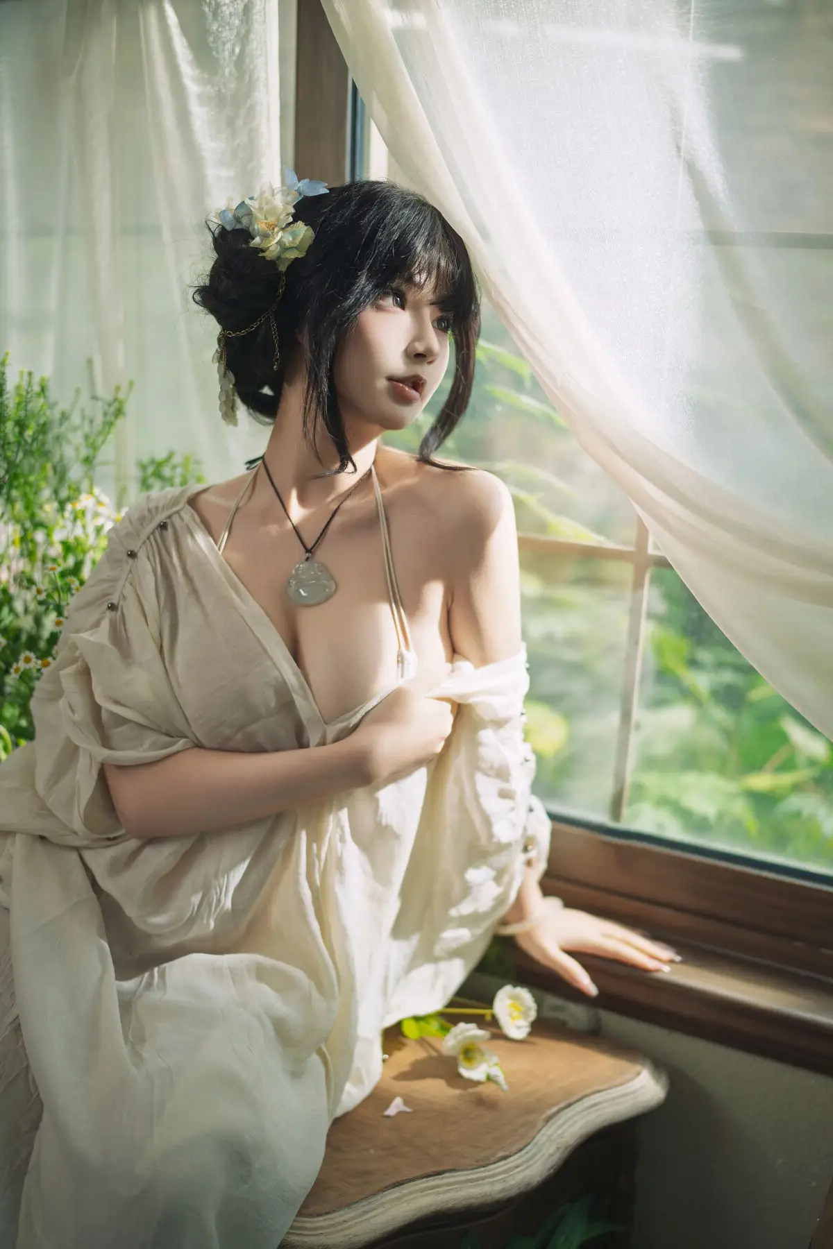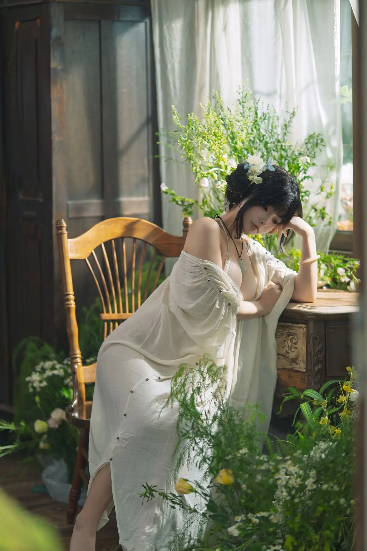 Immerse yourself in the serene elegance of Coser Yuuhui through her "Song of Spring" Part02 photoshoot. In this captivating image, Yuuhui embodies a gentle muse, gracefully seated on a wooden floor, her gaze softly directed away. Her pristine cream-colored dress, featuring a delicate deep V-neckline, beautifully accentuates her natural softness and allure. Bathed in natural light streaming through a large window, the setting creates a warm, romantic ambiance, highlighting her smooth skin and dark hair adorned with a white flower. She exudes a tranquil charm, much like a peaceful note in spring's symphony, offering a sense of calm and beauty to the viewer. This collection promises to enchant all who appreciate subtle grace and refined aesthetics.#Coser #Yuuhui #SongOfSpring #GentleBeauty #GracefulPose #EtherealMuse