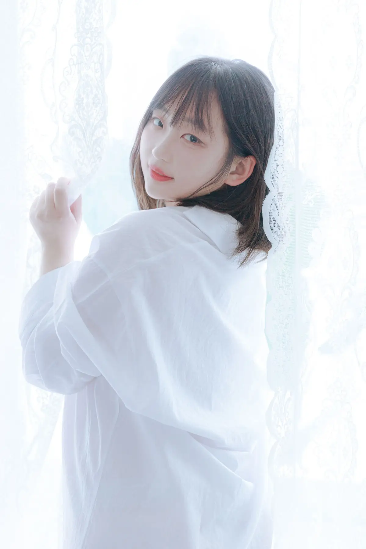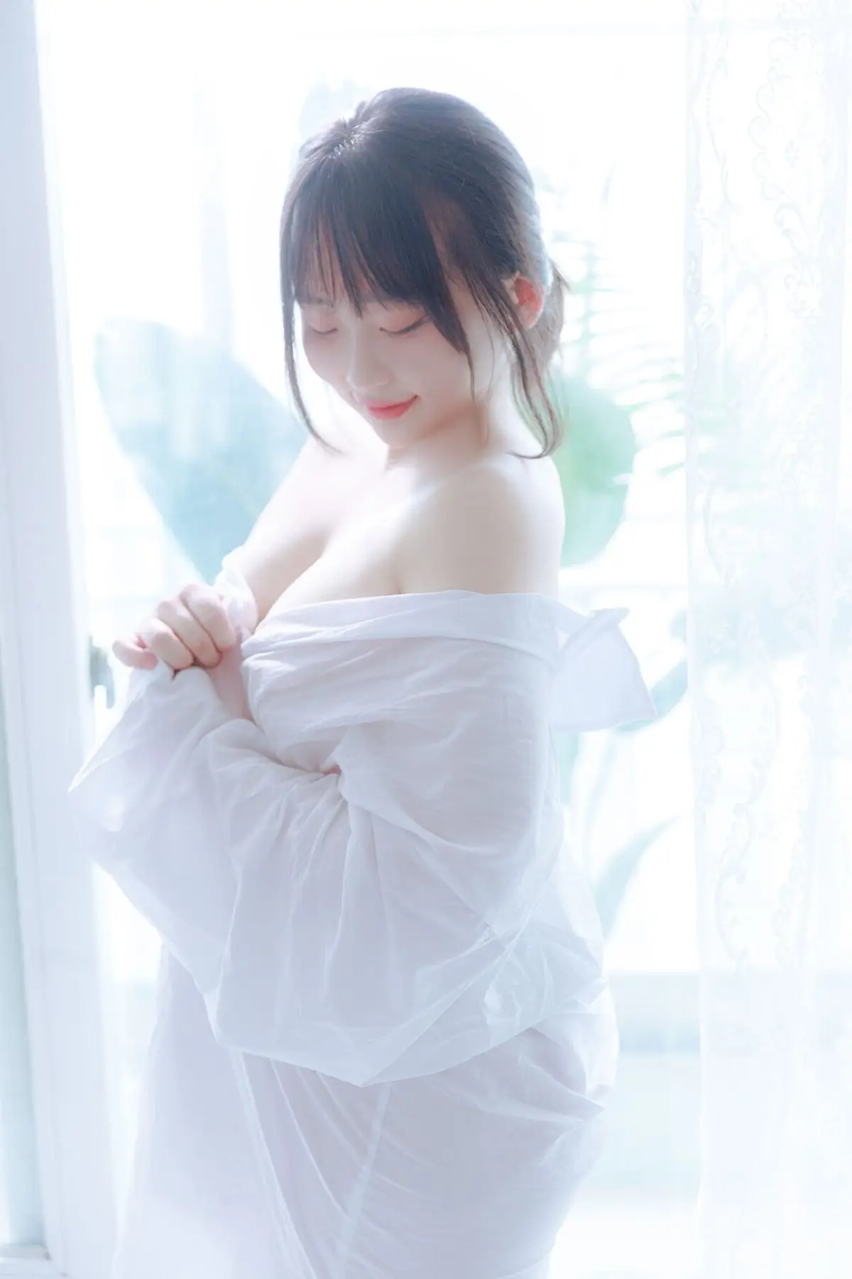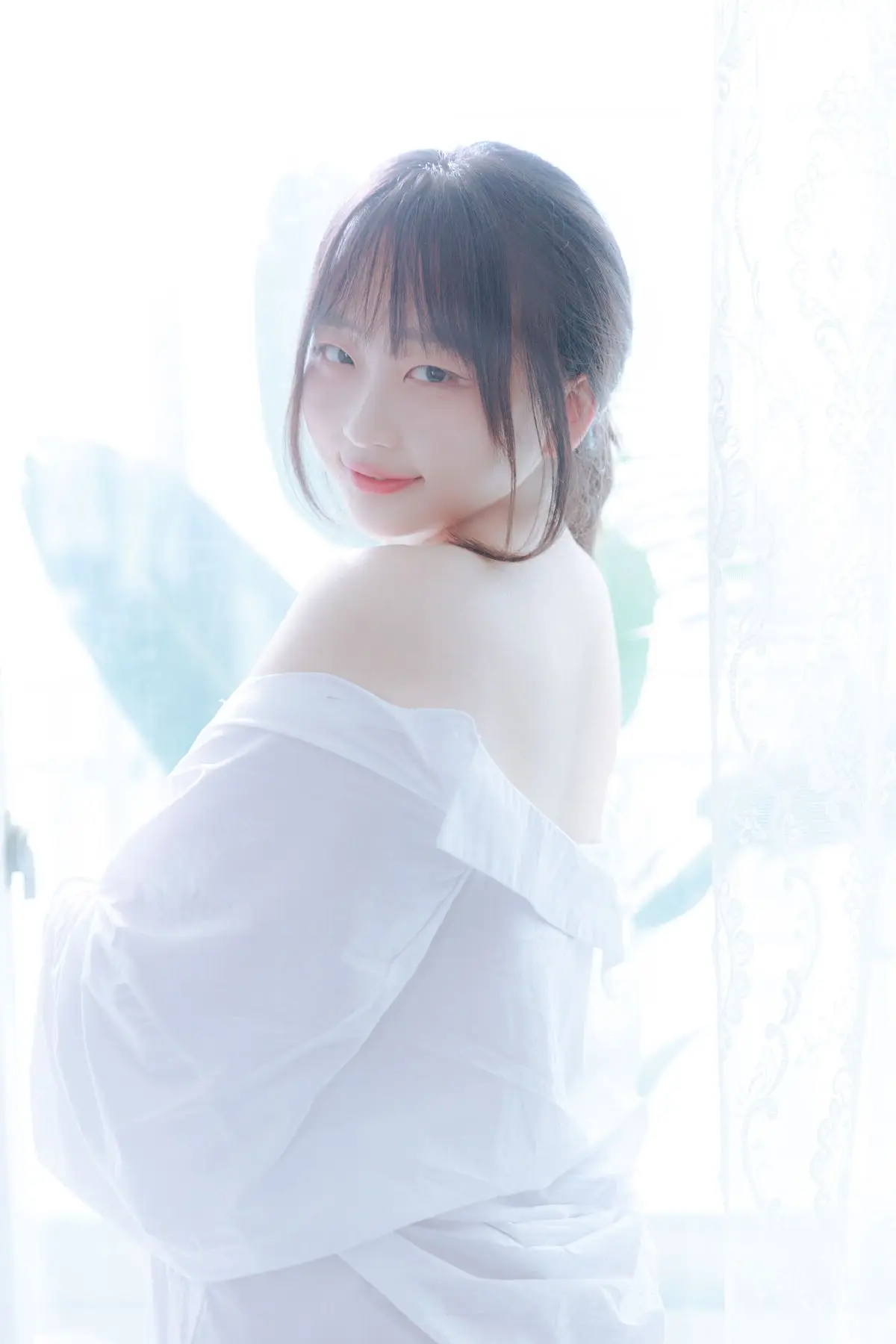 Immerse yourself in the serene elegance of Coser Yuuhui through her "Song of Spring" Part02 photoshoot. In this captivating image, Yuuhui embodies a gentle muse, gracefully seated on a wooden floor, her gaze softly directed away. Her pristine cream-colored dress, featuring a delicate deep V-neckline, beautifully accentuates her natural softness and allure. Bathed in natural light streaming through a large window, the setting creates a warm, romantic ambiance, highlighting her smooth skin and dark hair adorned with a white flower. She exudes a tranquil charm, much like a peaceful note in spring's symphony, offering a sense of calm and beauty to the viewer. This collection promises to enchant all who appreciate subtle grace and refined aesthetics.#Coser #Yuuhui #SongOfSpring #GentleBeauty #GracefulPose #EtherealMuse