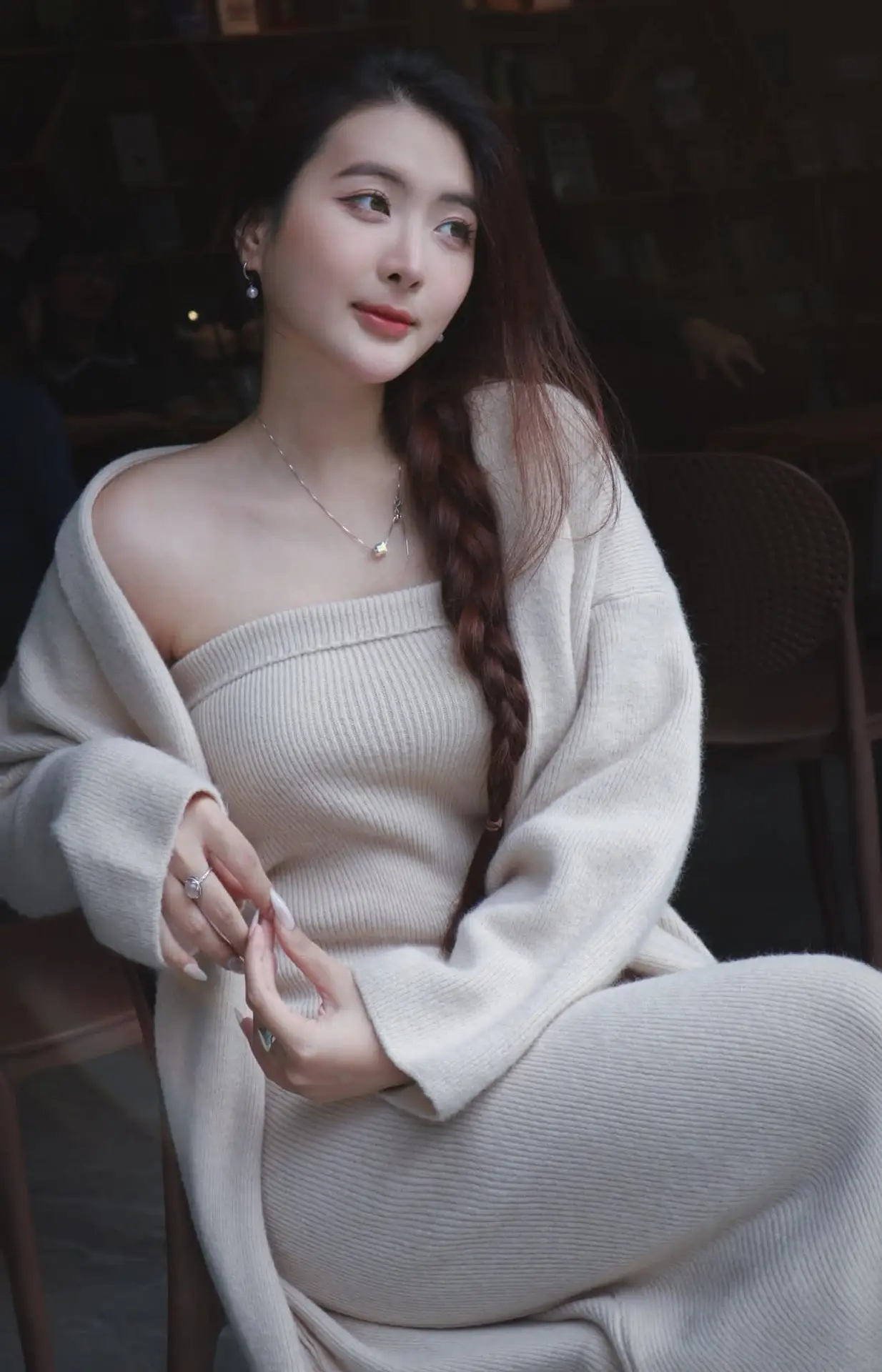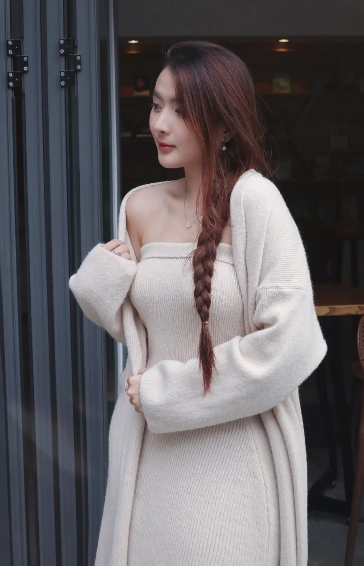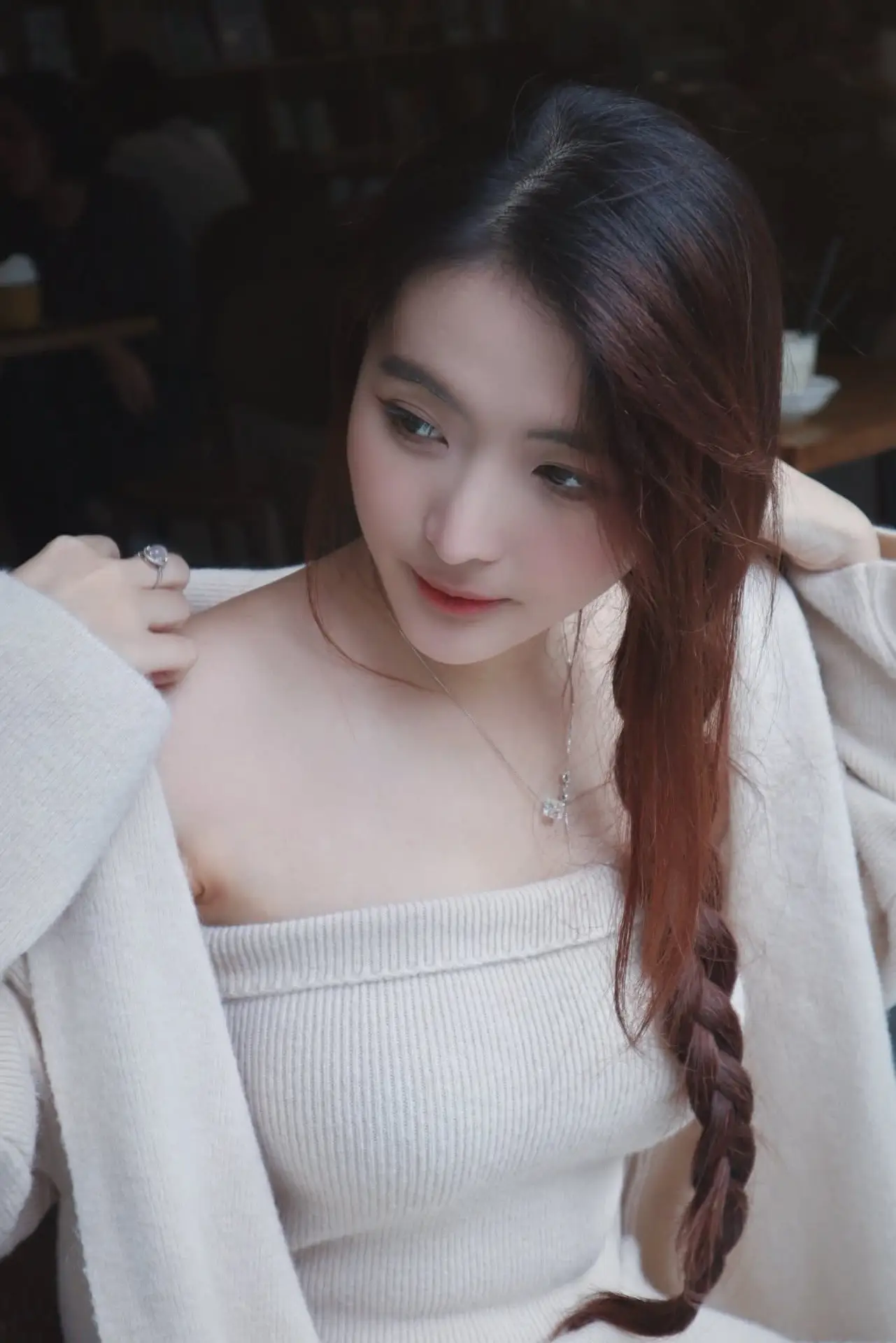 The images beautifully portrays a young woman exuding elegant charm and gentle grace. Her long braided brown hair cascades softly over her shoulder framing a delicate face with a serene expression. She is dressed in a cozy cream-colored knit cardigan over a matching tube top showcasing a sophisticated and timeless fashion style. Subtle pearl earrings and a slender necklace add a touch of refined elegance. Her gaze directed slightly away suggests a thoughtful or dreamy state immersing viewers in a private moment filled with quiet emotion. This portrait evokes a sense of peace and enduring beauty making it a captivating visual experience.#ElegantWoman #GentleBeauty #AsianFashion #CozyStyle #SerenePortrait