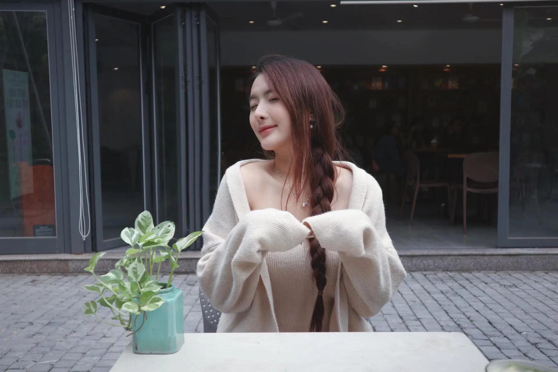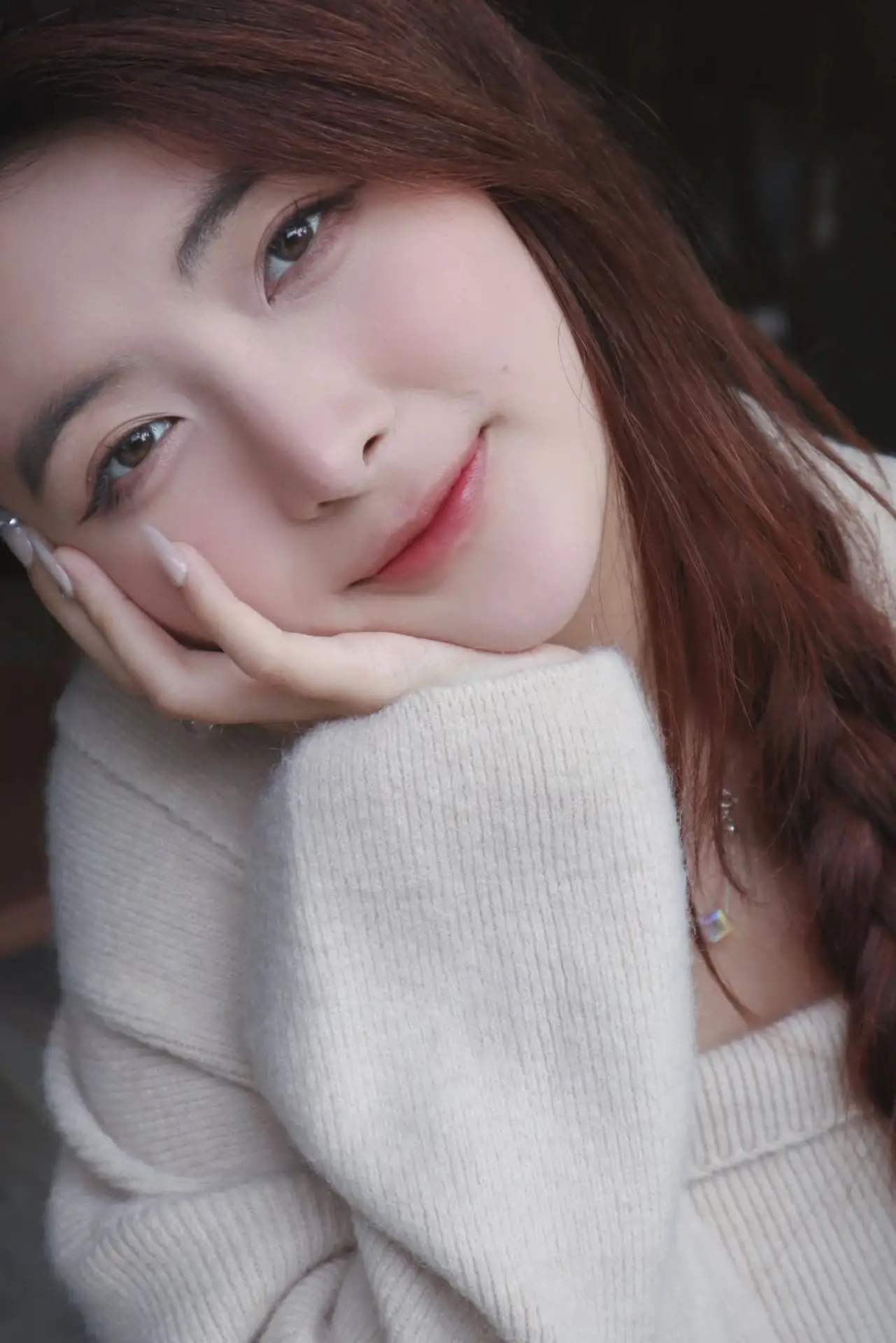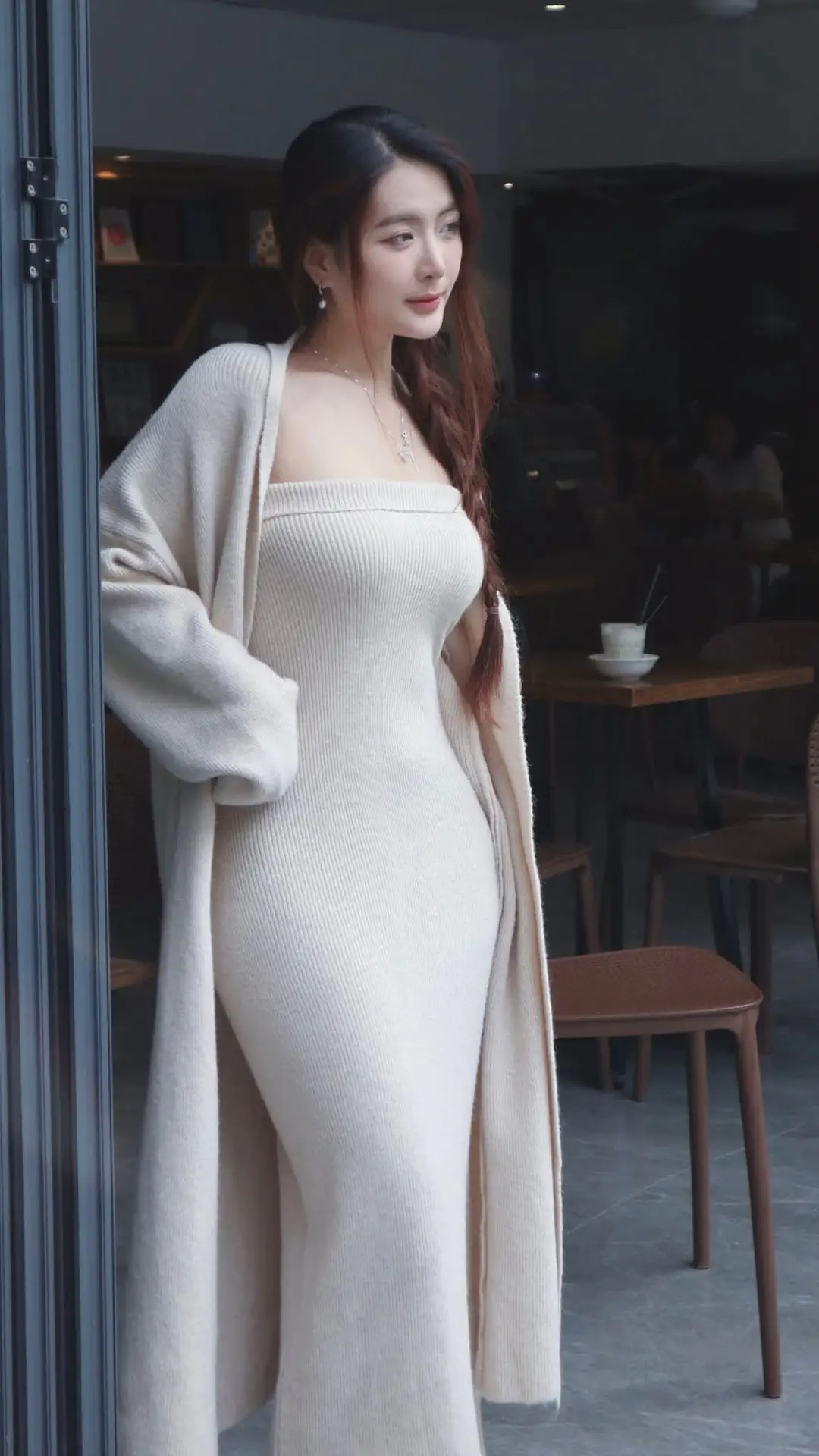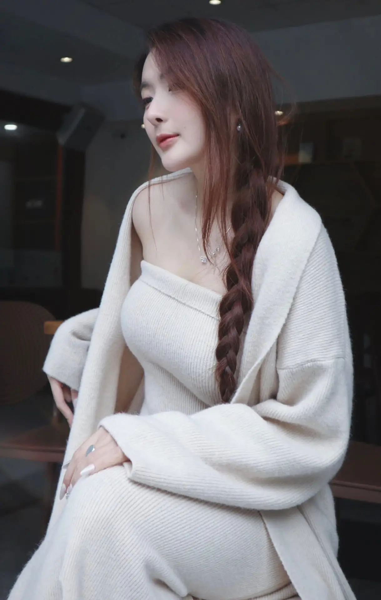 The images beautifully portrays a young woman exuding elegant charm and gentle grace. Her long braided brown hair cascades softly over her shoulder framing a delicate face with a serene expression. She is dressed in a cozy cream-colored knit cardigan over a matching tube top showcasing a sophisticated and timeless fashion style. Subtle pearl earrings and a slender necklace add a touch of refined elegance. Her gaze directed slightly away suggests a thoughtful or dreamy state immersing viewers in a private moment filled with quiet emotion. This portrait evokes a sense of peace and enduring beauty making it a captivating visual experience.#ElegantWoman #GentleBeauty #AsianFashion #CozyStyle #SerenePortrait