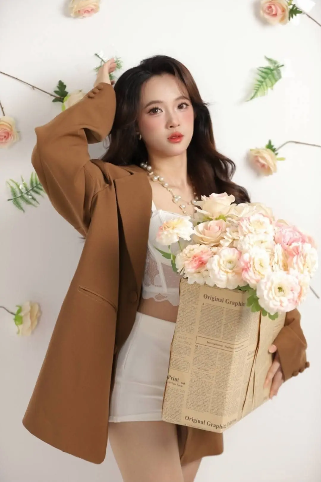 This captivating image captures a young woman's alluring presence, showcasing her delicate beauty with flowing long hair and a confident gaze. She elegantly combines a seductive white lace bralette with stylish white shorts and a chic brown blazer, creating a look that is both glamorous and sophisticated. The studio setting is adorned with soft pink roses and delicate foliage, evoking a dreamy and romantic atmosphere. The woman exudes self-assurance, embodying unique fashion sensibility and irresistible charm. This photograph not only celebrates physical beauty but also radiates the modern woman's spirit of freedom and confidence. The harmonious blend of floral gentleness and the bold outfit creates a compelling overall impression, highlighting her exquisite taste and radiant self-possession.