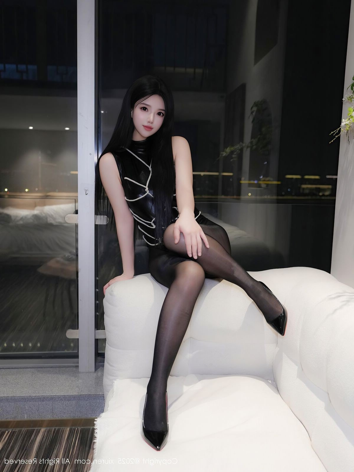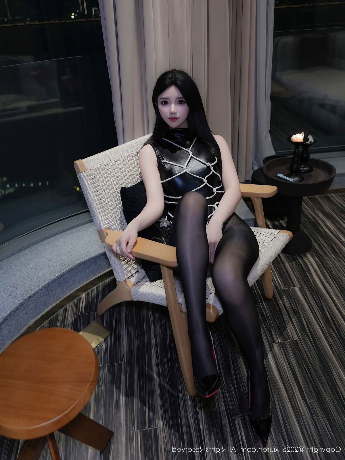 This captivating image showcases model Mu Yan Yan Yan Jiang in a stunning and alluring style from the XiuRen No.10299 collection. She exudes an air of elegant confidence, dressed in a sleek black sleeveless dress adorned with unique chain detailing. Her long, slender legs are accentuated by sheer black stockings and sharp pointed high heels, creating a cohesive and sophisticated ensemble. With her magnetic gaze and poised demeanor, Mu Yan Yan Yan Jiang not only embodies modern fashion but also projects an irresistible charm. The blurred city lights visible through the window in the background add a touch of urban glamour, elevating this into a high-fashion moment that powerfully asserts her strong and captivating personal style.Stories