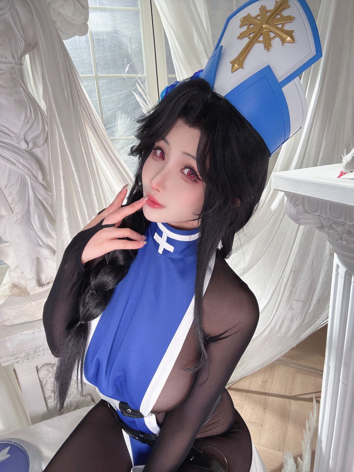 Immerse yourself in the captivating world of Goddess of Victory Nikke with Coser Rioko凉凉子's stunning portrayal of Maiden Ice Rose This exceptional cosplay highlights the intricate details of Maiden's iconic blue and black ensemble from the distinct headwear to the form fitting bodysuit Rioko凉凉子 masterfully embodies the character's powerful yet alluring essence with a gaze that commands attention and a confident posture that brings Maiden to life The pristine white background adorned with classical elements beautifully complements the divine and elegant aura of the Goddess This is more than just a cosplay it is a testament to Rioko凉凉子's dedication and artistic talent offering Nikke fans an unforgettable visual experience