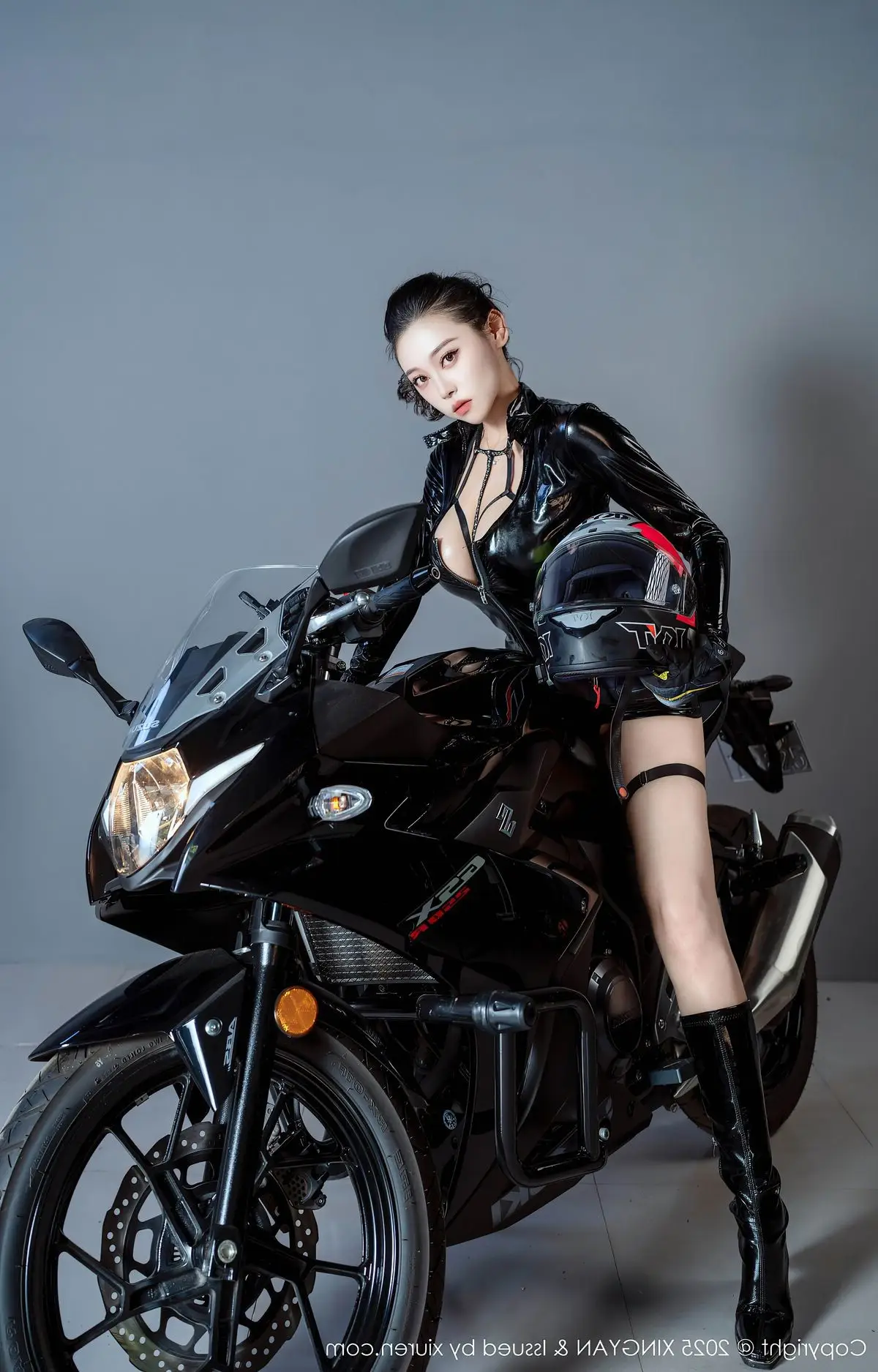 In this XingYan Star Face Vol.378 collection Qing Miao radiates captivating beauty and strong personality. She dons a sleek form-fitting black leather outfit highlighting her perfect figure. Every detail from the long gloves to the exquisite tailoring contributes to a powerful and seductive biker woman image. Her confident pose and sharp gaze while leaning on the powerful motorcycle further emphasize Qing Miao's alluring charisma. She is not just a model but also an emblem of modern freedom and contemporary style igniting curiosity and admiration from viewers. This is truly an impressive display showcasing Qing Miao's class and irresistible charm.#QingMiao #XingYan #BikerGirl #LeatherFashion #Alluring