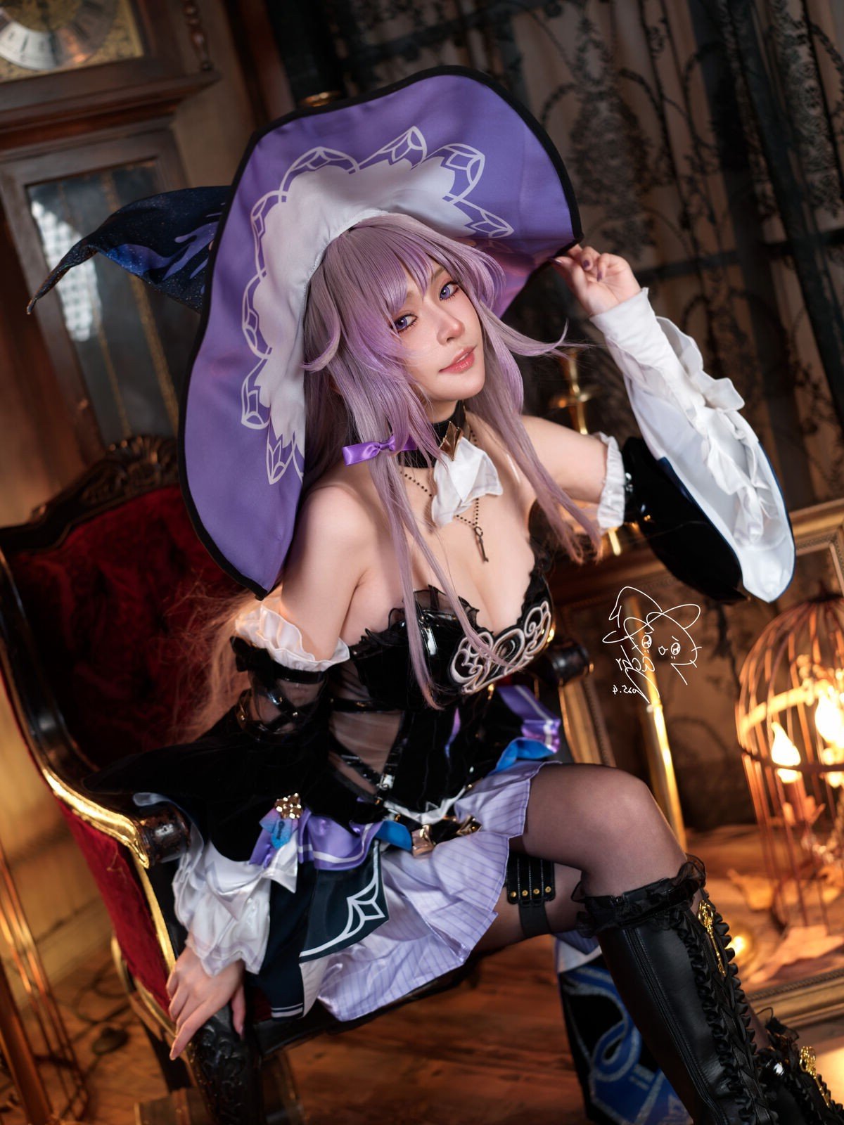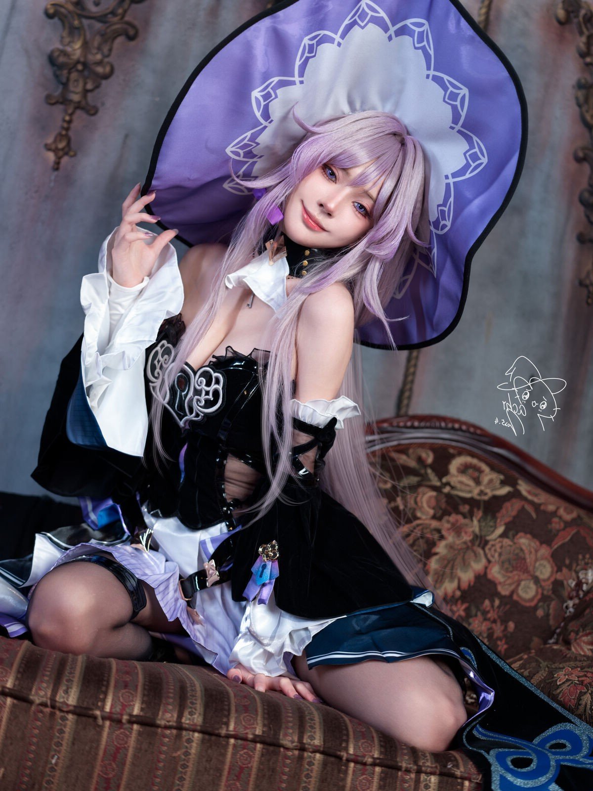 In this captivating image Coser Machi Ma Ji brilliantly embodies The Herta from Honkai Star Rail. Her portrayal is both authentic and alluring featuring Herta's iconic light purple hair distinctive wide-brimmed hat and an exquisitely detailed costume. The mysterious gaze combined with a subtle smile creates an elegant yet enchanting allure. This photograph not only showcases exceptional cosplay talent but also perfectly captures the essence of Herta a beloved character. It stands as a magnificent testament to Machi Ma Ji's passion and artistry within the vibrant world of video game cosplay.