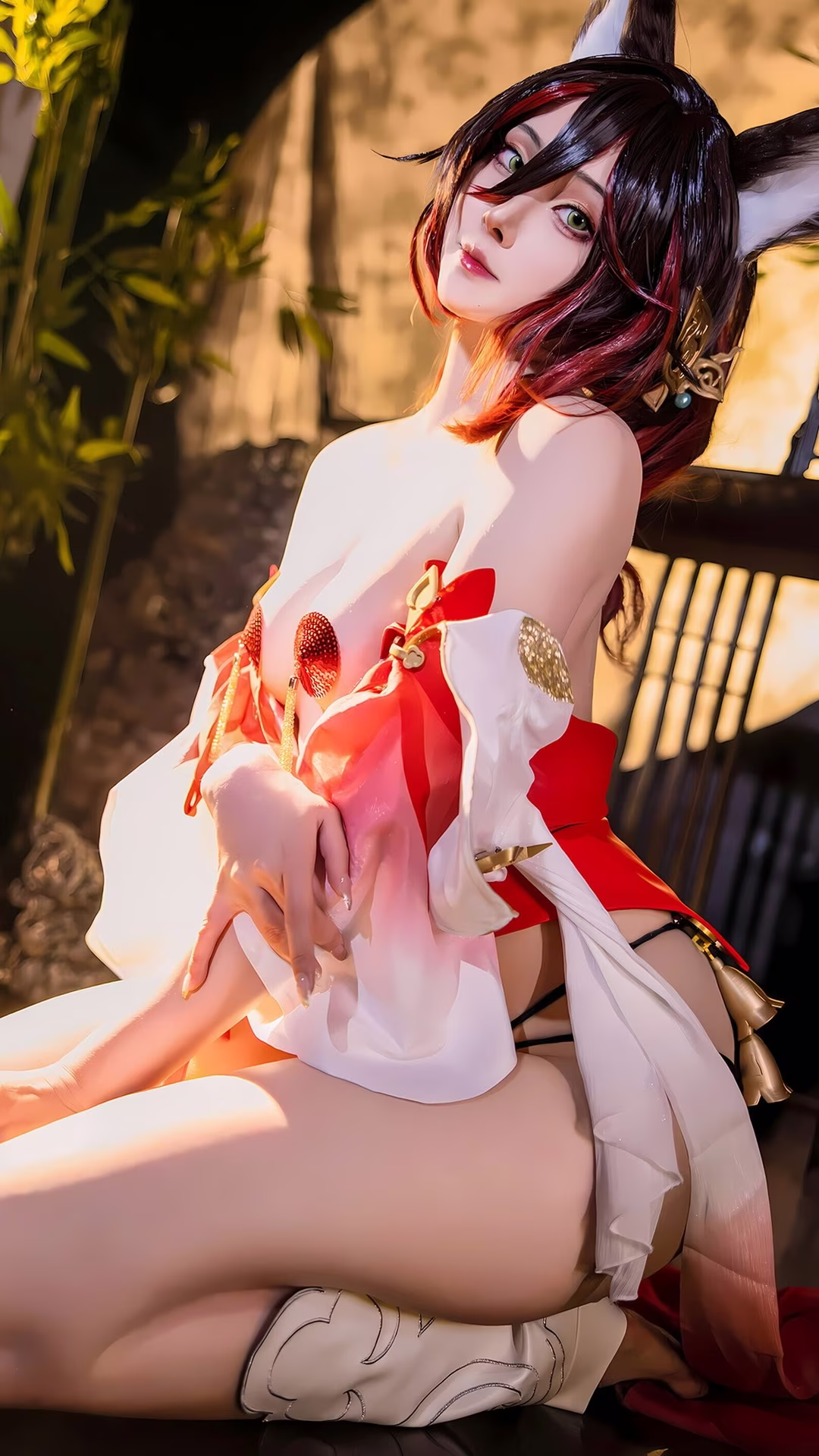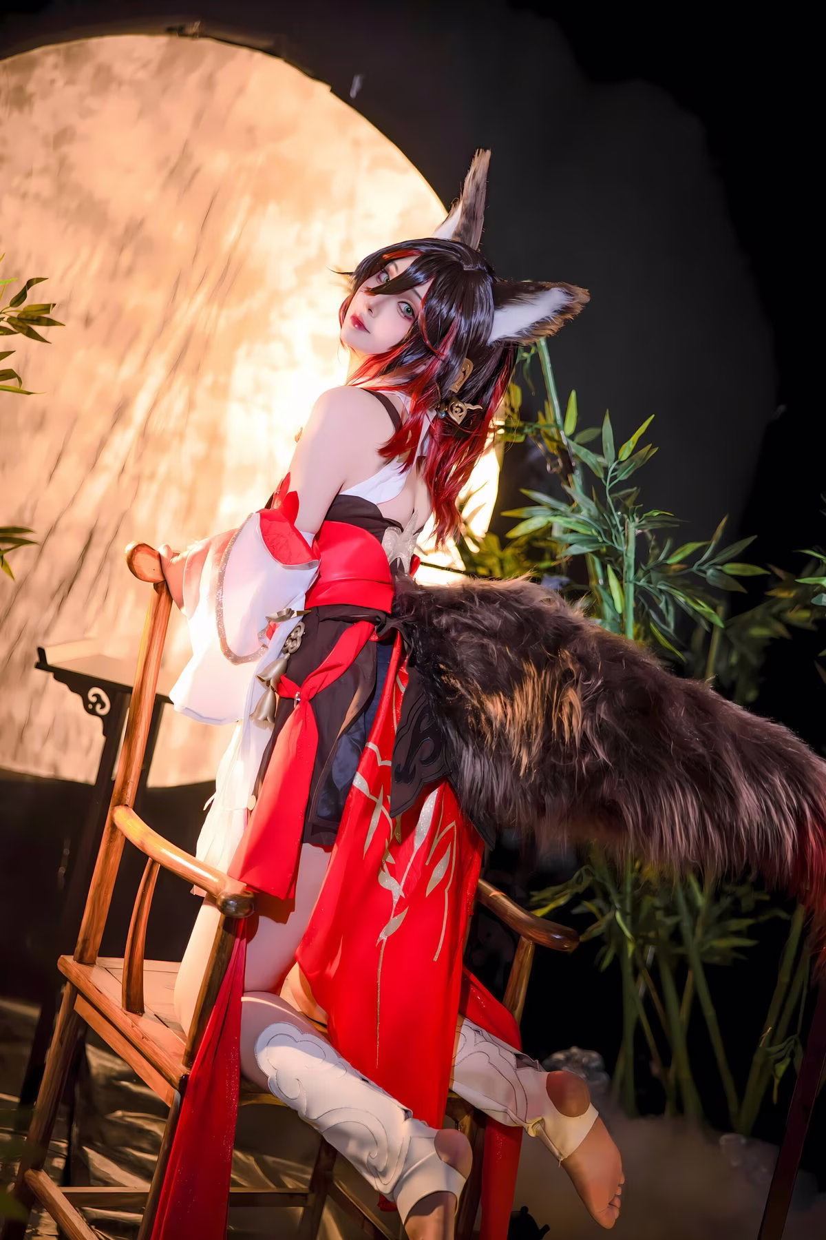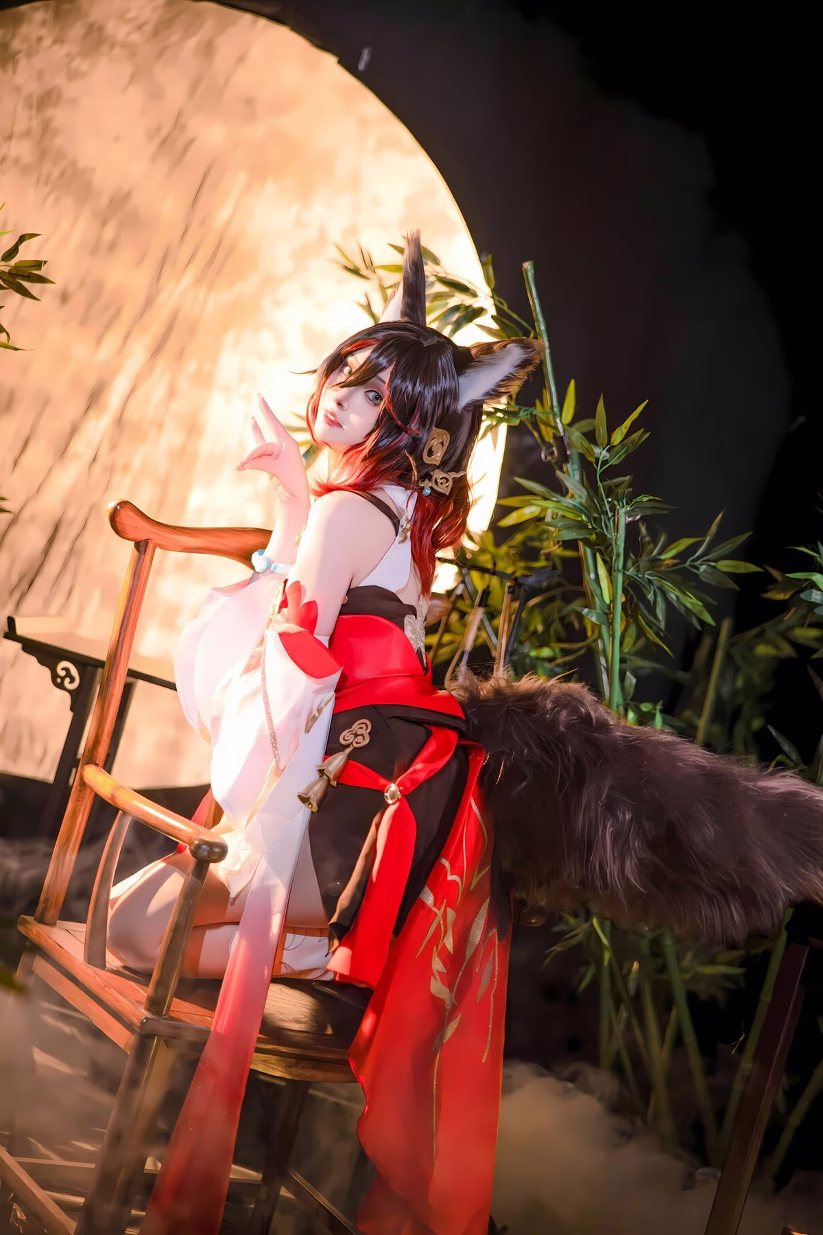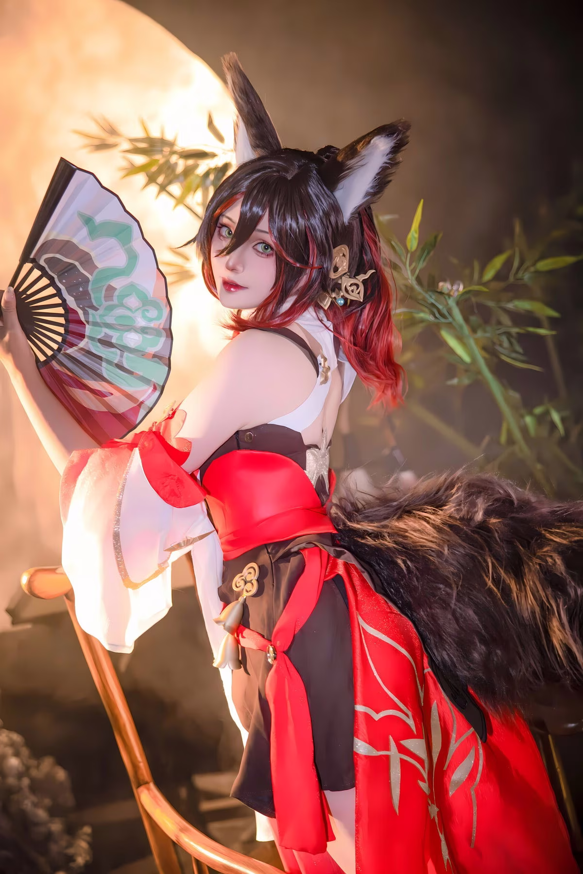 Coser Natsuko Xia Xia Zi delivers an exceptional portrayal of Tingyun from Honkai Star Rail exuding a captivating and enchanting beauty. Dressed in a meticulously crafted traditional outfit she fully showcases the character's alluring charm. The playful fox ears and voluminous fox tail are striking accents that bring Tingyun to life. Her graceful pose on the wooden chair coupled with the soft glow in the background further highlights the ethereal essence of the scene. Natsuko Xia Xia Zi has truly breathed soul into Tingyun presenting an authentic image that is both elegant and charismatic making it impossible for viewers to look away. This is truly a masterpiece of cosplay artistry.