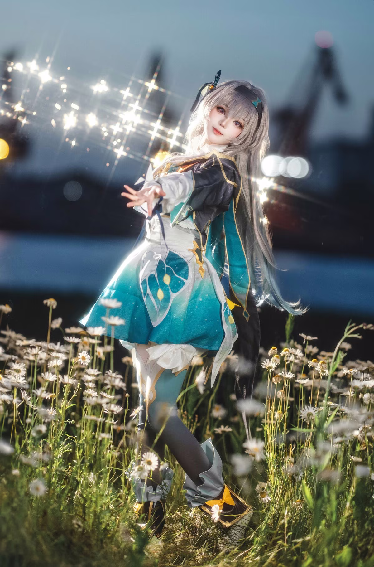 Coser Hana Shichi delivers a mesmerizing portrayal of Firefly from Honkai Star Rail bringing the beloved character to life with exquisite detail. Her meticulously crafted costume and delicate expression perfectly capture Fireflys ethereal charm. Set against a picturesque backdrop of soft white wildflowers bathed in golden light the image radiates a dreamlike serenity. Hana Shichis graceful pose and gentle gaze evoke a sense of peaceful wonder making this a truly captivating rendition. This stunning cosplay masterfully blends the fantasy of Honkai Star Rail with the tranquil beauty of nature inviting admirers into a world of enchanting artistry.