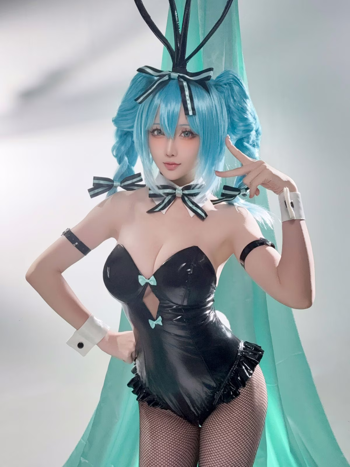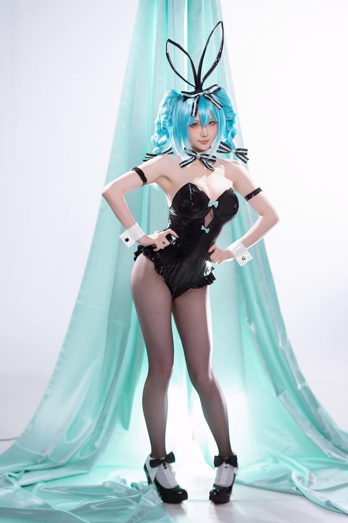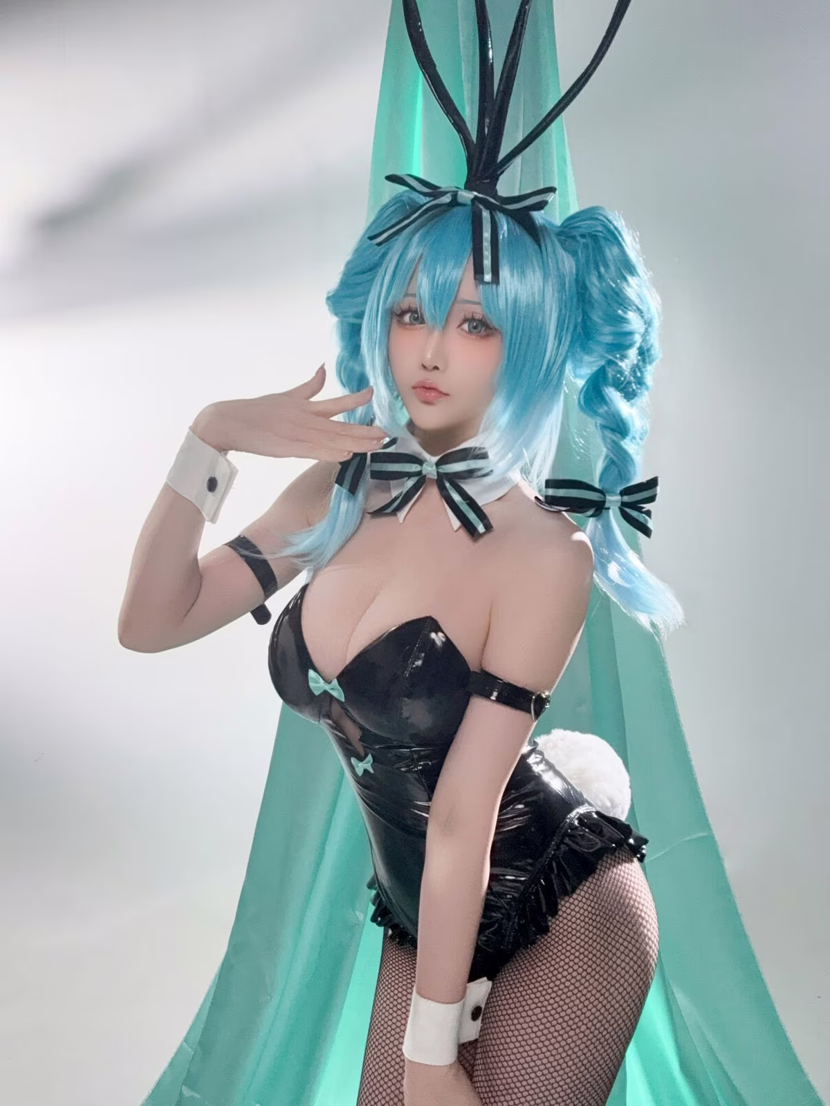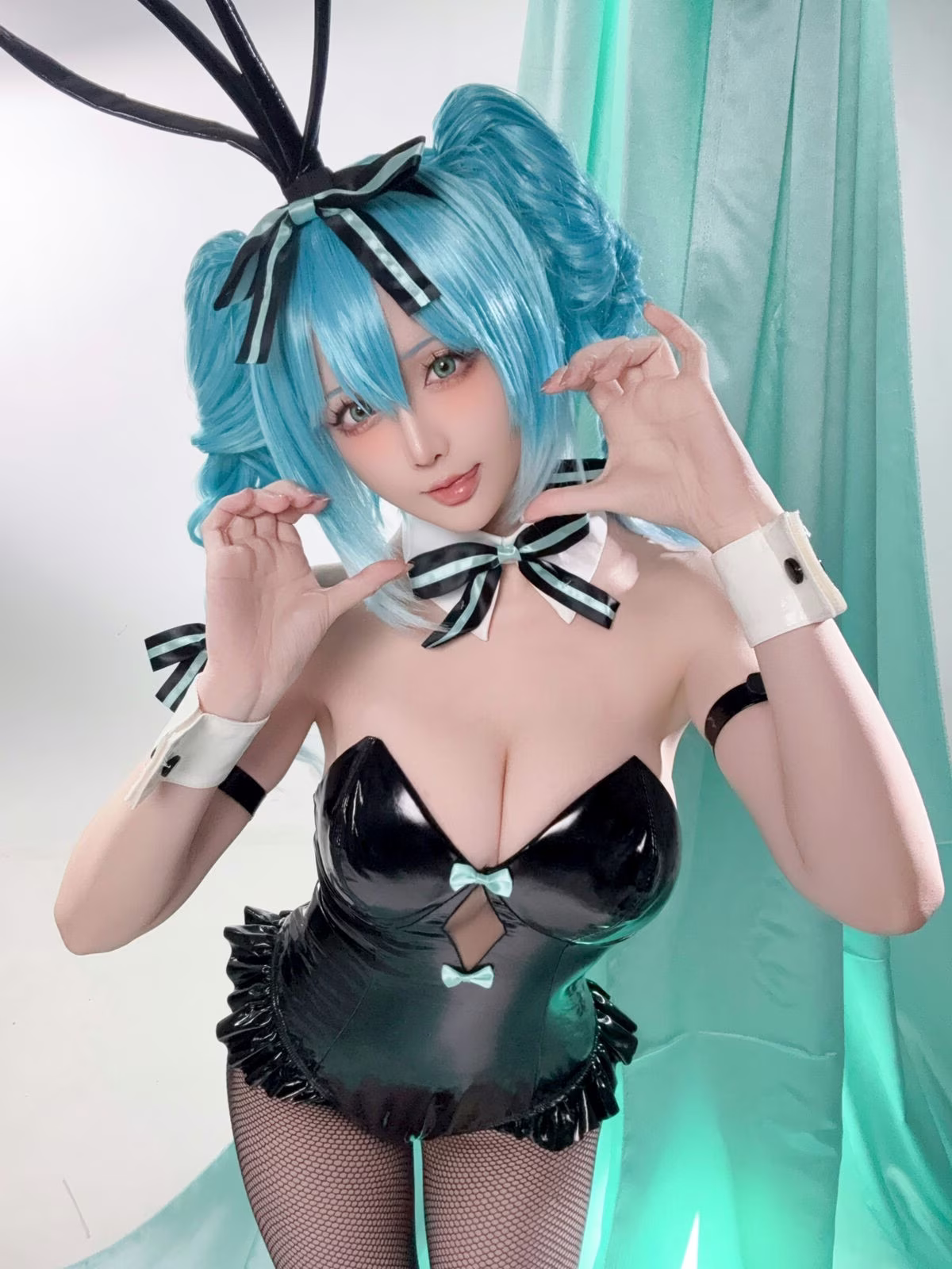 In this captivating image coser Xing Zhi Chi Chi also known as Hoshilily brings to life a stunning Hatsune Miku Bunny Girl. Dressed in a sleek black bunny girl outfit complemented by Miku's iconic blue hair and playful bunny ears Hoshilily radiates a beauty that is both alluring and distinctive. Every detail from the charming bow tie to the elegant white cuffs is meticulously crafted enhancing the character's unique style. The model's confident gaze and captivating demeanor truly infuse Hatsune Miku's persona with vitality creating a vivid and enchanting cosplay masterpiece that effortlessly draws every eye.