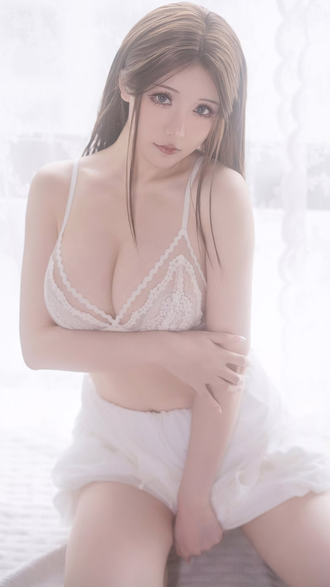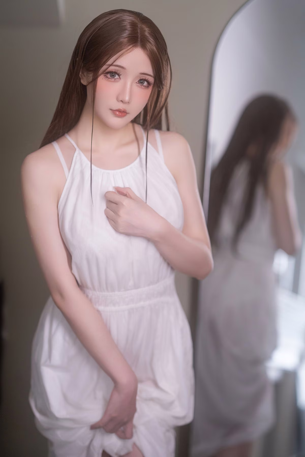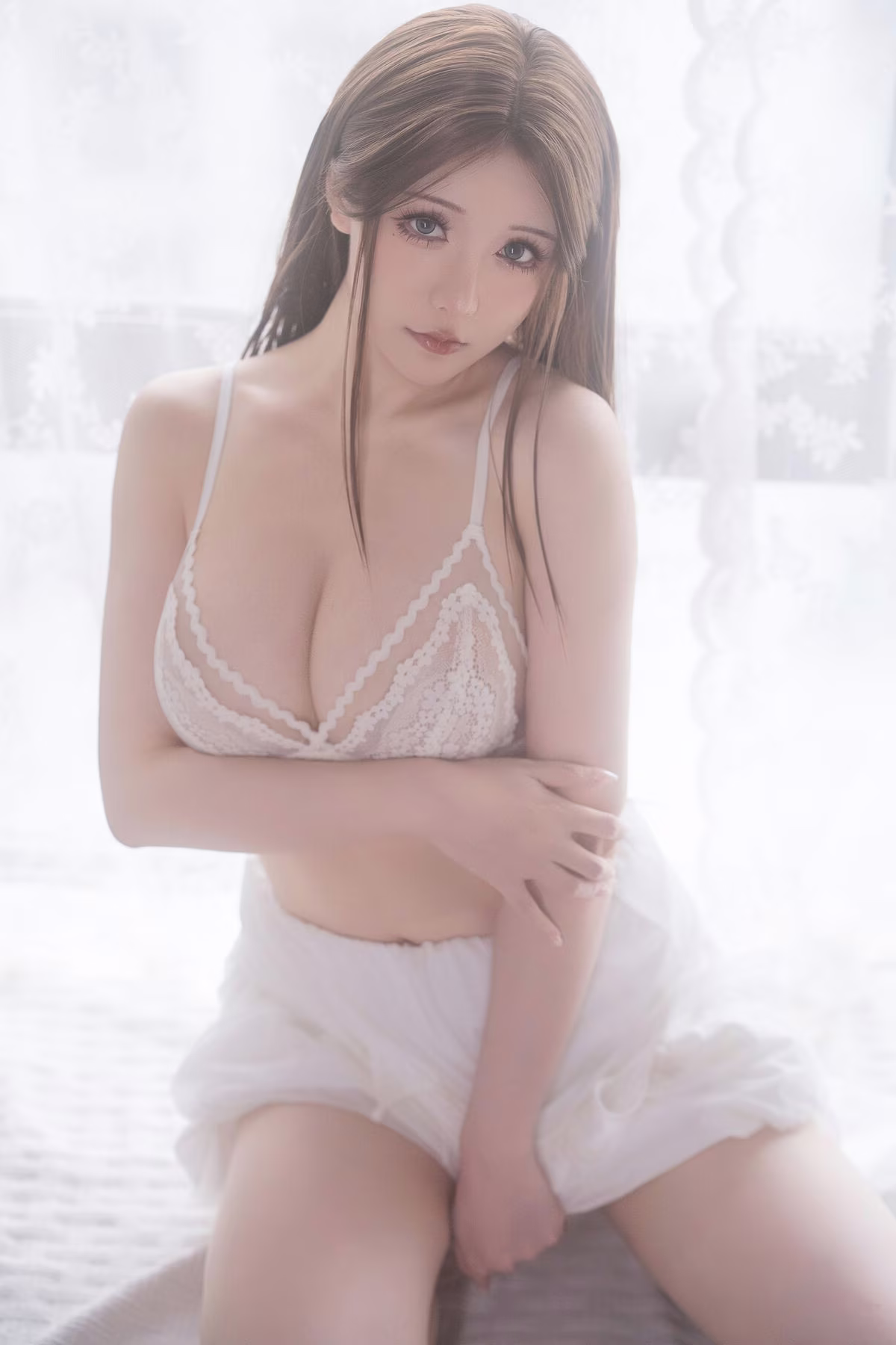 Immerse yourself in the captivating world of Coser Hoshilily (星之迟迟) with this stunning image from 'Wonderful Rainy Day Encounter' Part01. The renowned Chinese model Hoshilily radiates a delicate and irresistible charm. Bathed in soft, diffused light, she embodies an ethereal beauty, creating an intimate and serene atmosphere. Her gentle pose and contemplative expression evoke a sense of quiet introspection, perfectly complementing the 'rainy day' theme. This photograph beautifully captures a moment of grace and alluring elegance, inviting viewers to appreciate the subtle emotions and exquisite aesthetics presented by Hoshilily. Explore more from this unique collection.