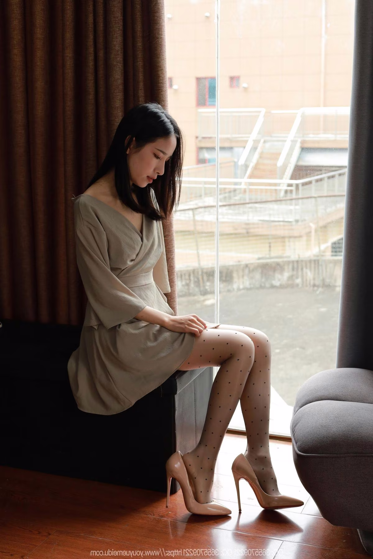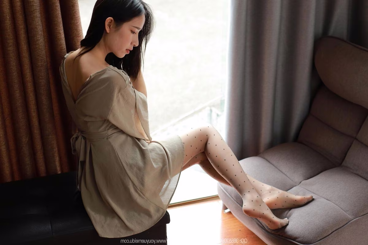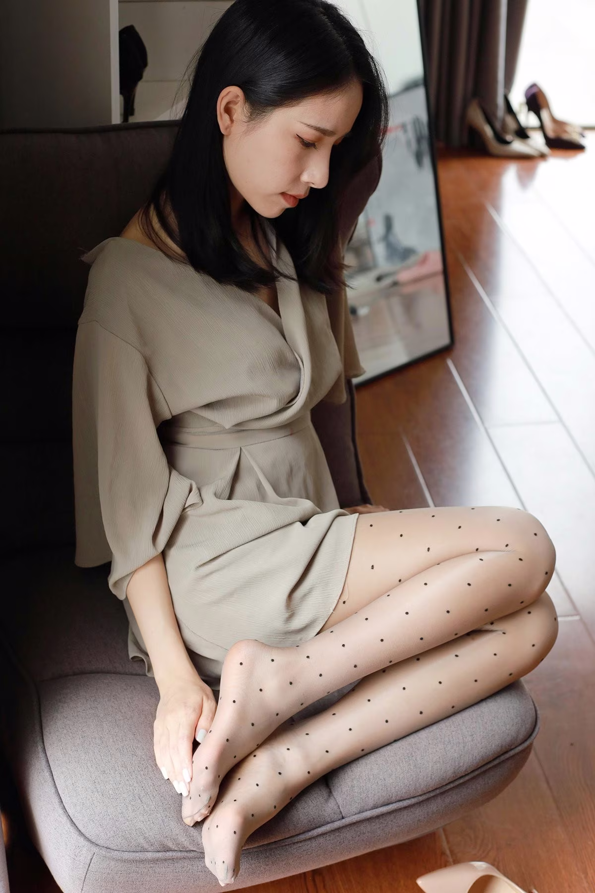 This captivating image captures a poignant moment of model Mei Zi from the IESS SXJ No.2061 collection. The Chinese model exudes an elegant and graceful charm, seated thoughtfully with a pensive gaze. Her light beige dress beautifully complements the unique polka dot stockings, highlighting her slender figure and sophisticated fashion sense. Every detail, from her smooth dark hair to her delicate feet, contributes to a perfect portrayal of understated allure. Viewers are easily drawn into Mei Zi's captivating aura and the subtle emotions conveyed through her expression and posture, offering an artistic and visually engaging experience.