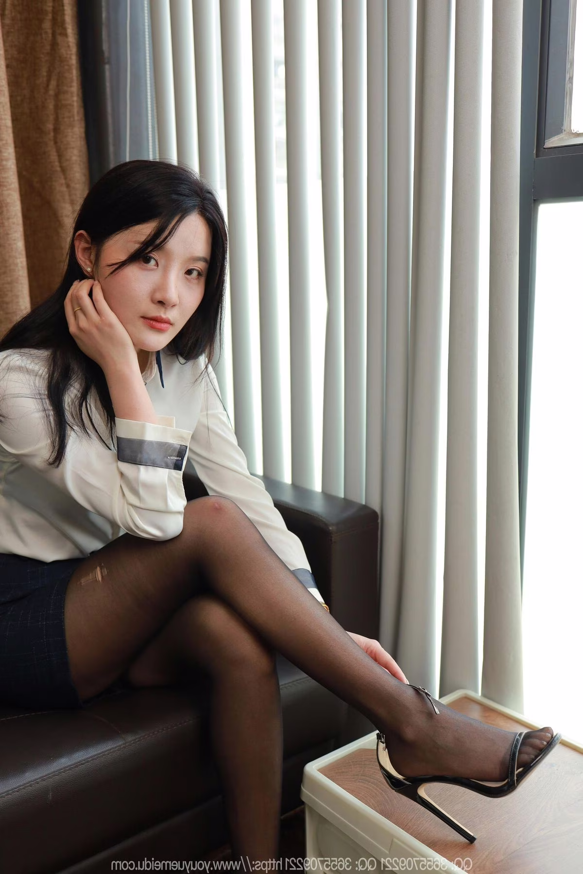 Wan Ping, a prominent model from the IESS SXJ No.2056 collection, exudes an irresistible elegance and charm. She sits gracefully on the sofa, her confident demeanor and direct gaze creating a strong connection. Her sophisticated office attire, featuring a crisp white shirt, dark skirt, paired with sheer black stockings and slender high heels, skillfully accentuates her slender figure and alluring contours. Every gesture, from the delicate placement of her hand to her poised posture, radiates professionalism and grace. The simple interior backdrop further highlights Wan Ping's beauty, offering an impressive glimpse into the style and aura of a modern Chinese model.Stories