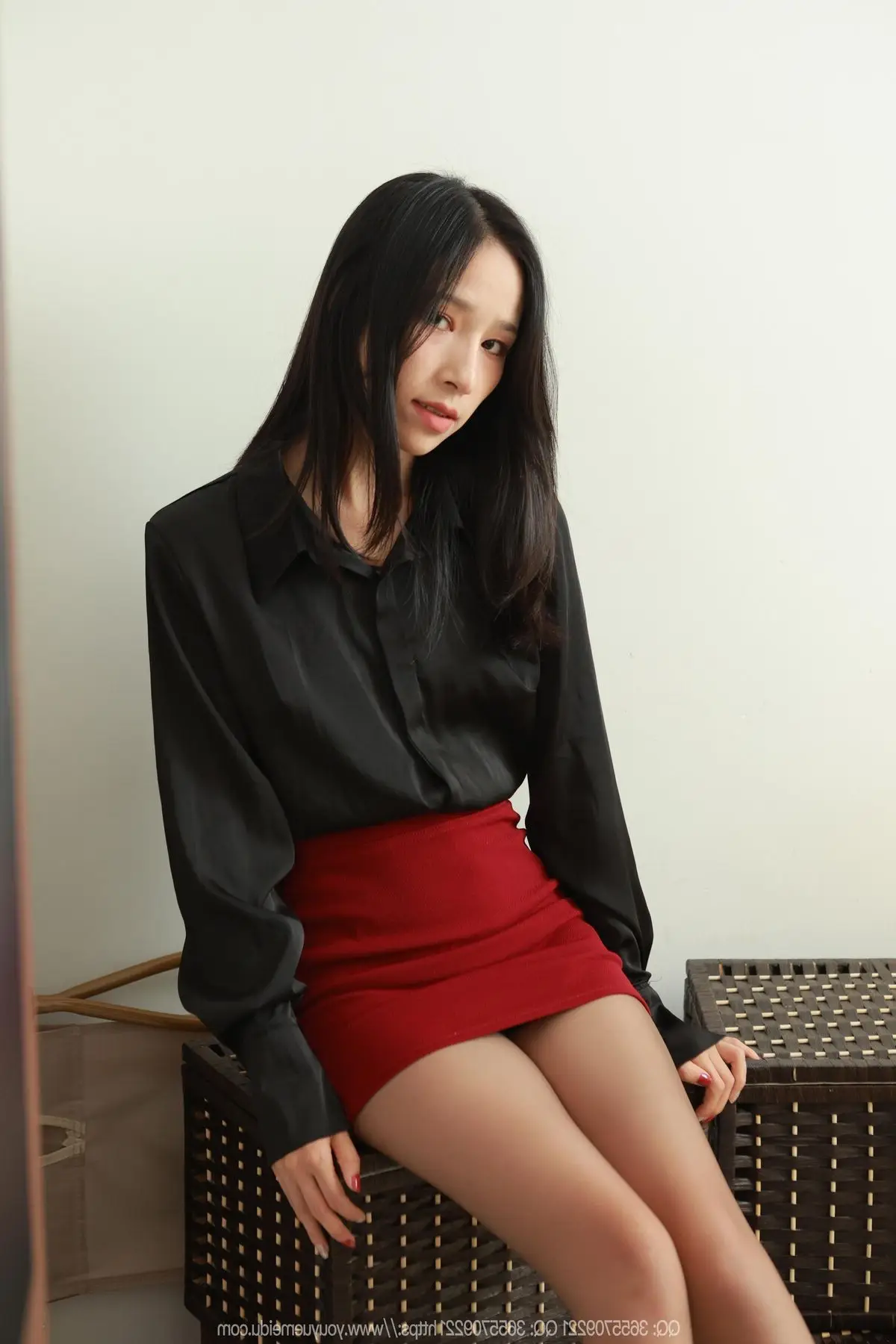 Mei Zi, a captivating Chinese model from the IESS SXJ No.2088 collection, exudes sophisticated charm and grace. In this striking image, she poses elegantly on a stack of stylish storage boxes, showcasing her slender legs in a vibrant red mini skirt paired with a chic black satin shirt. Her ensemble is completed with sheer pantyhose and classic black heels, creating a look that is both confident and subtly alluring. Mei Zi's gentle gaze and relaxed posture highlight the refined aesthetic characteristic of IESS photoshoots. The minimalist backdrop perfectly complements her captivating presence, promising viewers a visually stunning experience. This collection beautifully captures Mei Zi's distinctive style and professional artistry.#MeiZi #IESSModel #ChineseBeauty #RedSkirtStyle #FashionElegance
