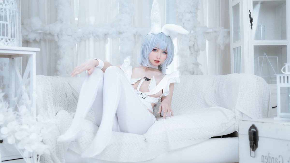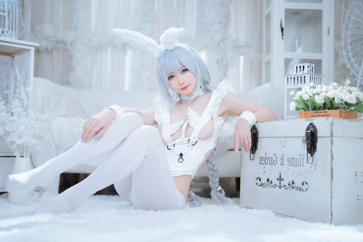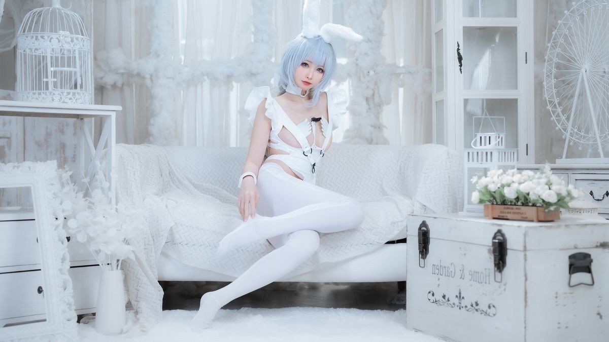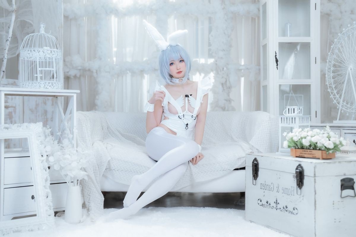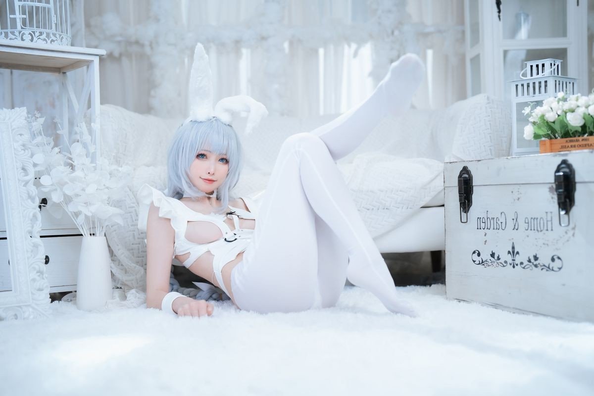 Coser@樱岛嗷一 captivates as the 'Evil Bunny Girl' in a stunning white cosplay ensemble. Her ethereal light blue hair and fluffy bunny ears create an innocent yet alluring contrast. The meticulously designed outfit features bold cutouts and delicate straps highlighting her graceful figure. With a subtle gaze and a hint of mischief 樱岛嗷一 embodies the character's unique blend of charm and edgy allure. This cosplay isnt just a portrayal its an artful interpretation that combines soft elegance with a distinctive unconventional style. The photoshoot leaves a lasting impression showcasing a captivating and memorable performance by Coser@樱岛嗷一.