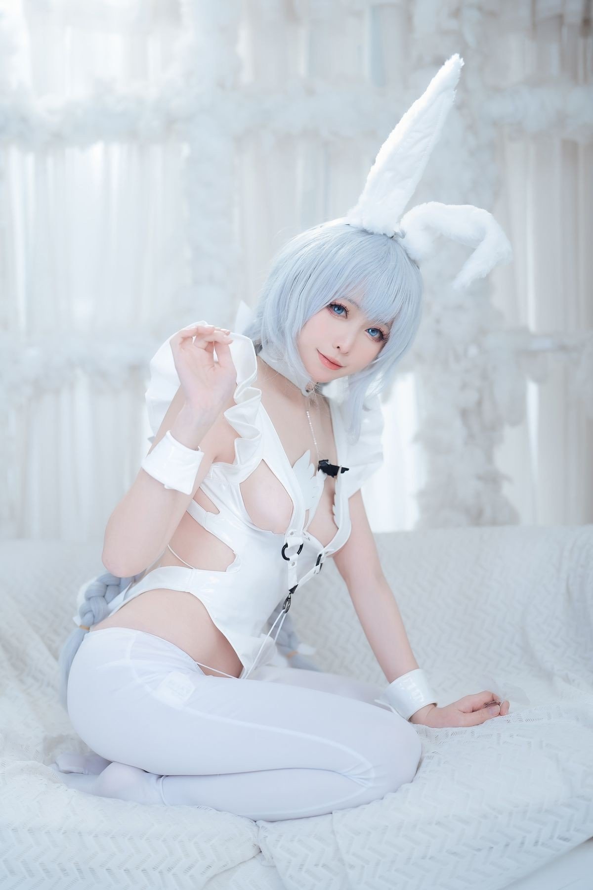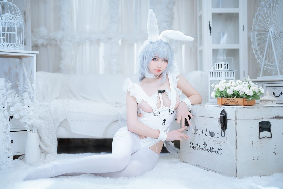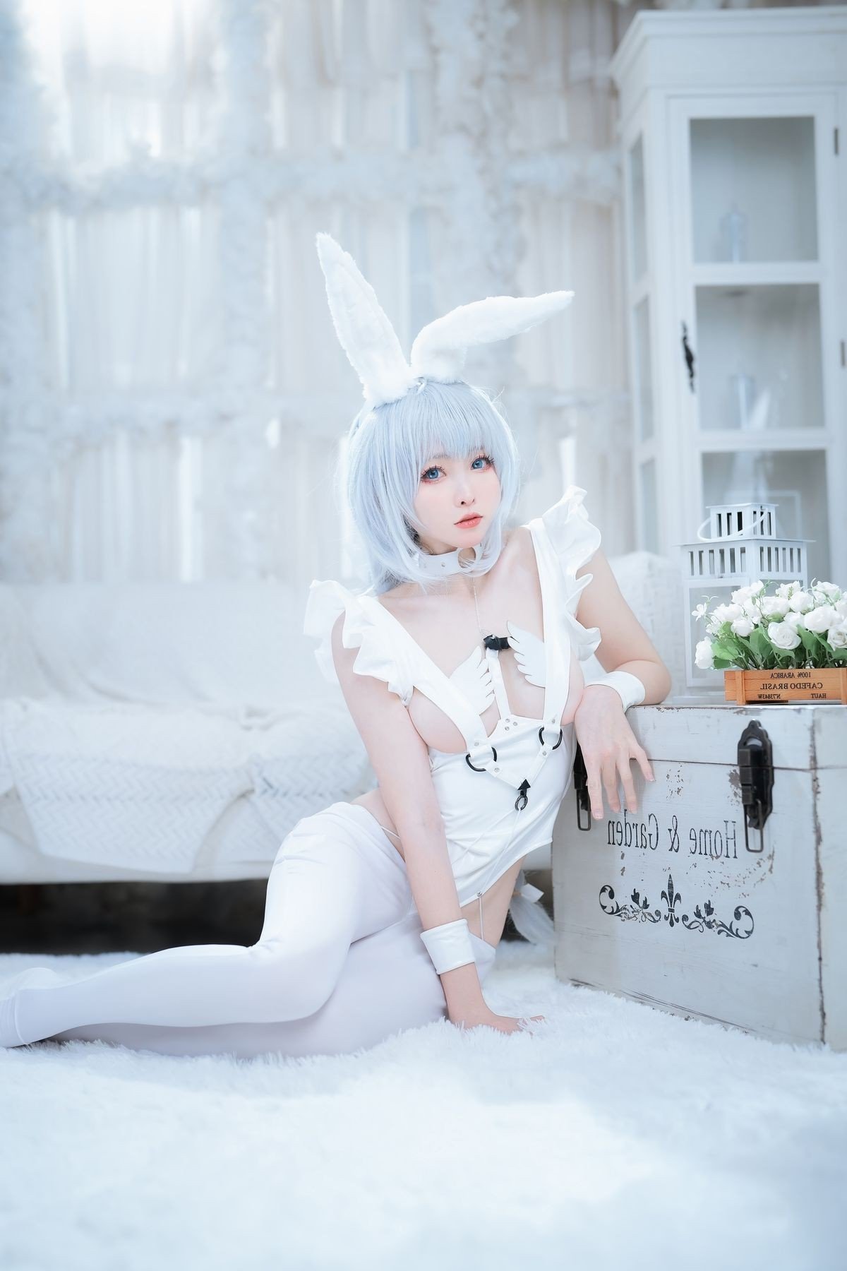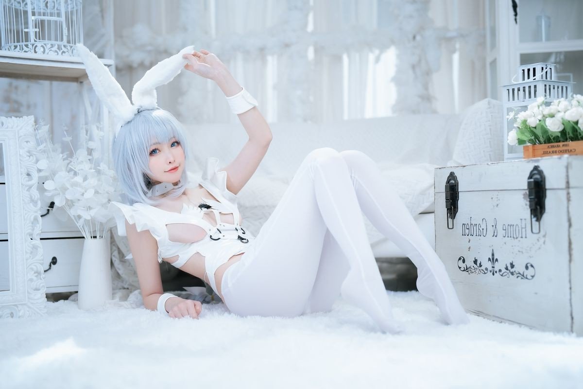 Coser@樱岛嗷一 captivates as the 'Evil Bunny Girl' in a stunning white cosplay ensemble. Her ethereal light blue hair and fluffy bunny ears create an innocent yet alluring contrast. The meticulously designed outfit features bold cutouts and delicate straps highlighting her graceful figure. With a subtle gaze and a hint of mischief 樱岛嗷一 embodies the character's unique blend of charm and edgy allure. This cosplay isnt just a portrayal its an artful interpretation that combines soft elegance with a distinctive unconventional style. The photoshoot leaves a lasting impression showcasing a captivating and memorable performance by Coser@樱岛嗷一.