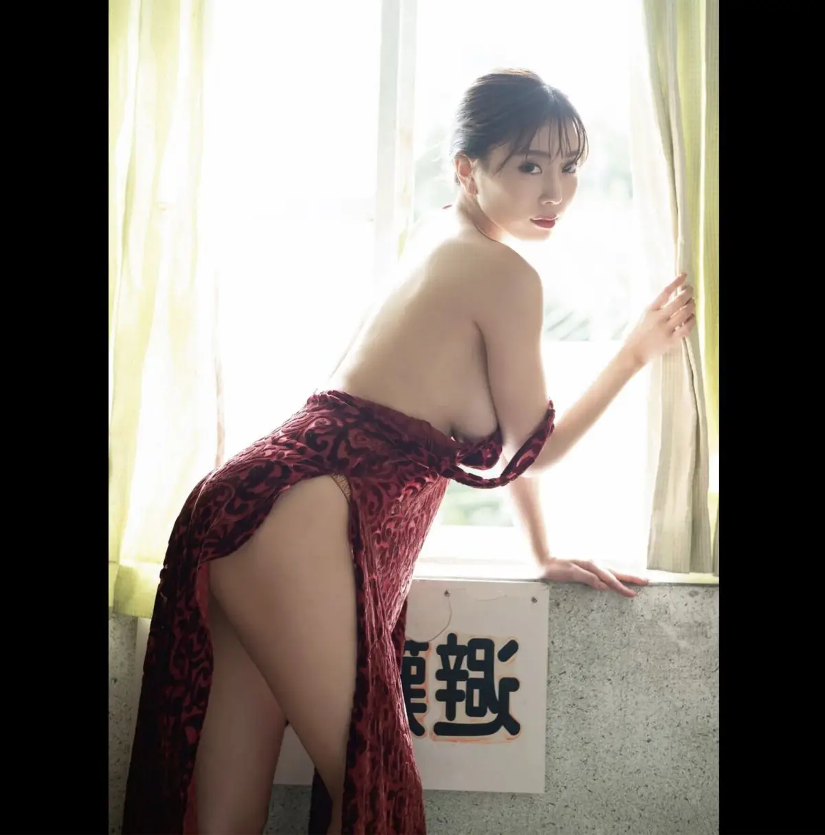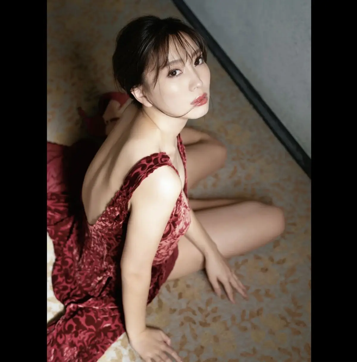 In this striking image, Morisaki Tomomi radiates a captivating blend of sensuality and elegance. Dressed in a luxurious, deep red garment, its soft fabric gracefully accentuates her form, revealing alluring bare shoulders. The gentle backlight illuminates her smooth skin and neatly styled hair, creating a romantic and emotionally rich atmosphere. The subtle gesture of her gently adjusting the strap is an unspoken invitation, drawing all eyes to her magnetic presence. This photograph beautifully embodies the distinctive charm found throughout the Nectar digital photobook, where Tomomi fully showcases her irresistible allure.#MorisakiTomomi #NectarPhotobook #JapaneseBeauty #SensualElegance #DigitalPhotoBook