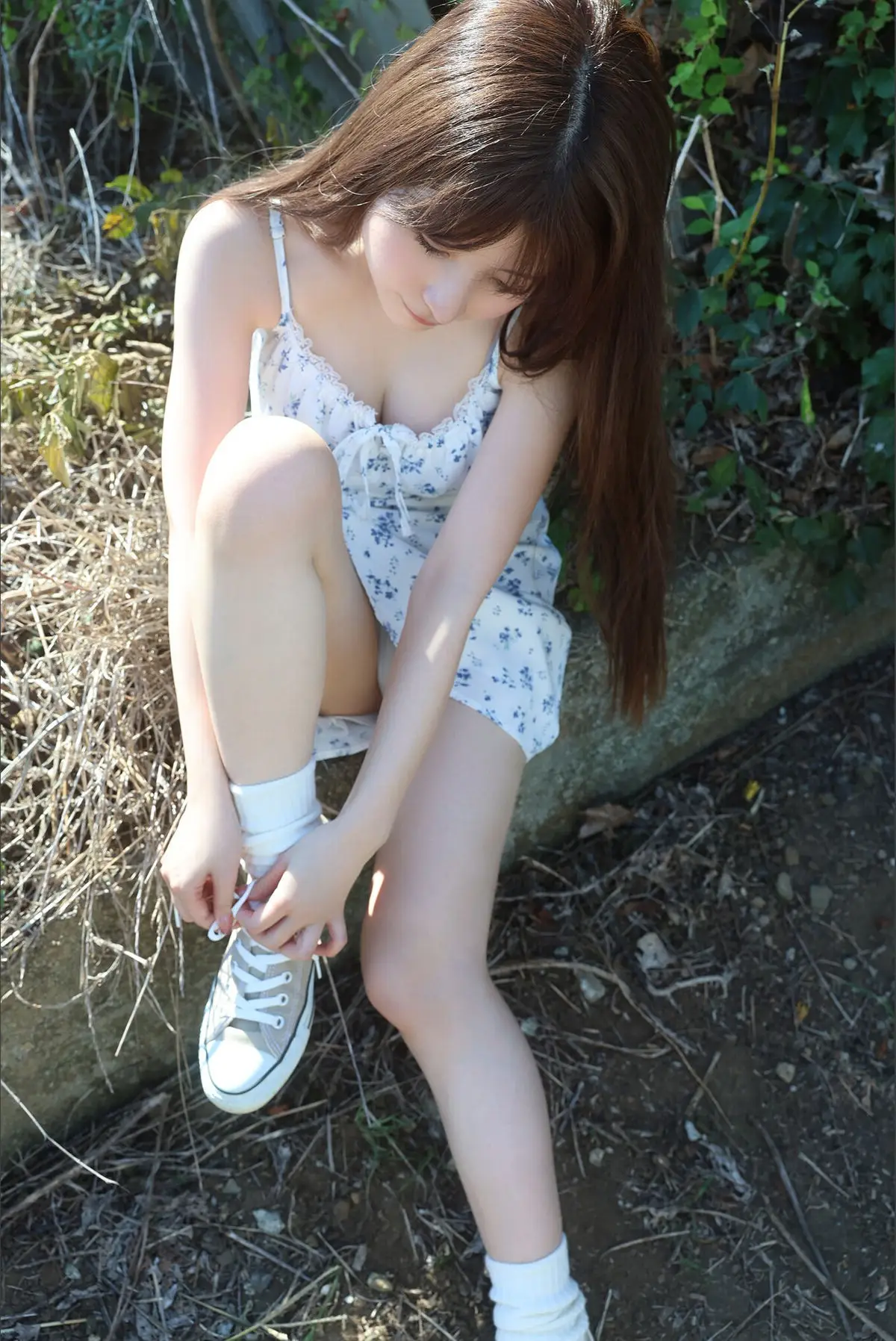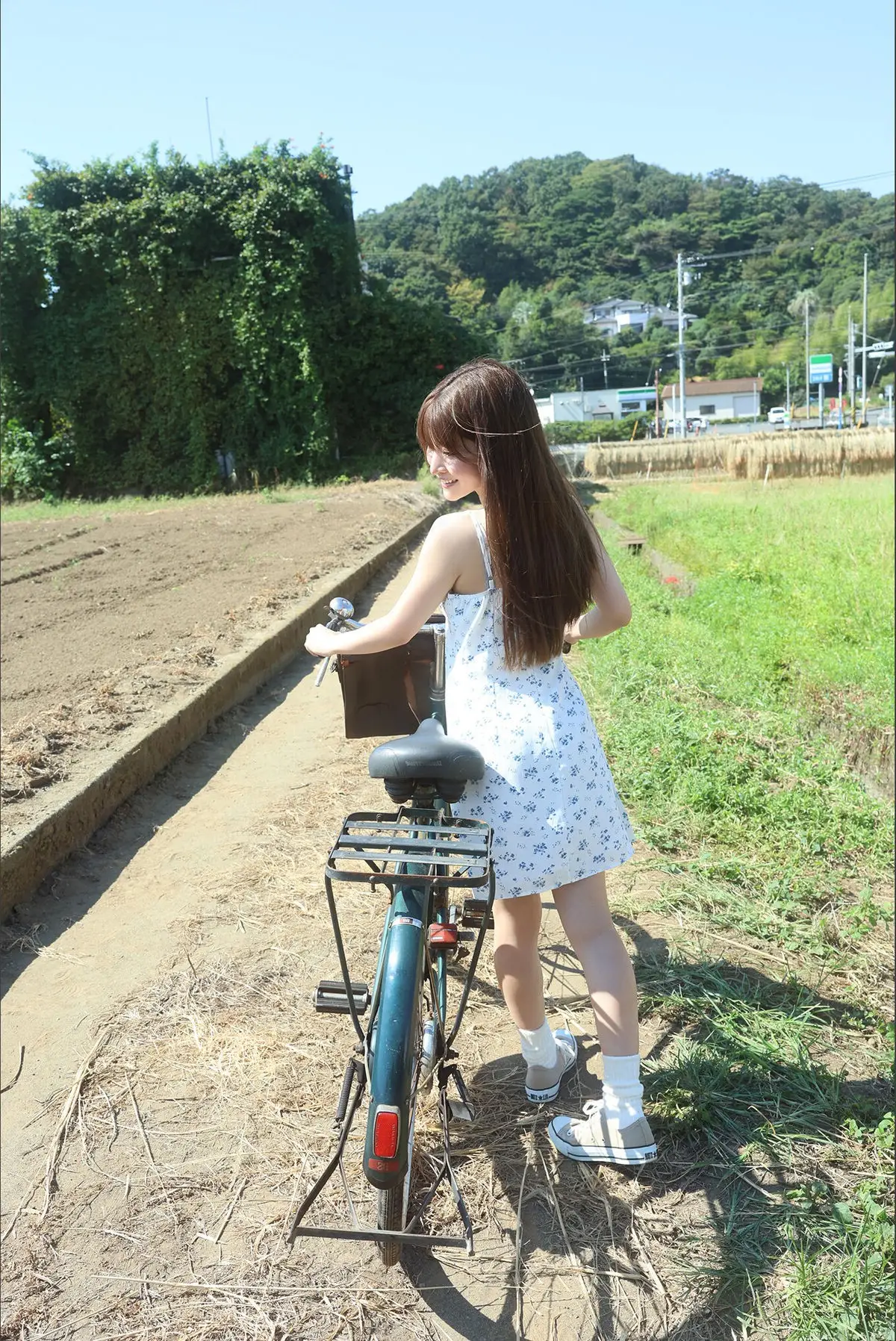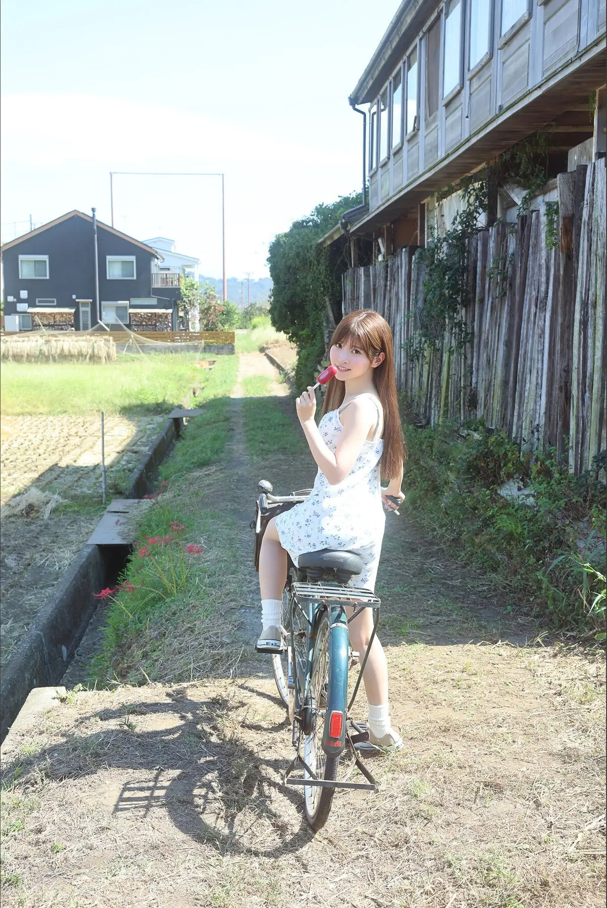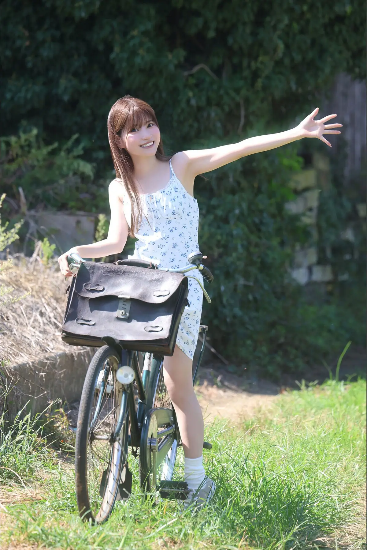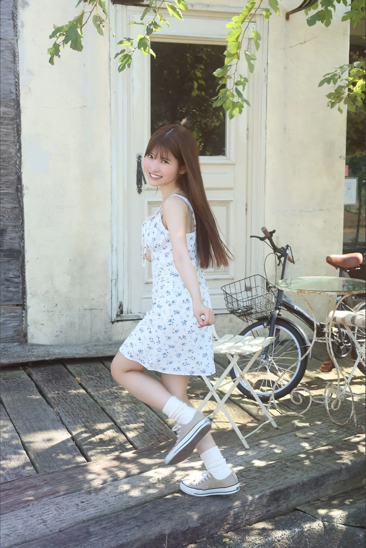 This image captures a refreshing moment of Rui Takanashi (小鳥遊るい) on a bright sunny summer afternoon. The Japanese model wears a delicate floral sundress paired with casual sneakers exuding a graceful and vibrant charm. The backdrop features a quaint white building a vintage bicycle and wooden steps creating a rustic and inviting atmosphere. Rui Takanashi's radiant smile and clear eyes illuminate the scene conveying a sense of peace and lightness. This picture is part of her FRIDAY digital photo book beautifully showcasing her youthful elegance and innocent spirit. The scene evokes a feeling of freedom and ease much like the implied theme Even without wings inviting viewers to appreciate her natural beauty and the simple joys of a summer day.#RuiTakanashi #JapaneseModel #FRIDAYPhotobook #SummerVibes #AsianBeauty