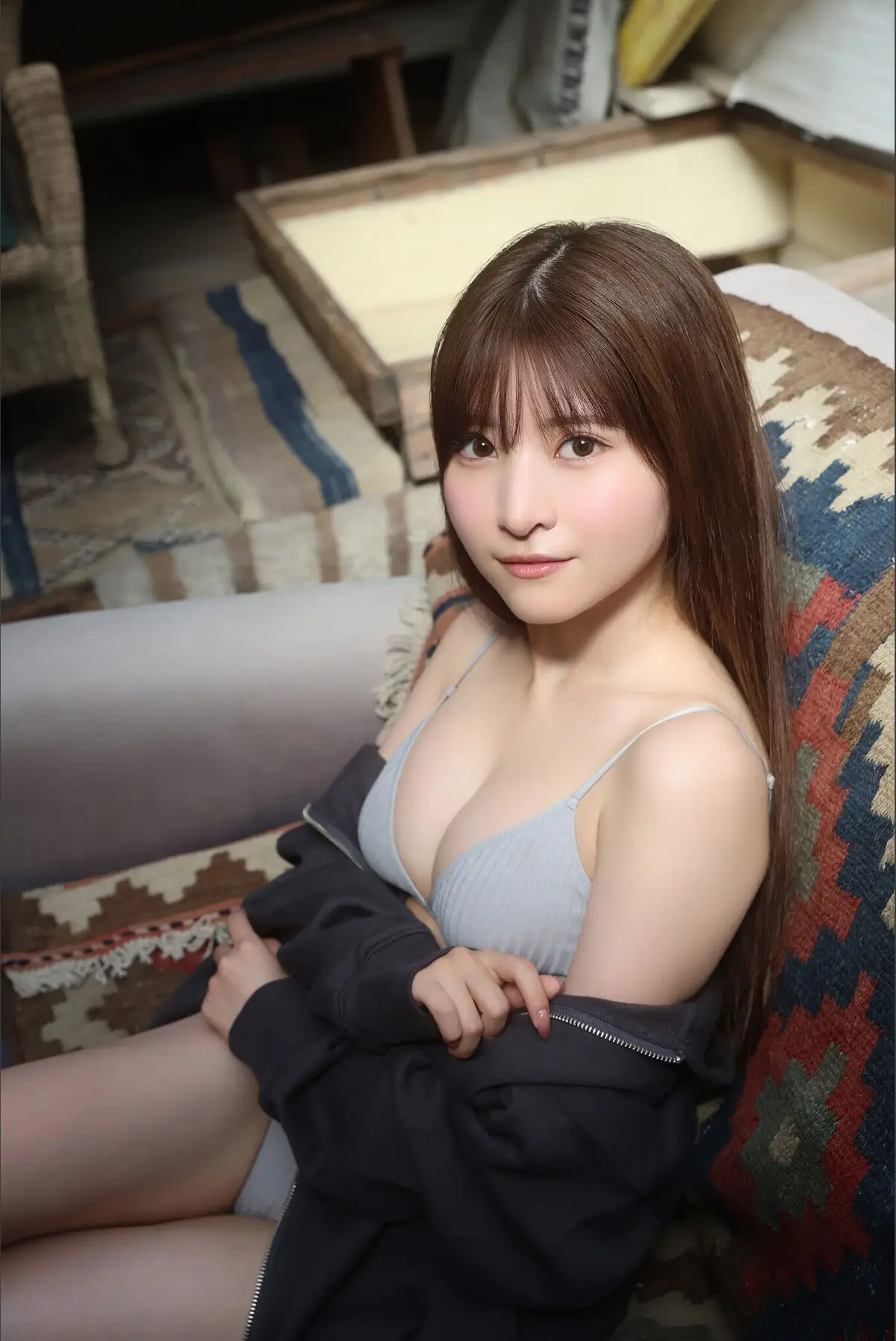 This captivating image showcases the delicate yet alluring beauty of Rui Takanashi 小鳥遊るい from her 翼がなくても Even Without Wings FRIDAY Digital Photo Book. The Japanese model gazes directly at the viewer, her finger gently resting on her chin, conveying a moment of thoughtful introspection. Her fair complexion and soft brown hair accentuate her natural charm, while the subtle light grey innerwear gracefully highlights her slender figure. The intimate, warm setting, bathed in soft ambient light, enhances the sense of closeness and authenticity. Rui Takanashi exudes an elegant grace, perfectly embodying the theme Even Without Wings – a beauty that is self-possessed and impactful without needing ostentation. This deeply emotional portrayal evokes a sense of discreet allure and profound inner character.#RuiTakanashi #小鳥遊るい #EvenWithoutWings #FRIDAYDigital #JapaneseModel