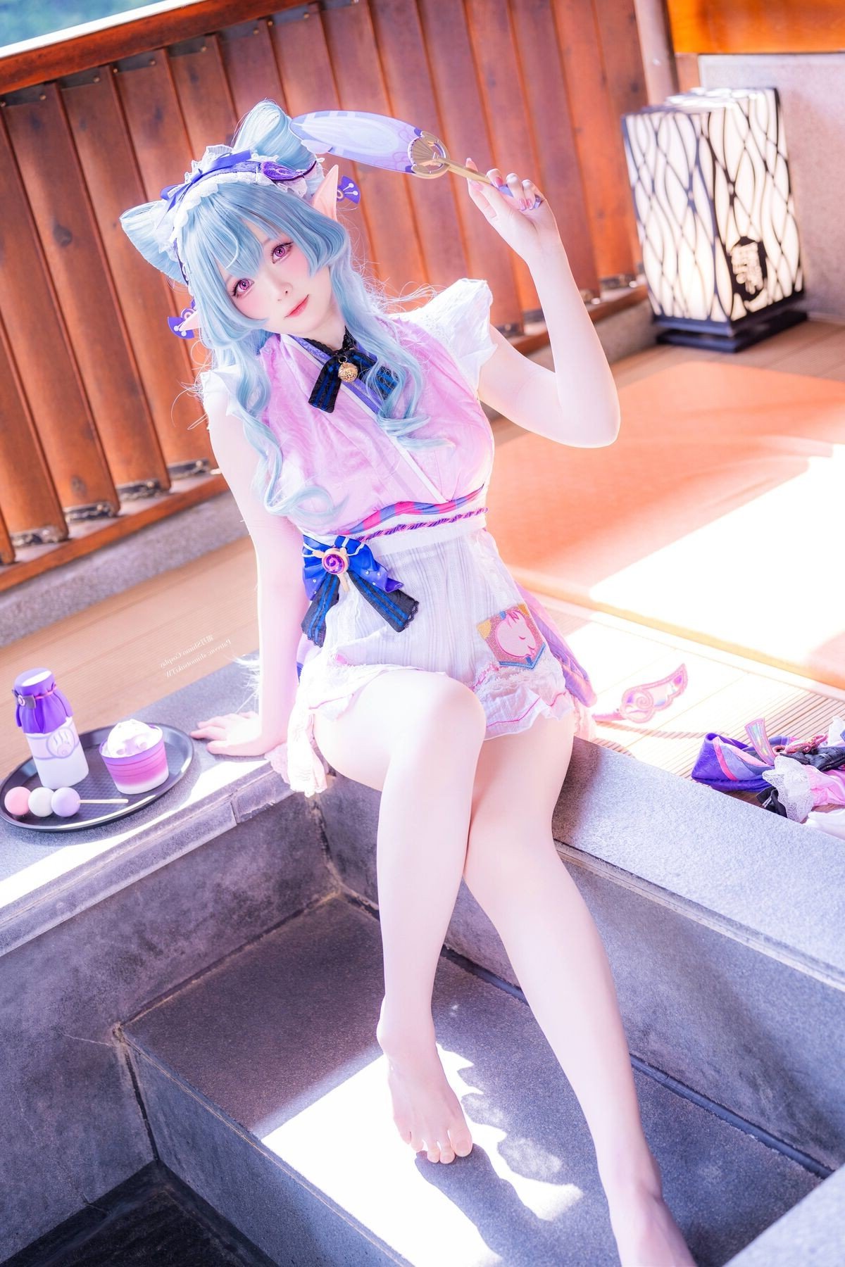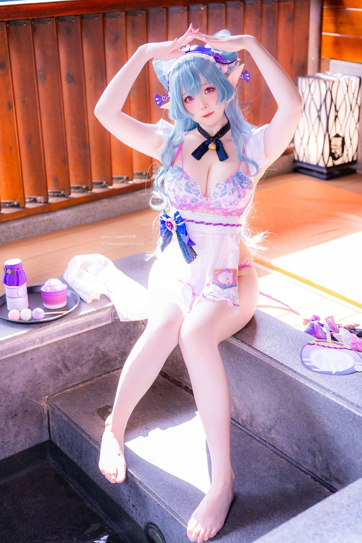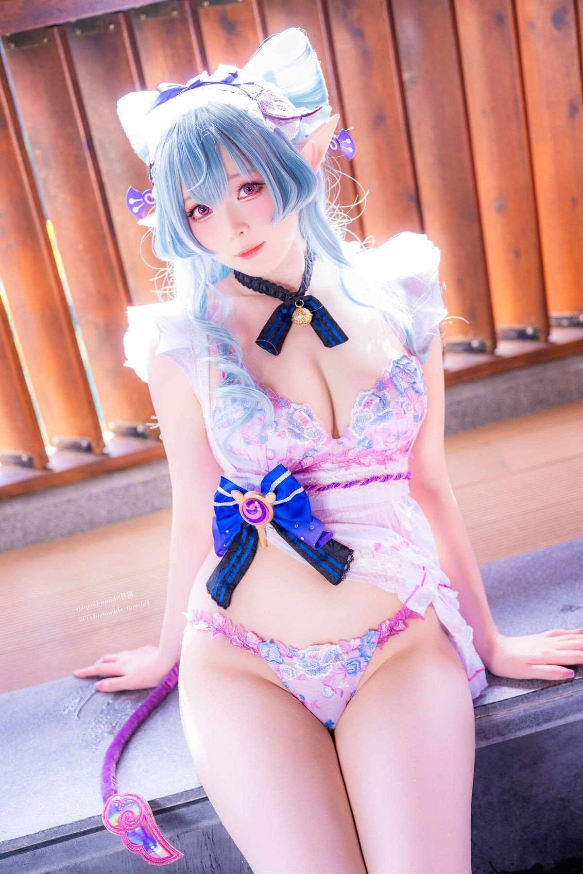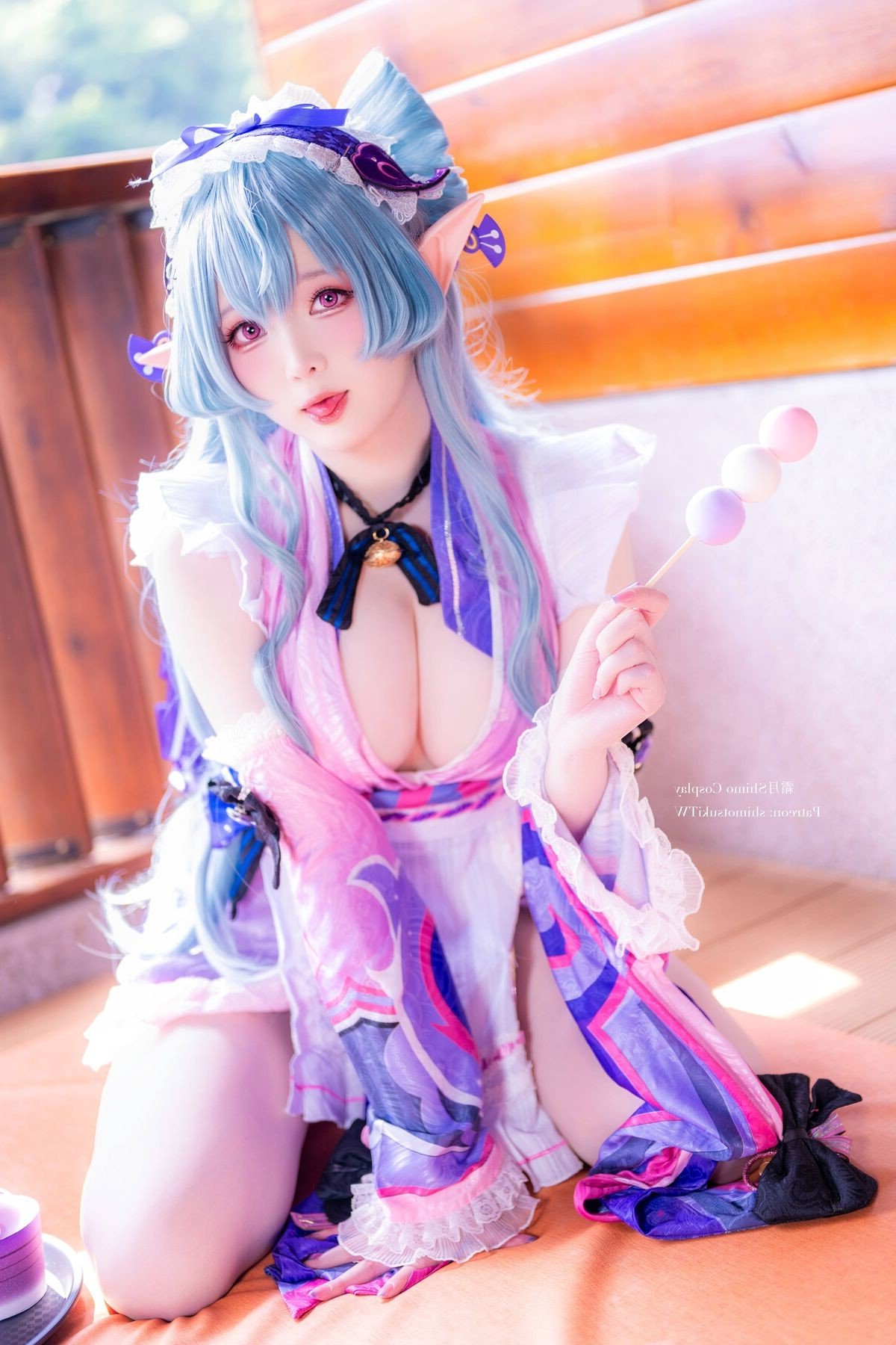 In this enchanting photograph coser Shimo Tsukigami masterfully embodies the character Yumemizuki Mizuki radiating a sweet and charming appeal. Her flowing pastel blue hair and playful elf ears give her an ethereal aura. The stylized maid outfit in soft pink white and blue creates a harmonious and captivating visual. Meticulously detailed bows and ruffles further enhance her innocent and delicate appearance. Seated in a cozy setting reminiscent of traditional Japanese aesthetics Shimo Tsukigami appears as a muse stepping out of a fairytale. This image not only showcases exceptional cosplay talent but also conveys a sense of joy and dreaminess. It is a stunning piece of cosplay art perfect for fans of kawaii aesthetics and adorable characters.Stories