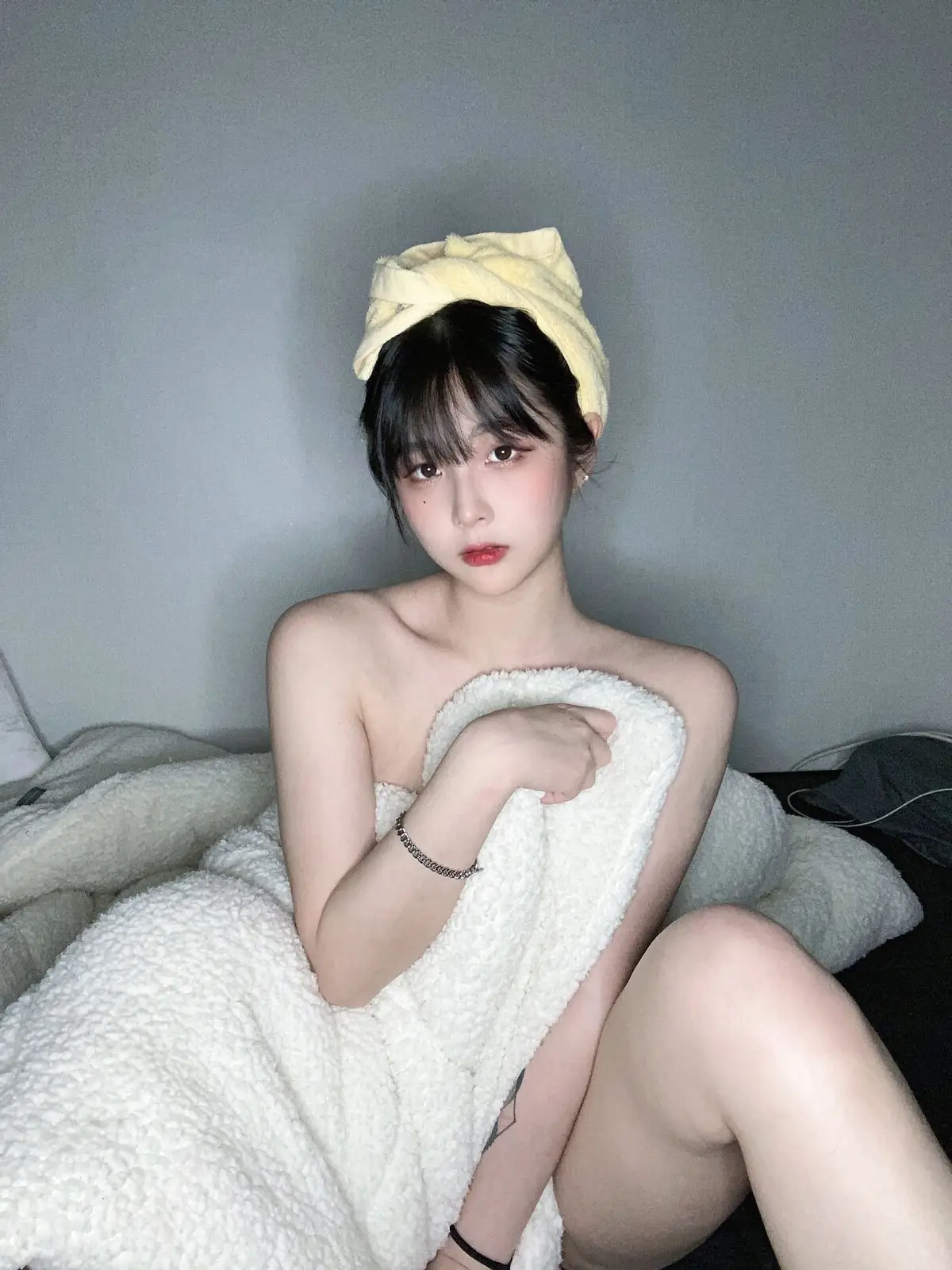 In this photo, model Soonj1n (순진이) appears with an irresistibly pure and captivating beauty. She poses in a simple yet alluring white bikini, highlighting her smooth fair skin and soft body contours. Her long natural black hair frames her delicate face, and her large round eyes look directly into the camera, creating a gaze that is both gentle and profound. Soonj1n's subtle, slightly shy expression evokes a sense of intimacy and authenticity. The simple background entirely emphasizes her natural beauty and grace, making it impossible for viewers to look away from this special charm. This image is typical of Soonj1n's style, where innocence blends with subtle allure.#Soonj1n #Bikini #KoreanModel #PureBeauty #Alluring