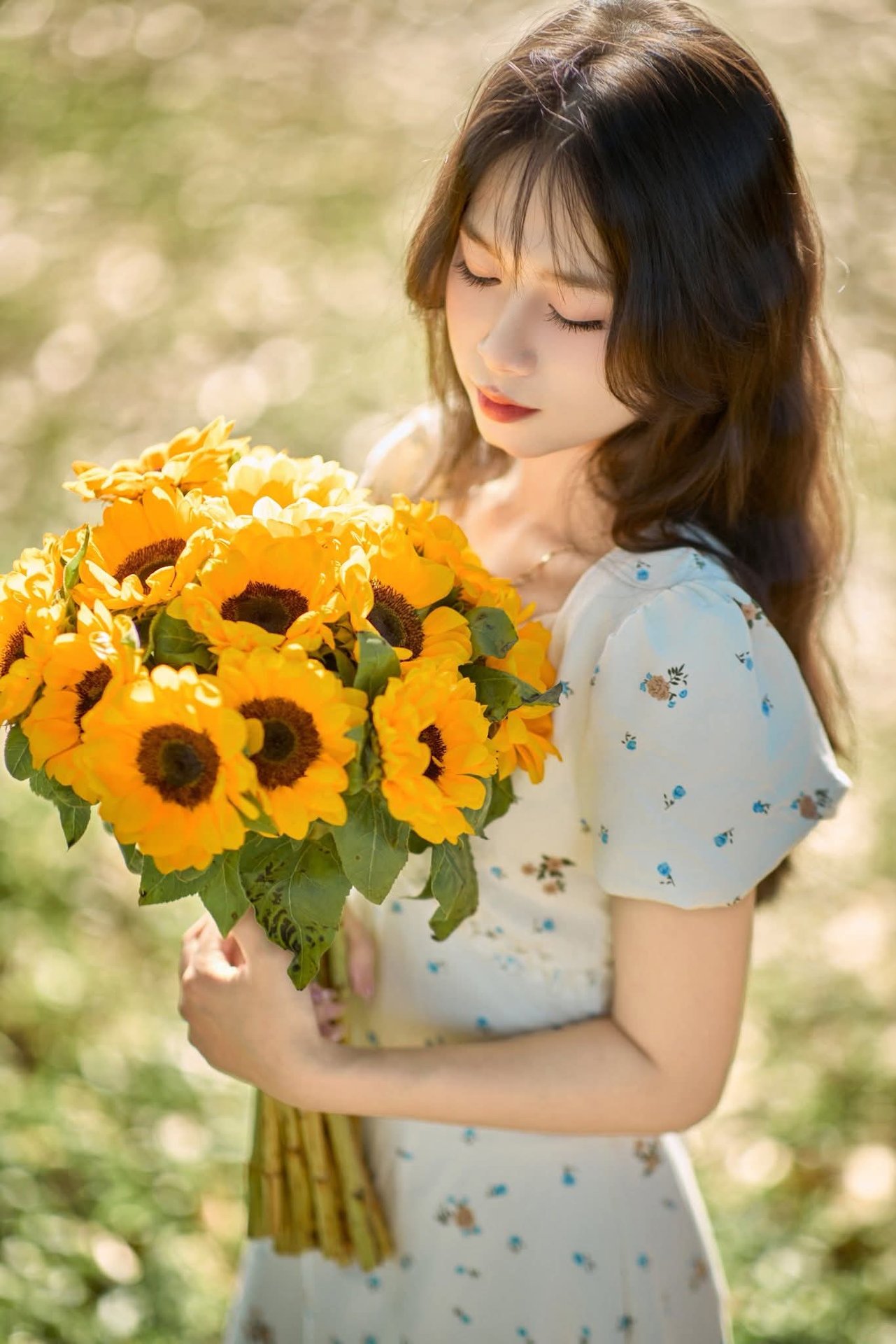 This stunning photograph captures a charming woman radiating grace and a bright smile illuminating the fresh natural landscape. Dressed in a delicate floral dress she elegantly holds a vibrant bouquet of yellow sunflowers symbols of optimism and joy. Gentle sunlight filters through the leaves creating a poetic backdrop that enhances the person's natural beauty. The image of this beautiful woman blending seamlessly with nature evokes a sense of peace and radiates positive energy showcasing the harmonious connection between humans and their surroundings. It is a truly captivating and lively moment.Serene Vietnamese Beauty: Woman in Ao Dai by the Lake