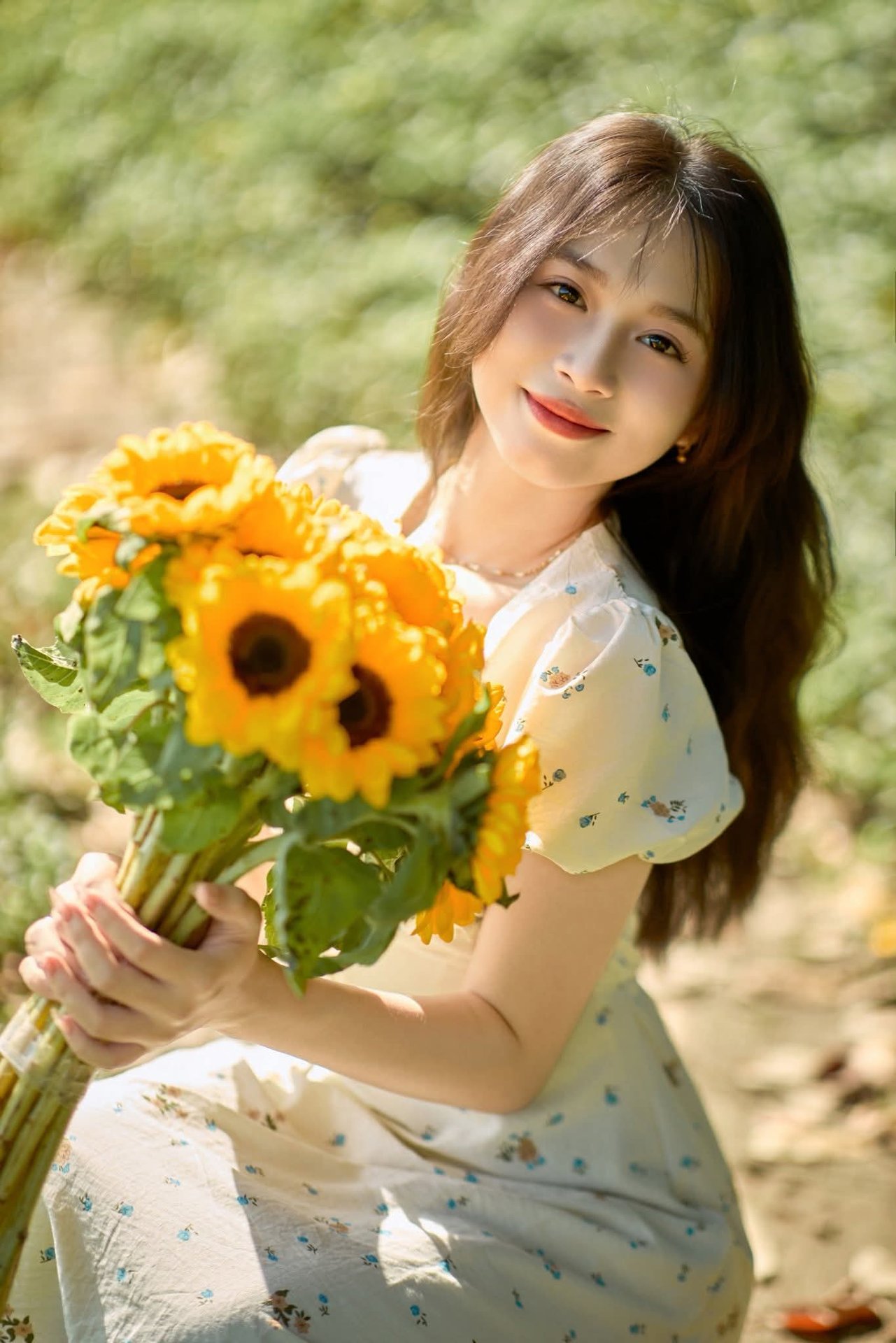This image XVG No.2 captures the gentle and ethereal beauty of a Vietnamese girl amidst a space overflowing with vibrant flowers. She sits gracefully on a simple wooden chair in a pristine white off-shoulder dress with her long dark hair softly cascading. Her gaze is distant conveying a dreamy and peaceful aura as she delicately holds a small yellow flower. Surrounding her is a lush green landscape adorned with tiny orange and yellow blossoms creating a romantic and lively natural setting. This scene not only celebrates the traditional charm of Vietnamese women but also evokes a profound harmony between humanity and nature a truly captivating moment of tranquility.