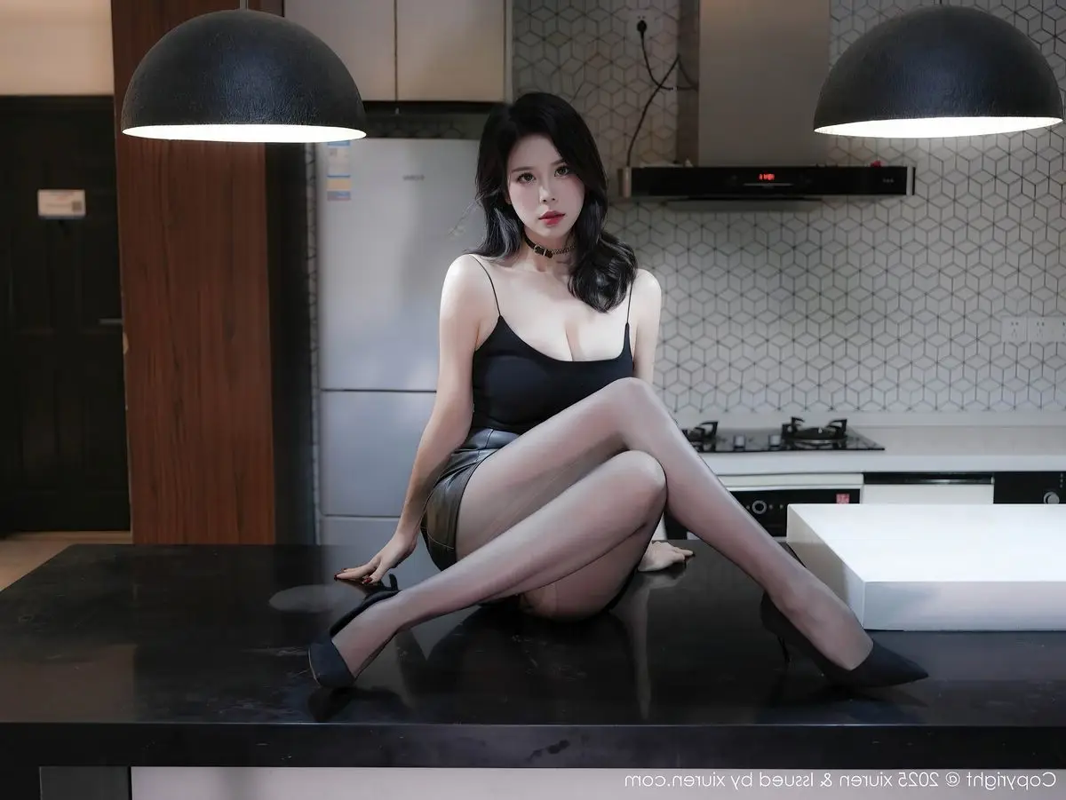This image from the XiuRen No.10523 collection showcases the captivating beauty of model Mei Gui Wo Ai Ni. She exudes confidence and elegance dressed in a form-fitting black spaghetti strap top and an alluring glossy leather-look mini skirt. Her enchanting demeanor and profound gaze create an irresistible appeal. Mei Gui Wo Ai Ni gracefully leans against a modern kitchen counter highlighting her figure and sophisticated style. This photograph not only captures her striking physical beauty but also radiates a graceful sensual aura. It is an emotionally rich artistic moment sure to delight admirers of the fusion between fashion and East Asian aesthetics.#XiuRen #MeiGuiWoAiNi #AsianModel #SexyFashion #LeatherSkirt