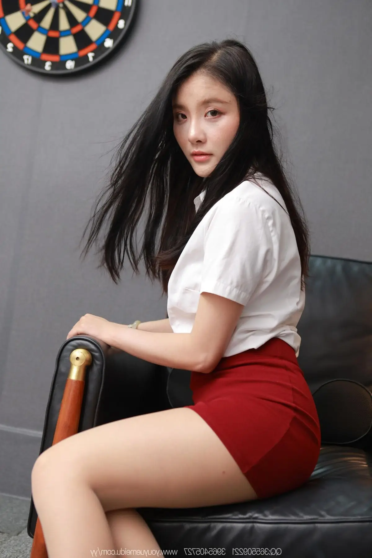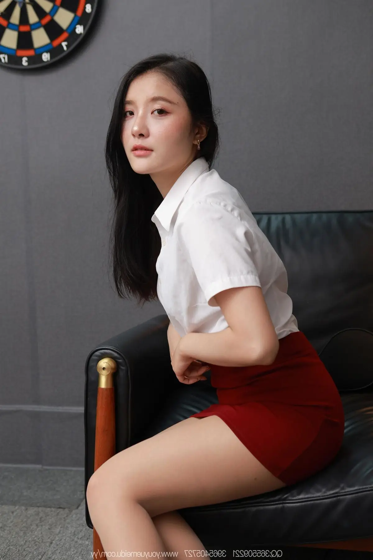 In this IESS SXJ No.2113 photo series, Secretary Wan Ping makes a striking appearance with her professional demeanor and elegant beauty. She wears a pristine white shirt paired with a vibrant red skirt, creating a harmonious blend of office seriousness and subtle allure. Her relaxed posture on the black leather armchair accentuates her long, slender legs, exuding confidence and charm. The modern office setting, complete with familiar items like a coffee machine, enhances the authenticity, making viewers feel immersed in her workspace. Wan Ping is not just a mere secretary but an icon of style and grace in the workplace, offering endless inspiration.#WanPing #OfficeLady #Secretary #IESS #BusinessFashion #ChineseModel