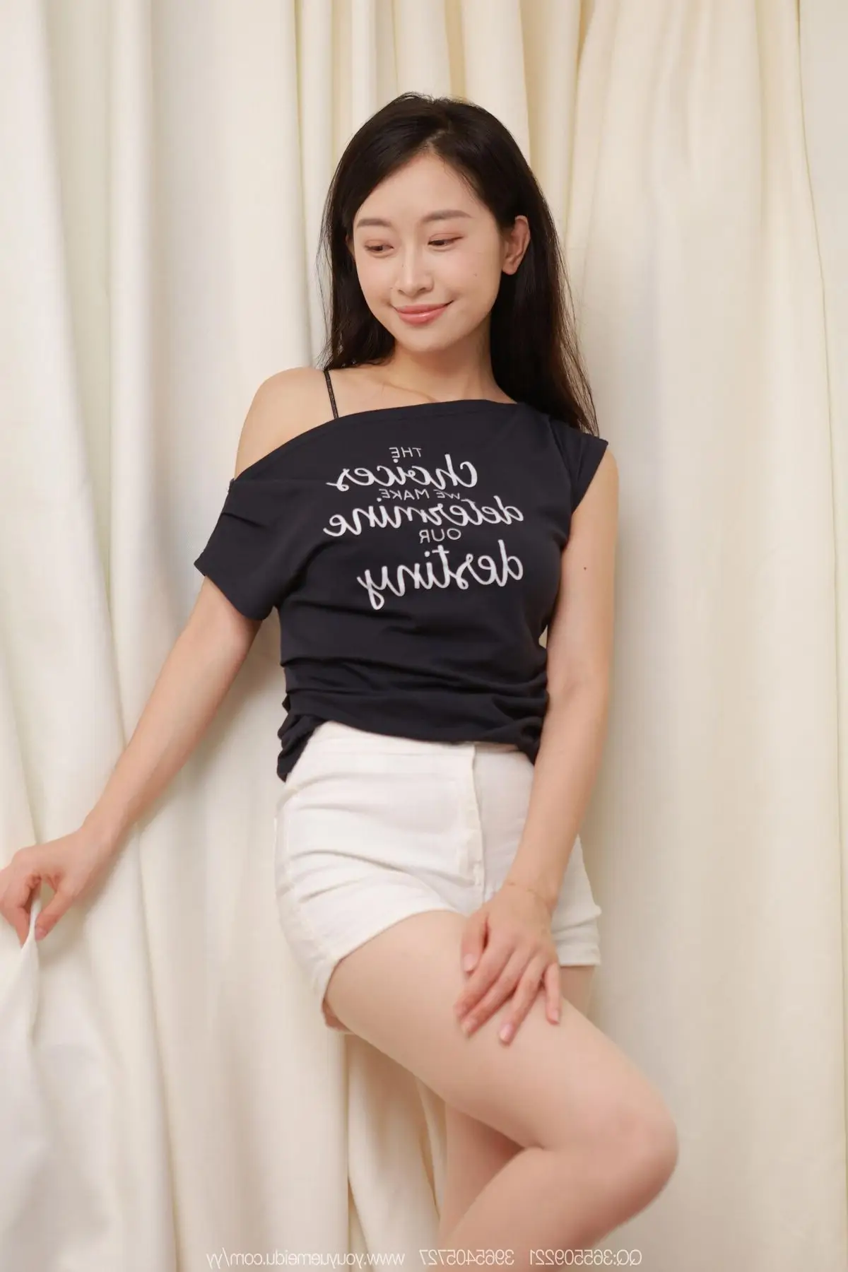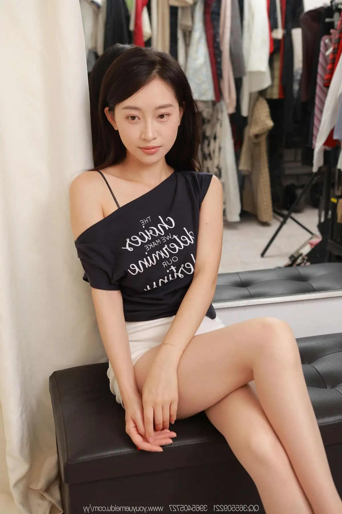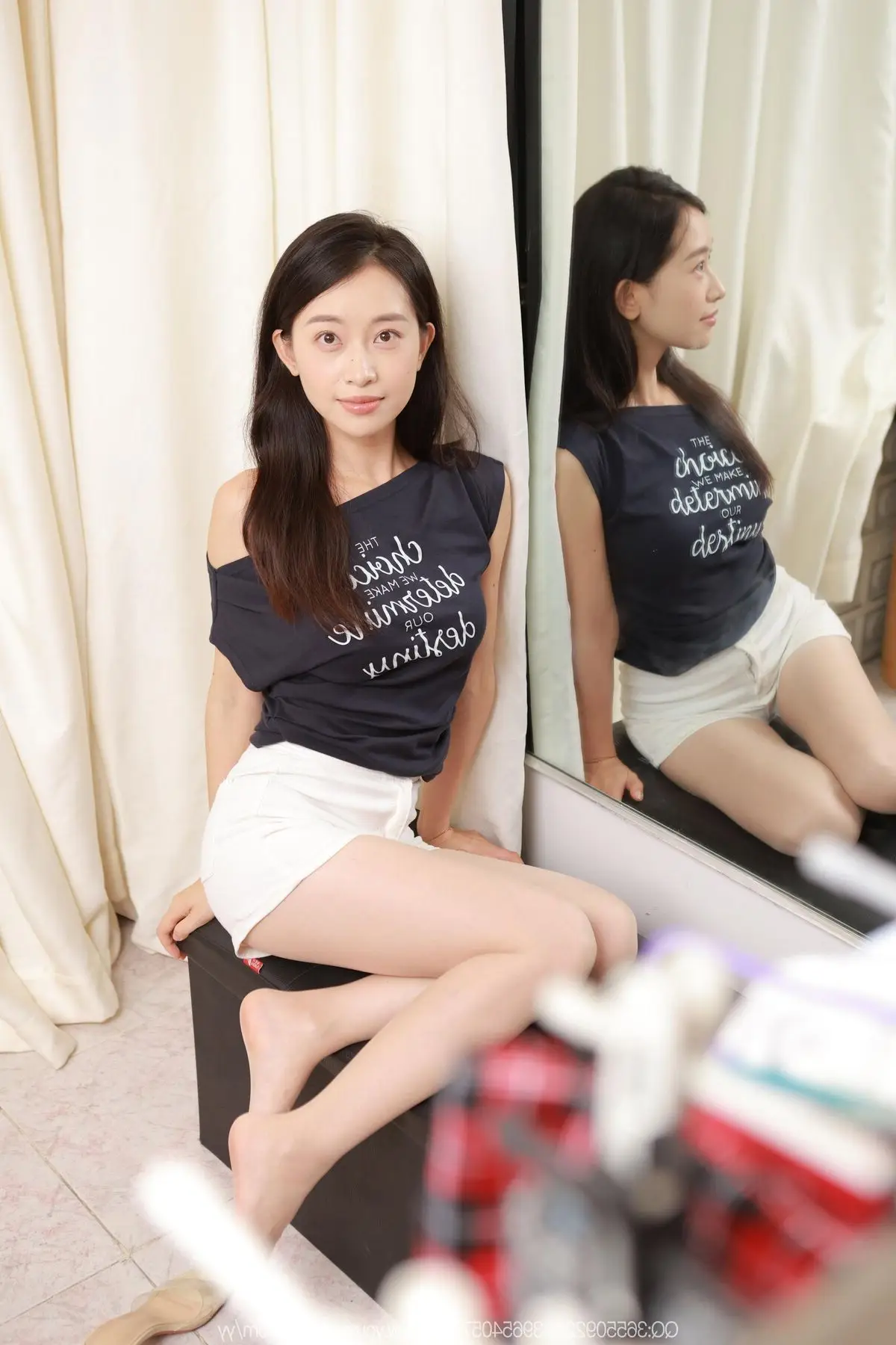 This exquisite photograph captures a graceful moment of model Xiao Jie from the IESS SXJ No.2143 series. With a radiant smile and friendly eyes Xiao Jie exudes natural and captivating beauty. She is dressed in a dark blue off-shoulder t-shirt paired with simple white shorts accentuating her slender figure and long graceful legs. Her relaxed sitting pose on a dark bench reflected in the mirror adds an interesting depth to the composition. The background hints at a fitting room or a private space where she confidently showcases her personal style. The blend of her pure beauty confident demeanor and dynamic attire makes Xiao Jie the focal point easily touching viewers hearts and evoking a sense of approachability and vitality. This image is a special highlight within the IESS collection perfectly showcasing the delicate artistry of capturing ordinary yet utterly captivating moments of this Chinese model.#IESS #XiaoJie #ChineseModel #CasualStyle #NaturalBeauty