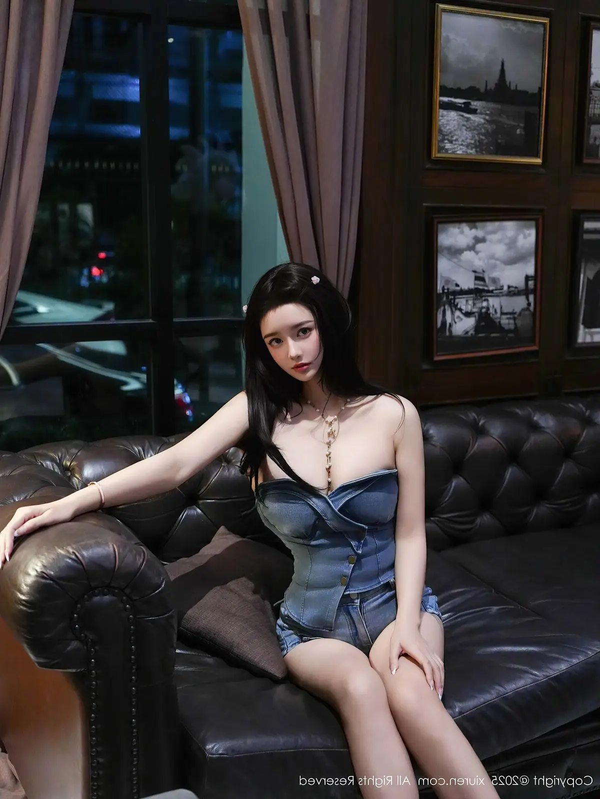 Discover the enchanting allure of Xiao Jiu from the IESS SXJ No.2144 collection. In this captivating image Chinese model Xiao Jiu relaxes gracefully in a leather armchair exuding confidence and charm. Her modern denim dress beautifully highlights her slender figure and elegant legs subtly showcased beneath sheer hosiery. Xiao Jiu's pensive gaze and poised posture create an irresistible magnetism perfectly blending traditional East Asian beauty with contemporary fashion. This portrayal embodies elegance sensuality and captivating grace promising to mesmerize every viewer. Explore the distinctive style and captivating presence that defines this iconic IESS series.#IESS #XiaoJiu #ChineseModel #DenimDress #FashionPortrait