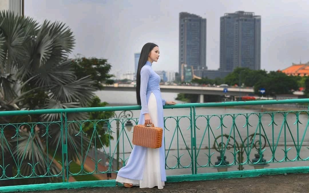 The XVG No.9 image captures a young woman with a pure and gentle beauty she possesses long flowing hair and fair skin her softly closed eyes exude peace and a dreamy contemplation as if lost in thought she delicately holds a bouquet of pristine white daisies symbolizing innocence and purity the lush green natural background accentuates her natural charm this is a tranquil and emotional moment offering viewers a sense of relaxation and serenity the beauty of this muse blends perfectly with the green space creating a perfect picture of harmony between humanity and nature her captivating beauty touches the soulXVG No.4: Graceful Vietnamese Ao Dai Beauty by the River - Captivating Traditional Elegance